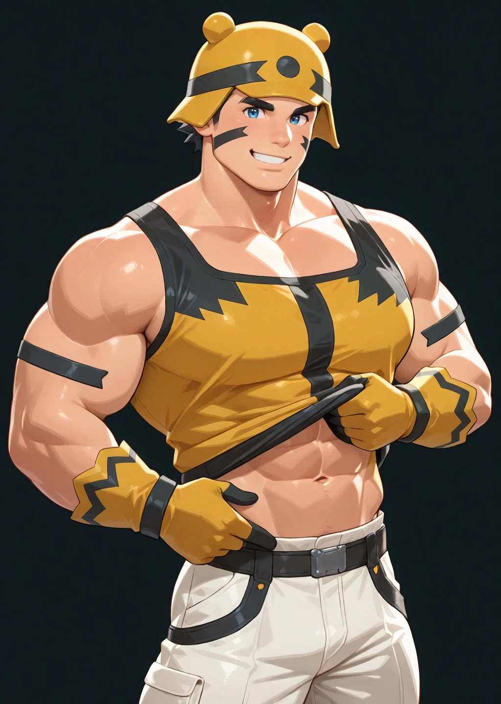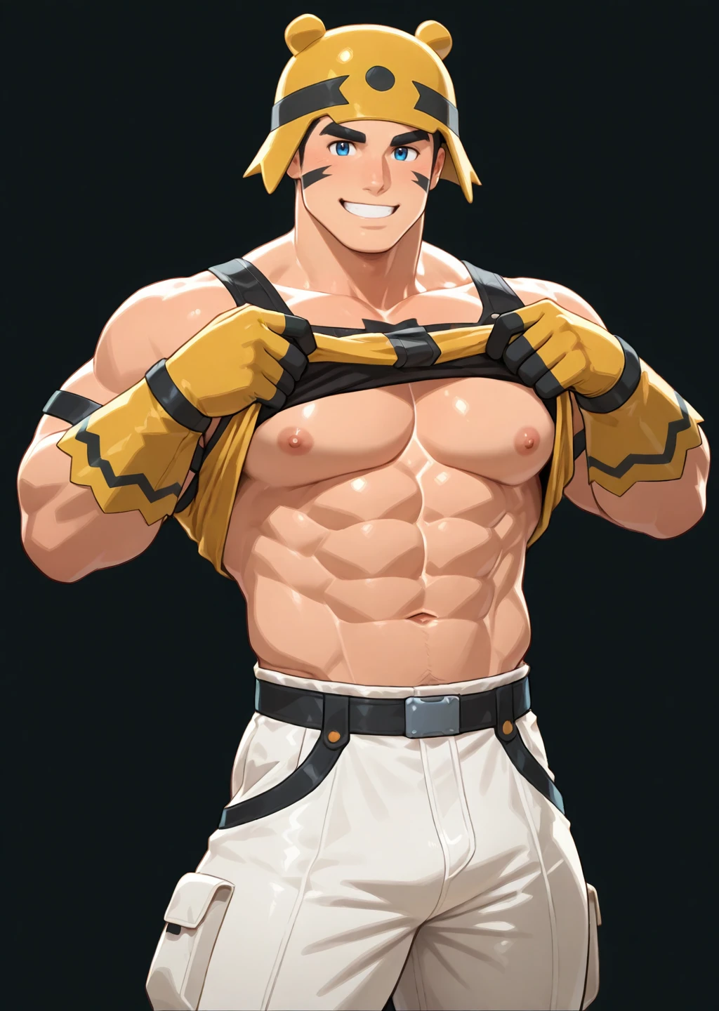 facepaint, muscular, bara, black background, cowboy shot, white long pants, blue eyes, looking at viewer, yellow gloves, gloves, glove, thick eyebrows. yellow tank top lift, black hair, armband, yellow headwear, teasing viewer, smiles, showing abs