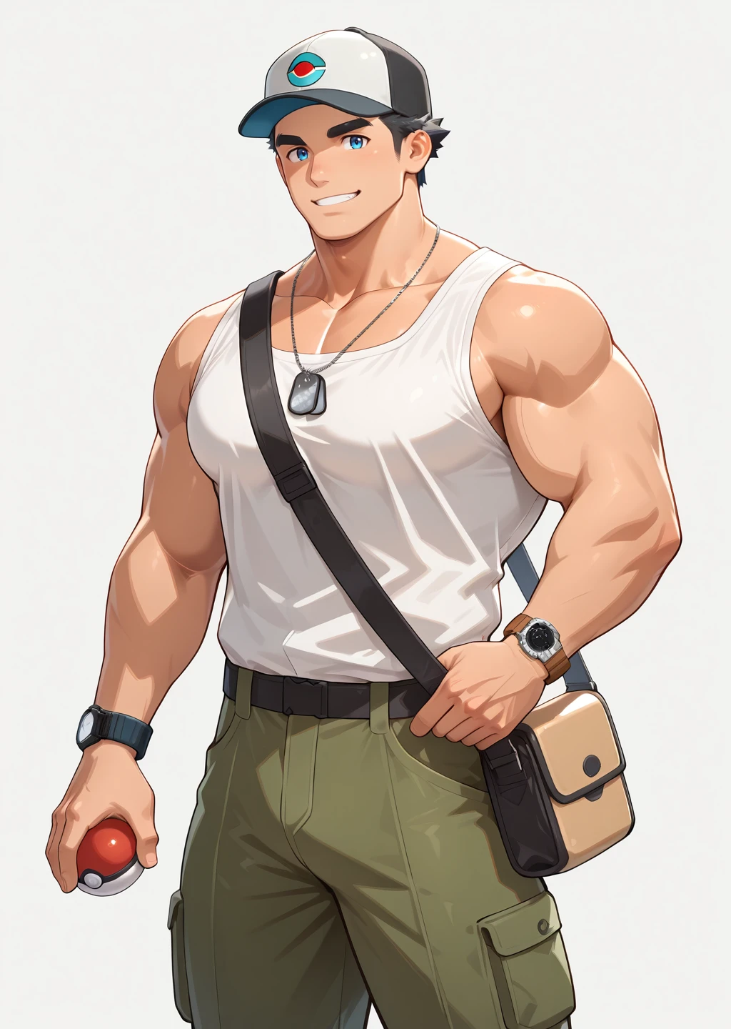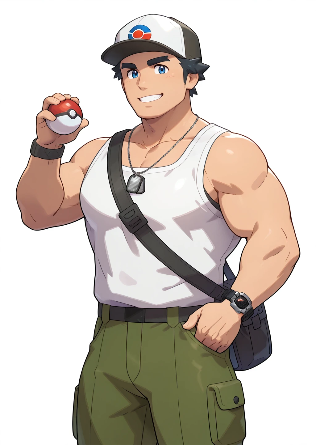 male focus, voldon, muscular, bara, white tank top, dog tags, blue eyes, thick eyebrows, black hair, short hair, spiked hair, white tank top, olive green, long pants, smiles, wristwatch, holding pokeball (basic), pokeball (basic)