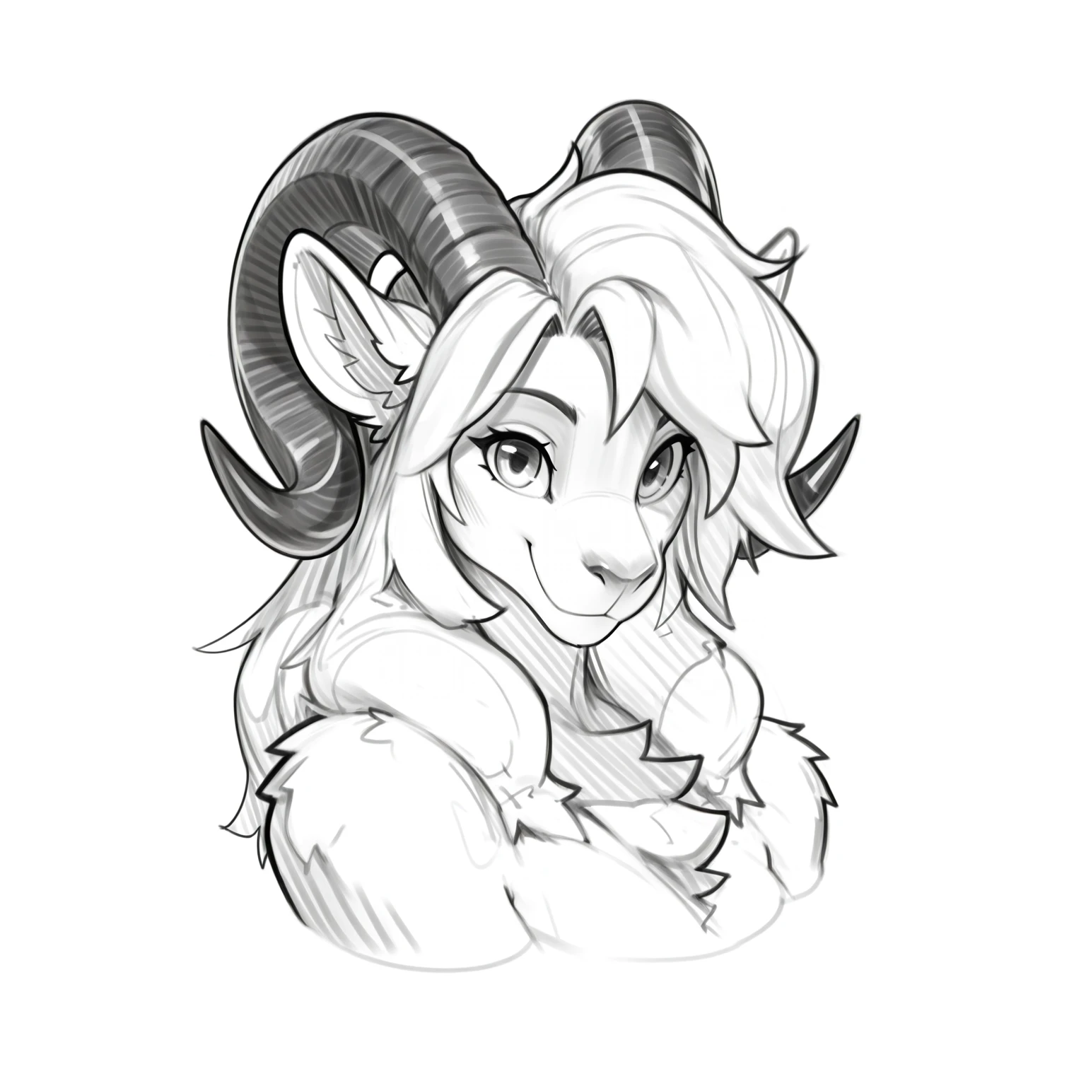 masterpiece, best quality, amazing quality, very aesthetic, high resolution, ultra-detailed, absurdres, newest, scenery, depth of field, scenery, volumetric lighting, by sinsquared, lineart, monochrome, greyscale, sketch, white background, simple background, furry, furry female, anthro, animal ears, animal nose, snout, bighorn sheep, bovid, caprine, sheep, white fur, body fur, curved horn, caprine horn, long hair, 1girl, solo, portrait, looking at viewer, smile, closed mouth, upper body, cropped shoulders, cropped torso, nudePrompt (Negative)