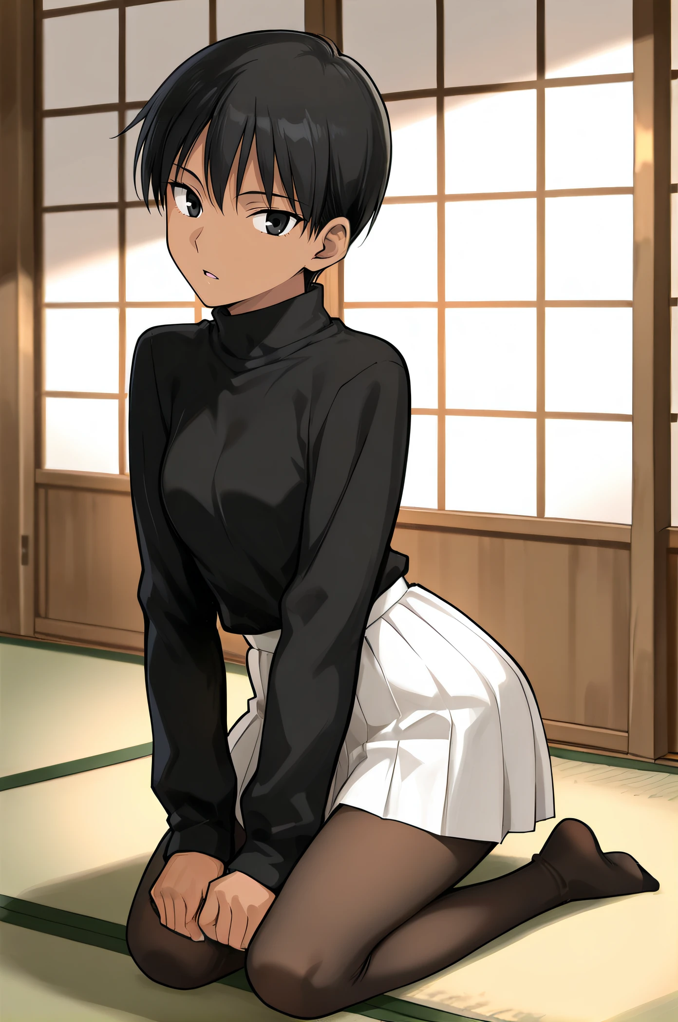 black sweater, turtleneck, white pleated skirt, brown pantyhose