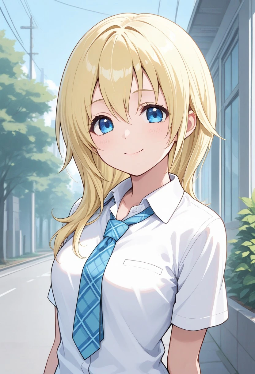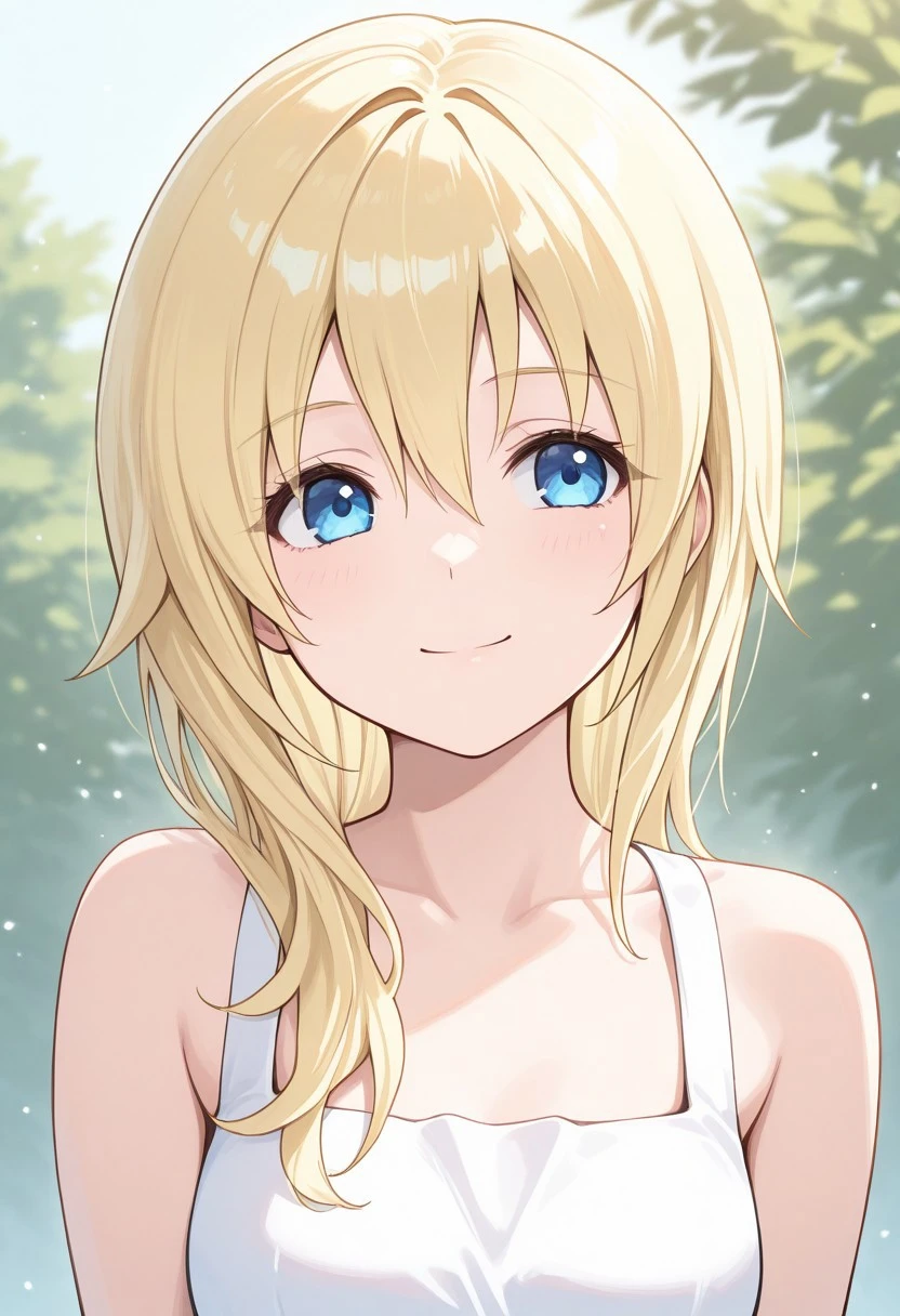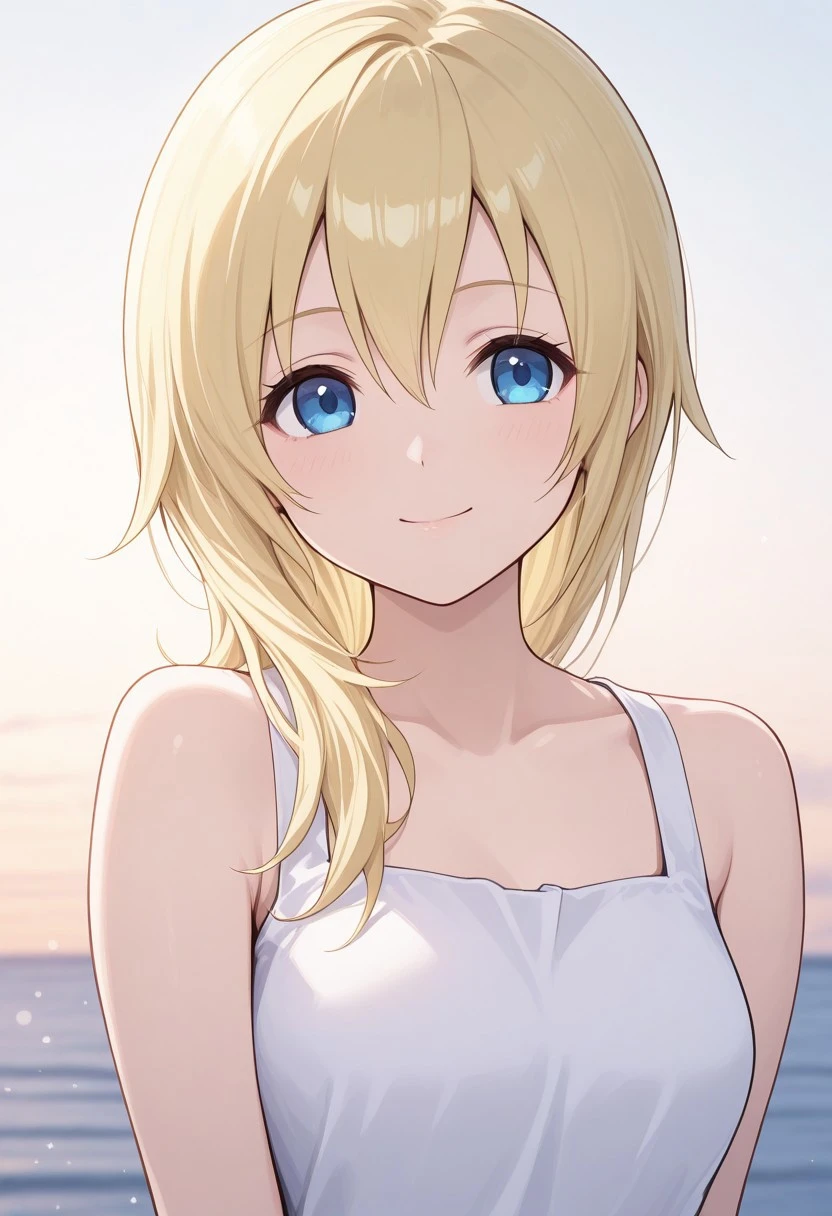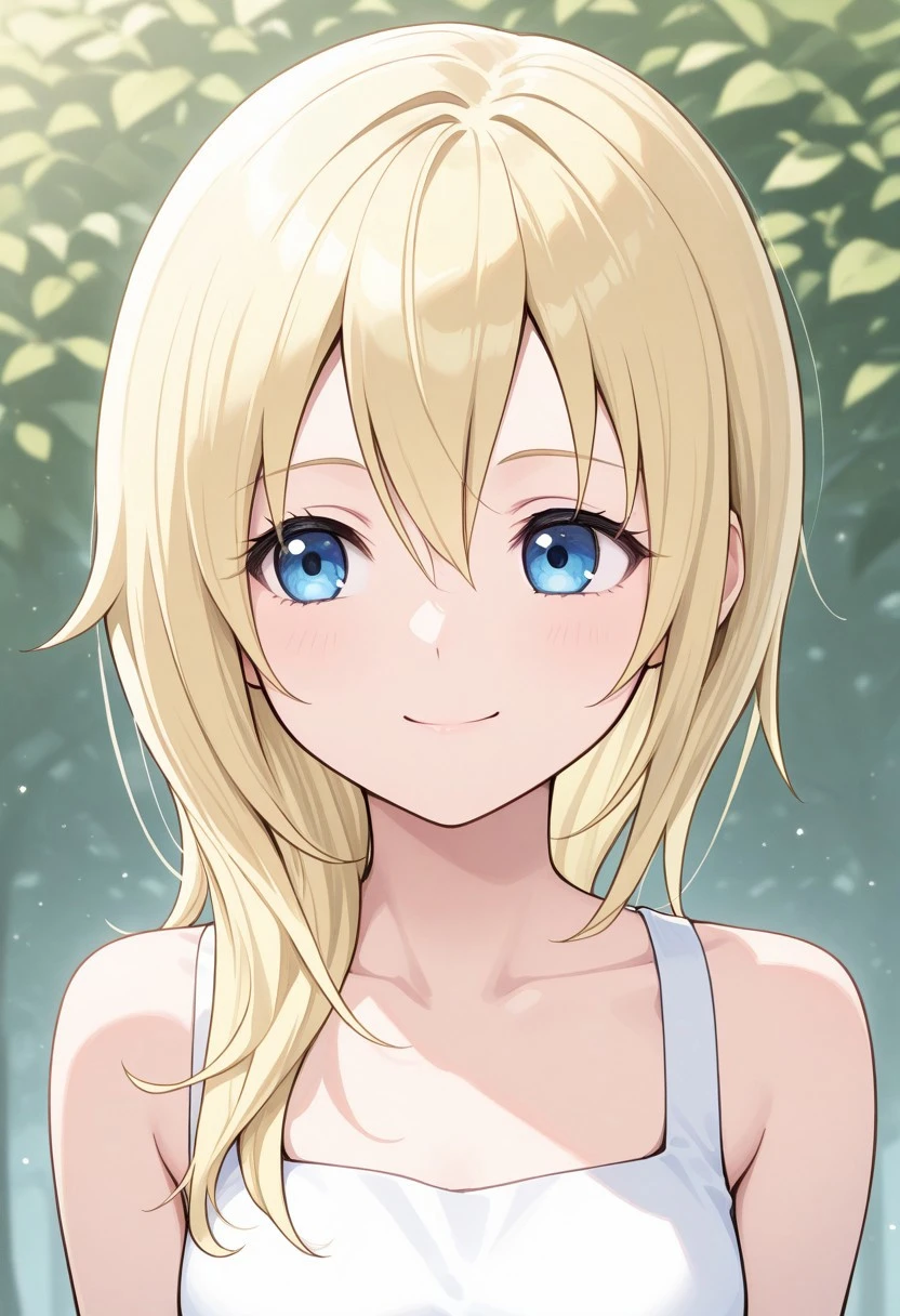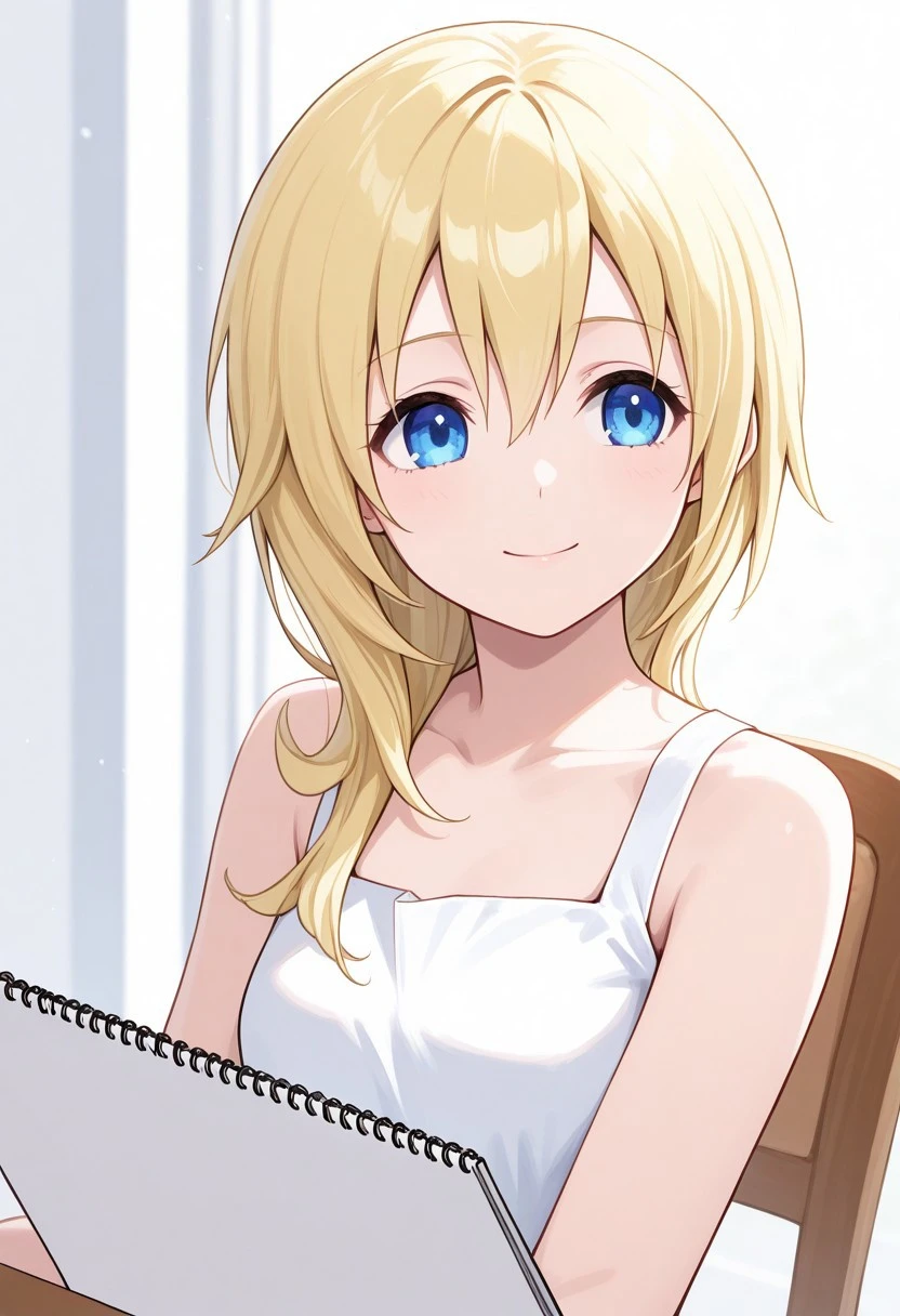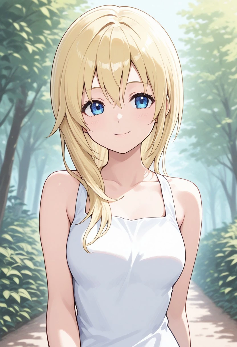 namine, 1girl, solo, blue eyes, blonde hair, long hair, hair between eyes, dress, white dress, bare shoulders, sandals,