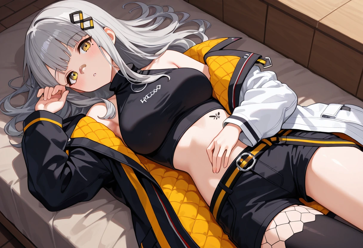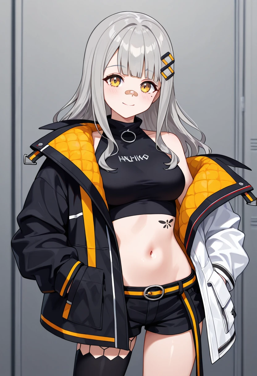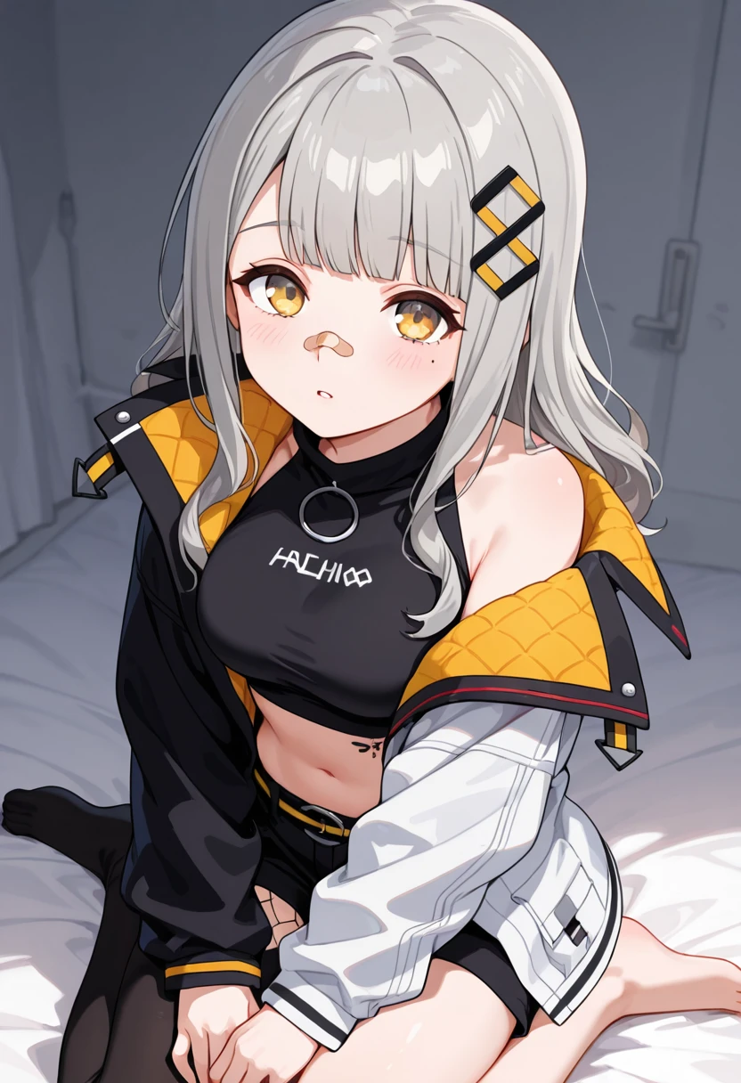 HACHI_1ST,yellow eyes,bandaid on face,grey hair,hair ornament,long hair,blunt bangs,mole under eye