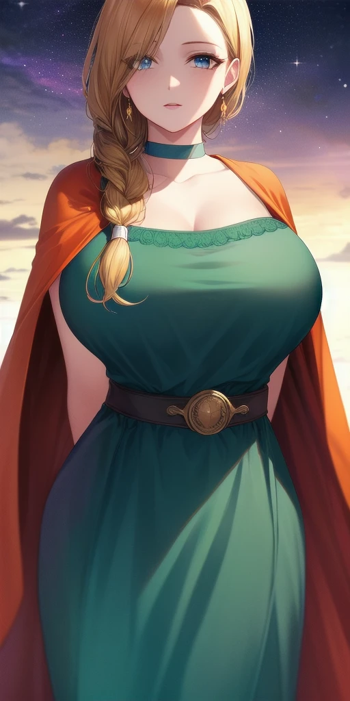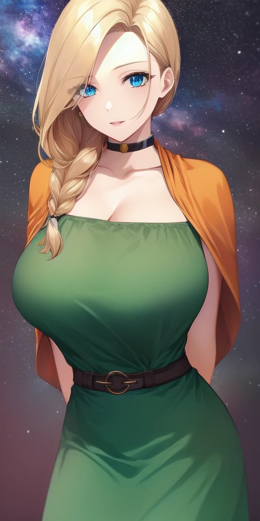 green_strapless_short_dress_orange_cape_belt_choker: Her default outfit.