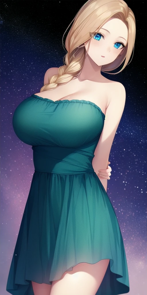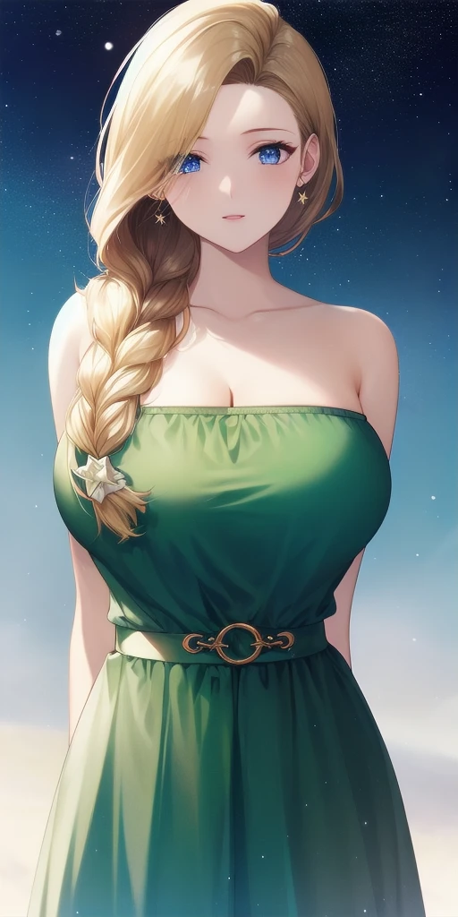 green_strapless_short_dress: Her dress sans cape.
