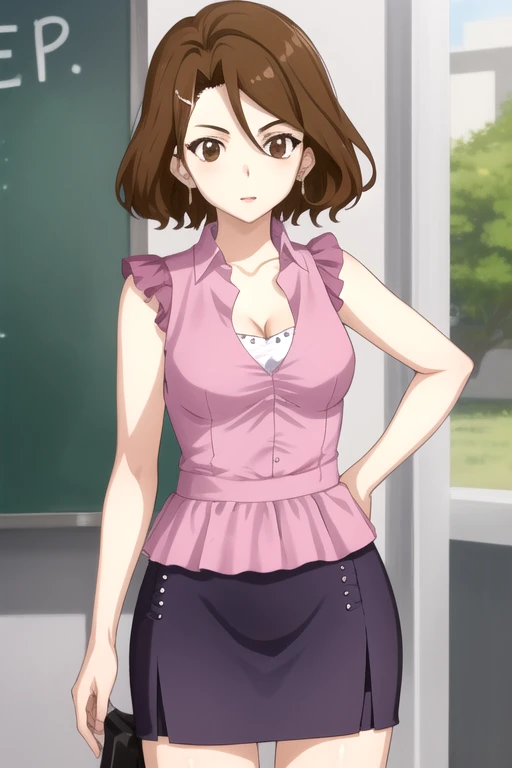 MitsukiIchijo, 1girl, solo, short hair, miniskirt, medium breasts, brown hair, pink shirt, cleavage, brown eyes, sleeveless, miniskirt, pencil skirt, purple skirt