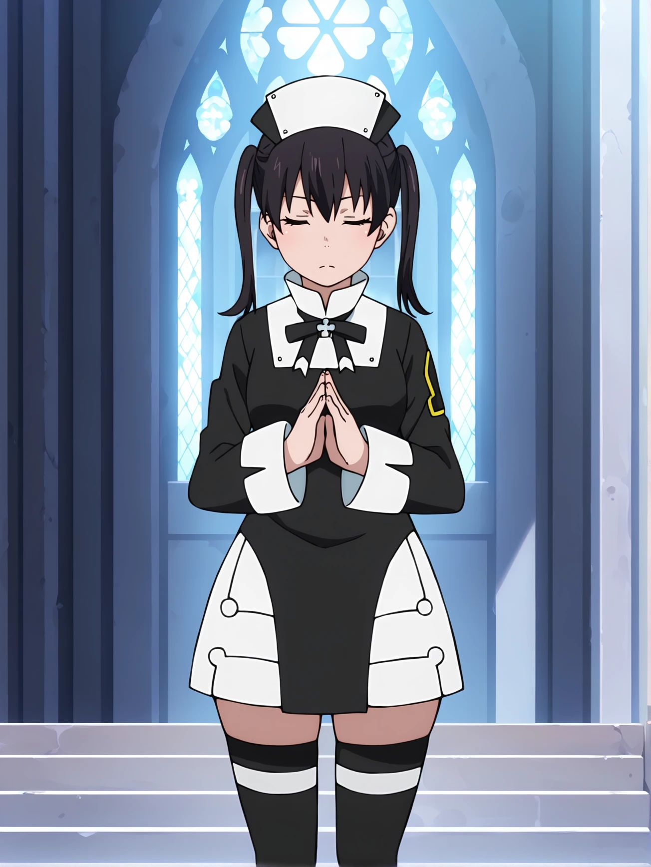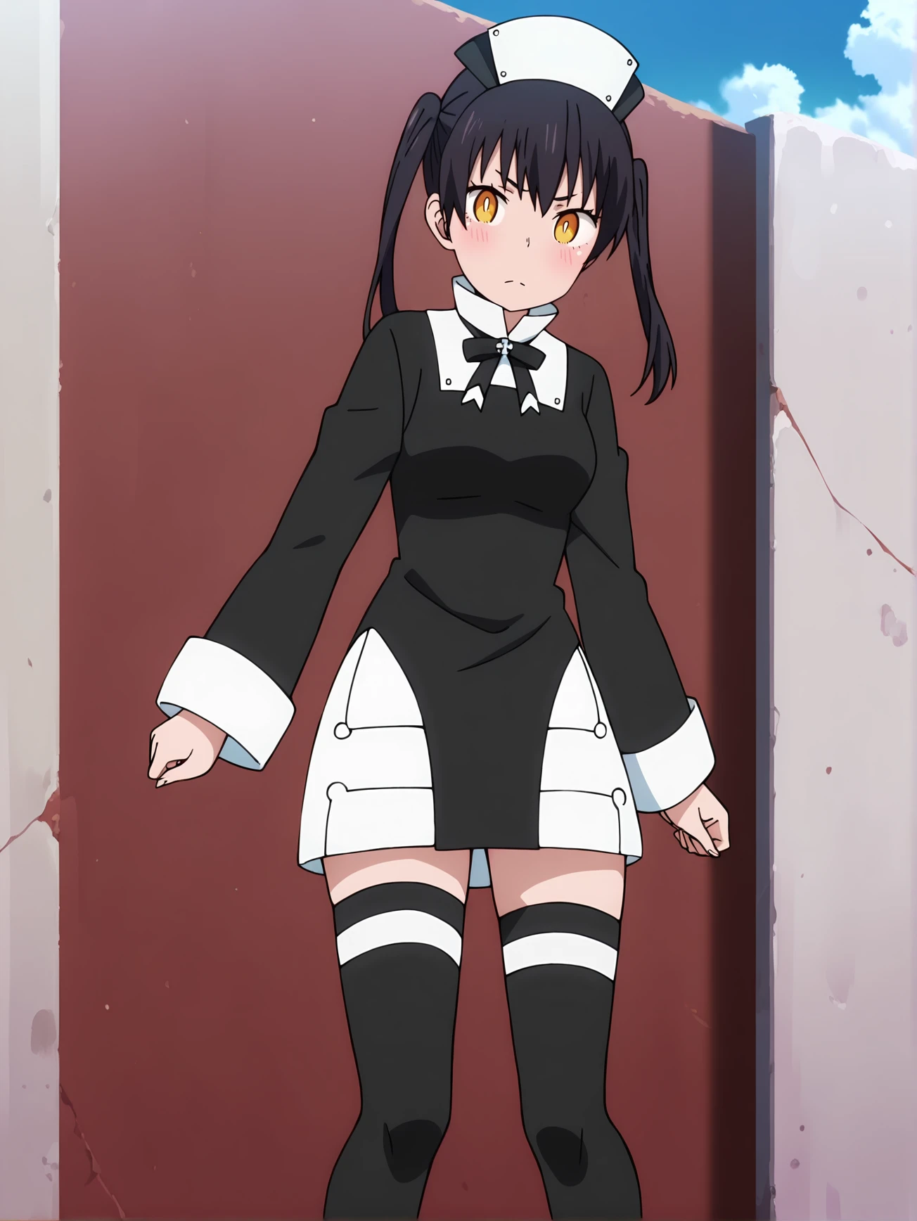 tamaki, 1girl, solo, yellow eyes, black hair twin tails, black headwear, black nun uniform, black ribbon, unit 1 yellow insignia, short white skirt, black thighhighs, black footwear