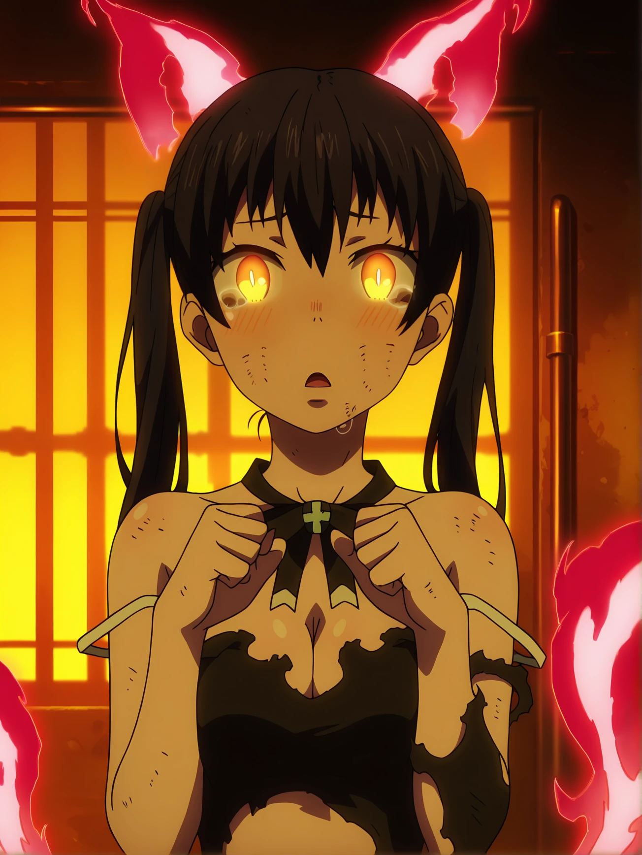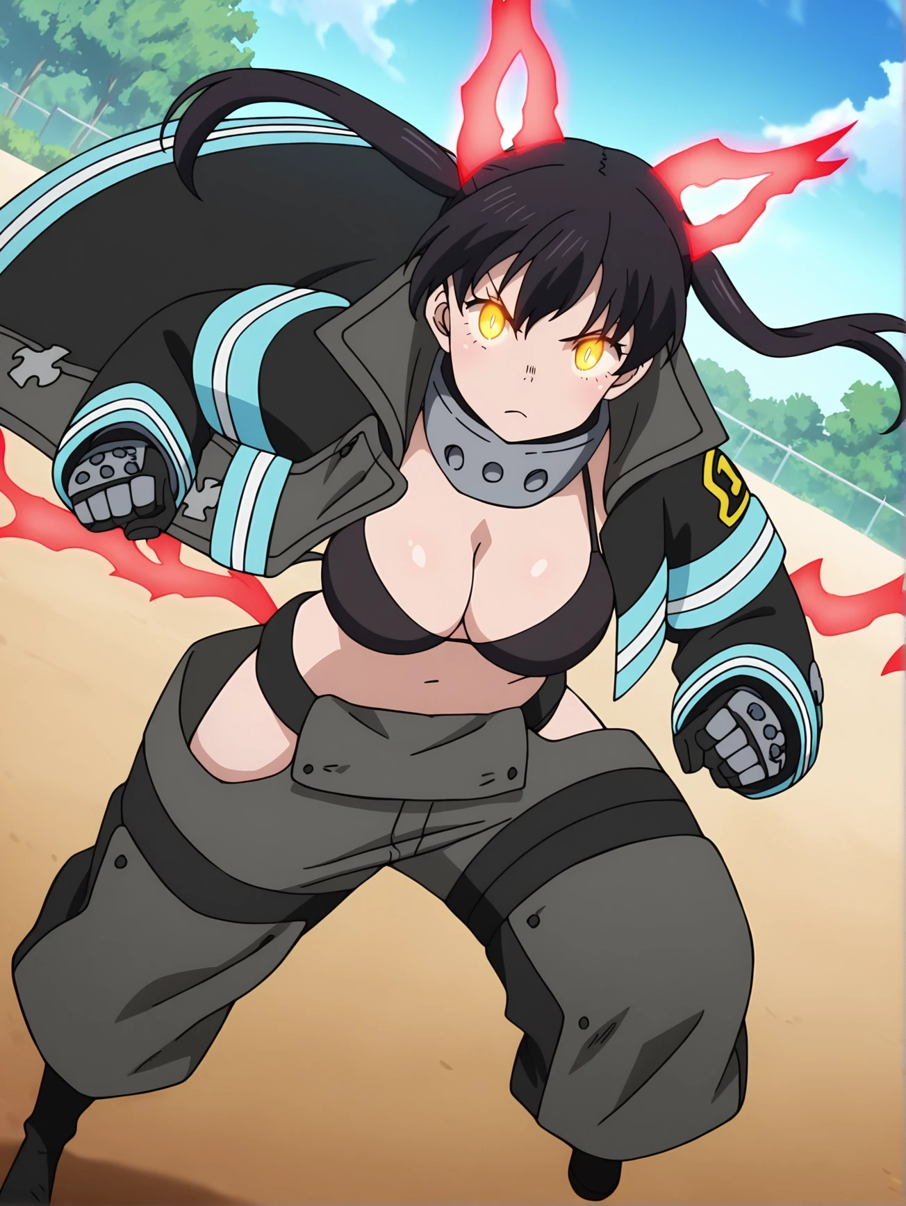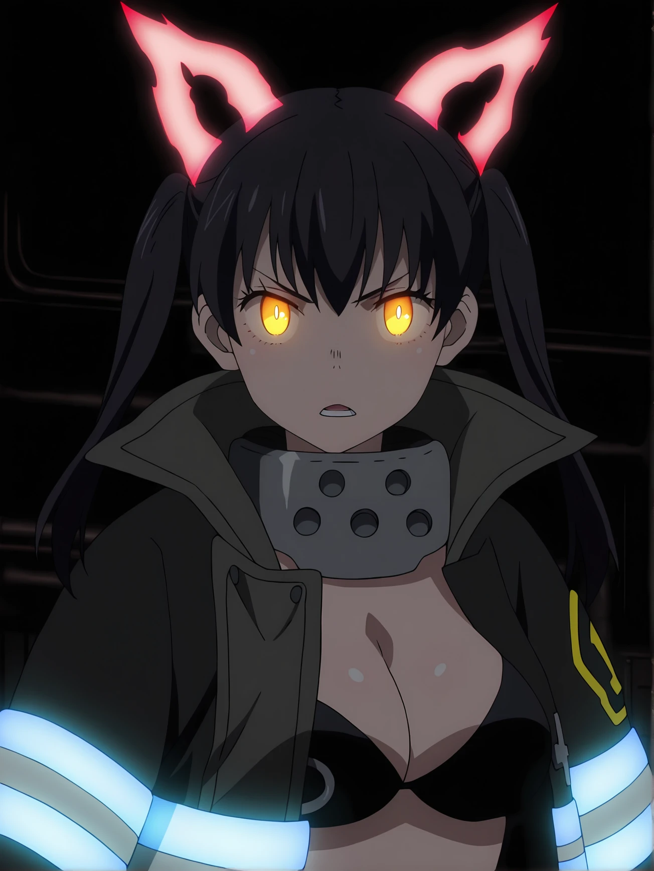 tamaki, 1girl, solo, glowing yellow eyes, black hair twin tails, black open fireman uniform, metal choker, glowing blue stripes, black bra, baggy pants, black boots, red energy cat ears, red energy cat tails