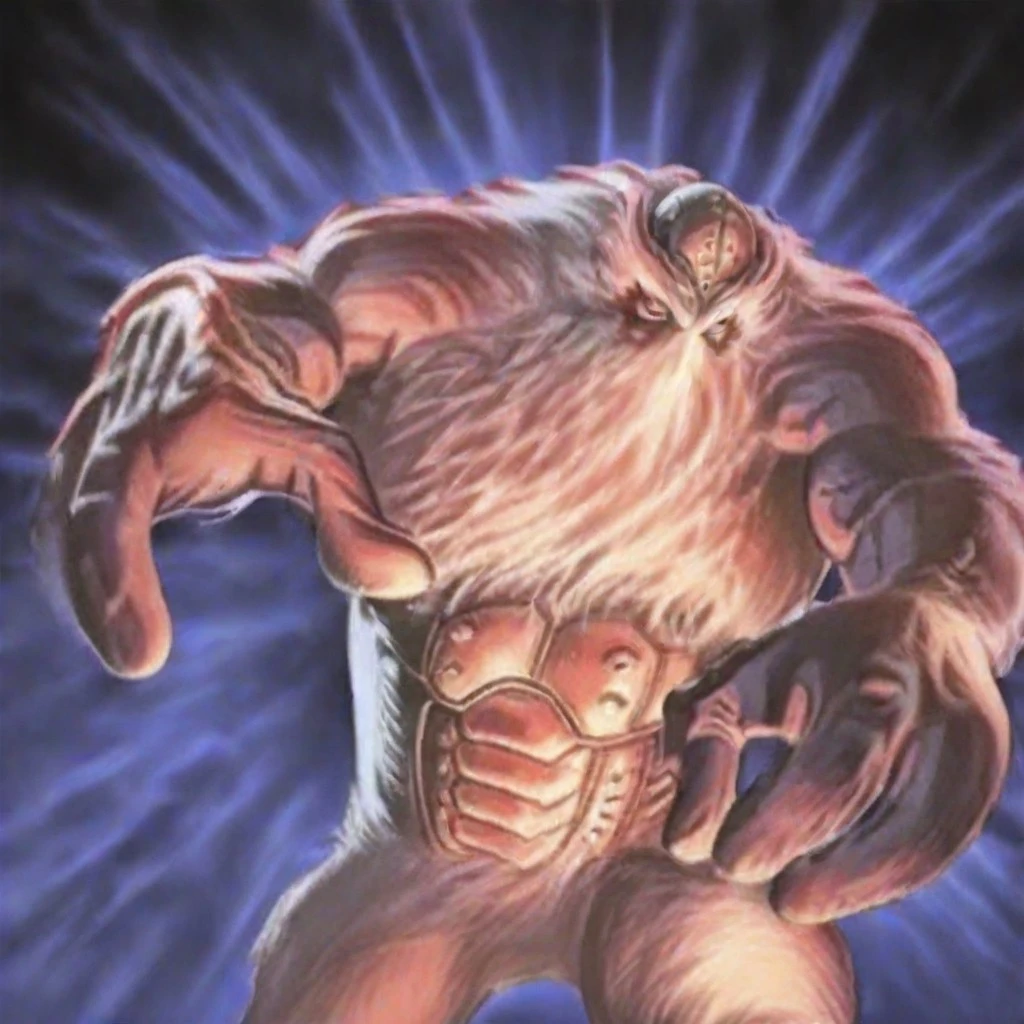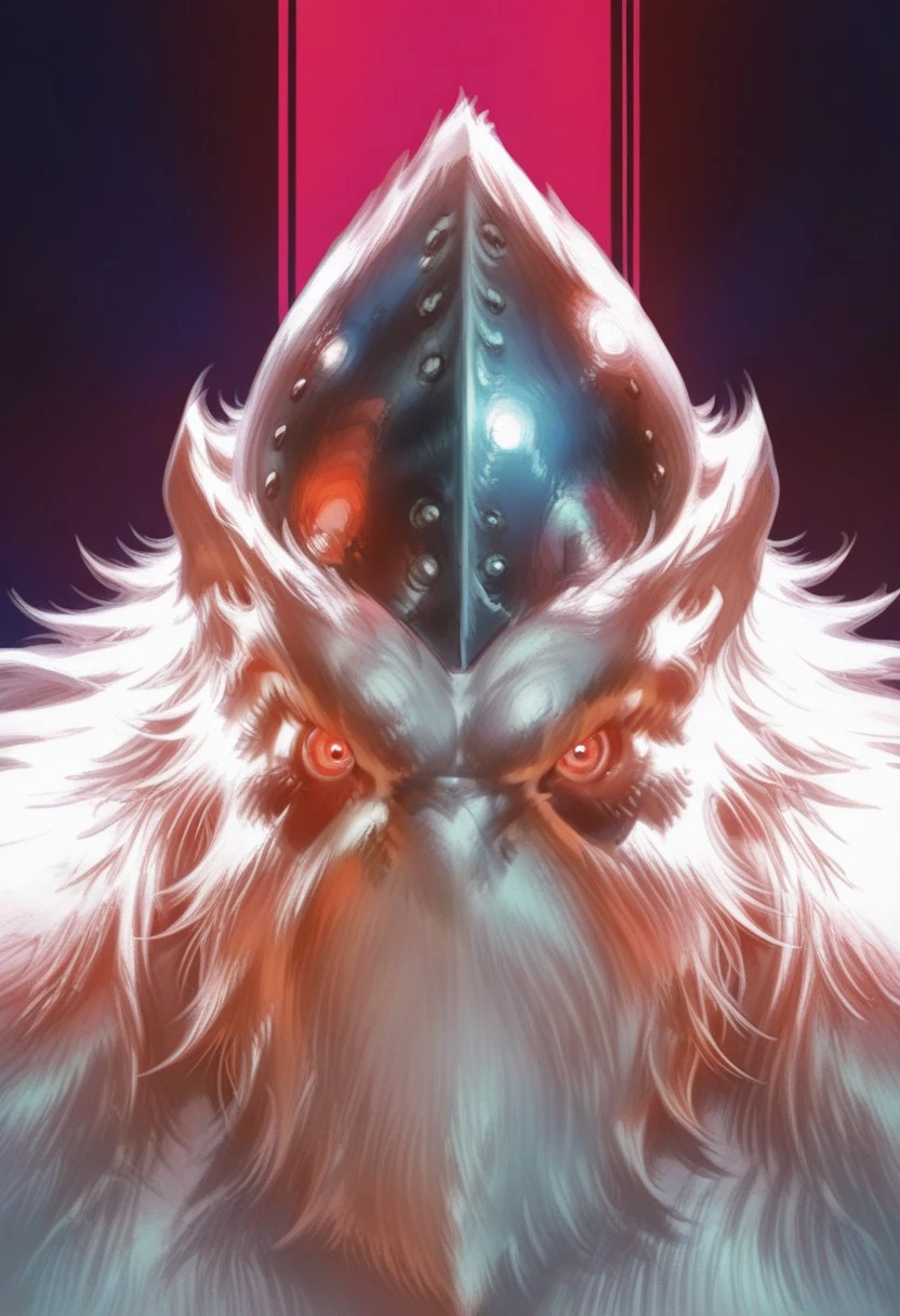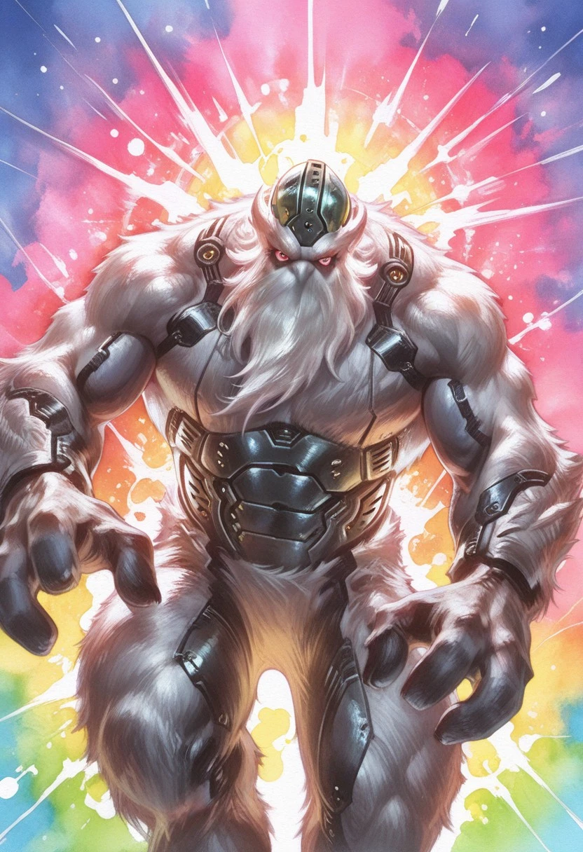 MARVELxemnu, monster male, long white beard, white fur, red eyes, three fingers, metallic head, mechanical torso,
