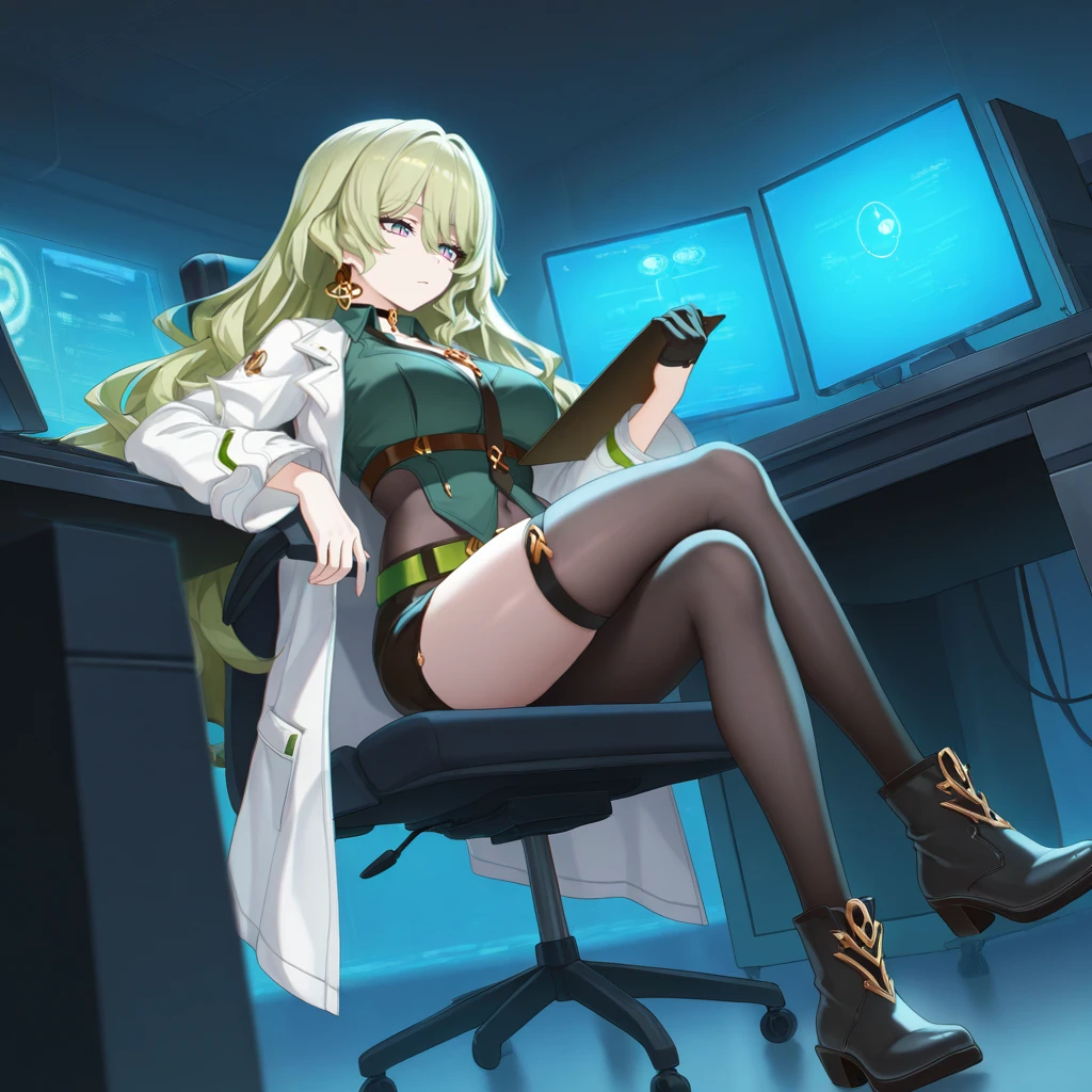 Mb_Str, alt collared shirt, single earring, green shirt, striped shirt, black necktie, pantyhose, brown pantyhose, black pencil skirt, labcoat, white labcoat,Story Lab Coat Outfit: