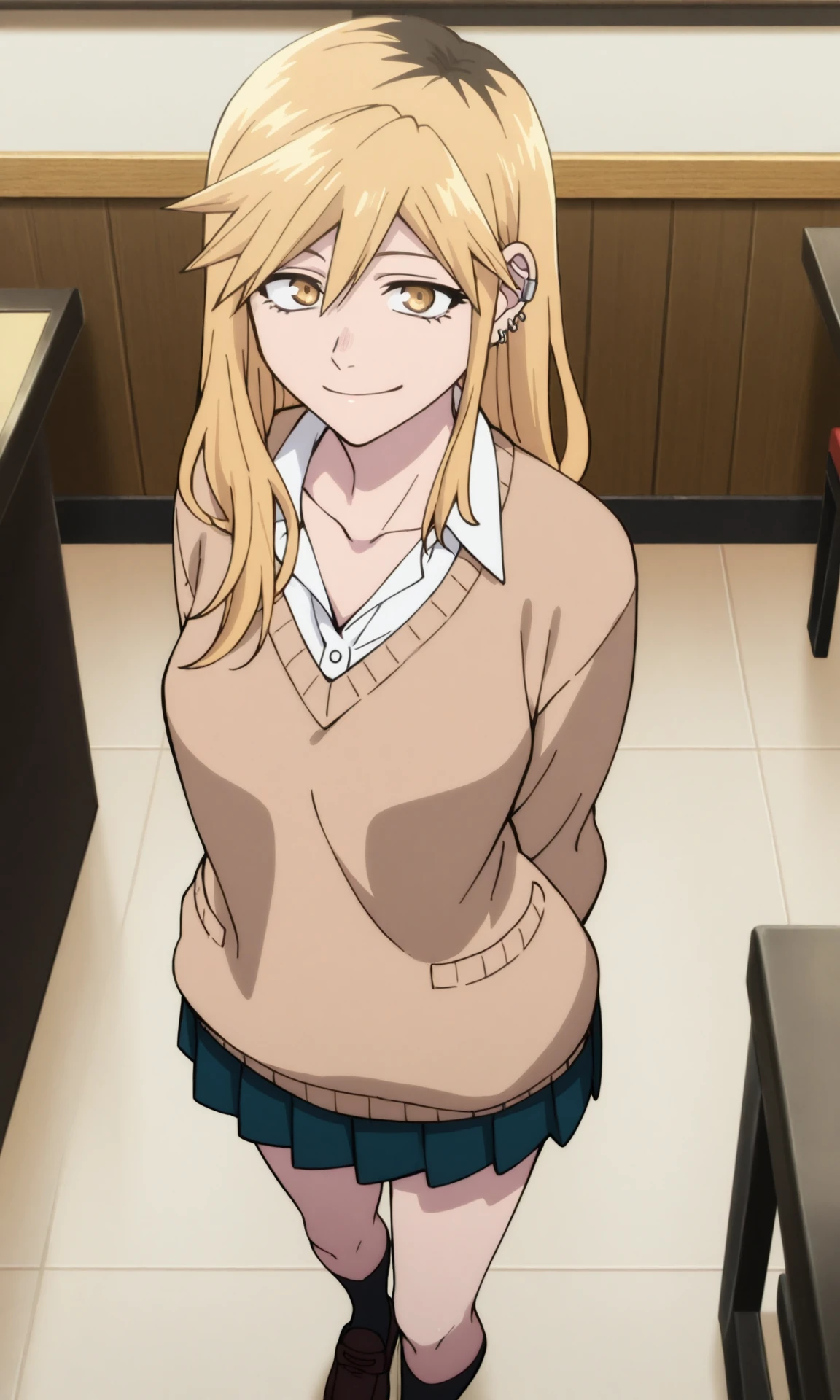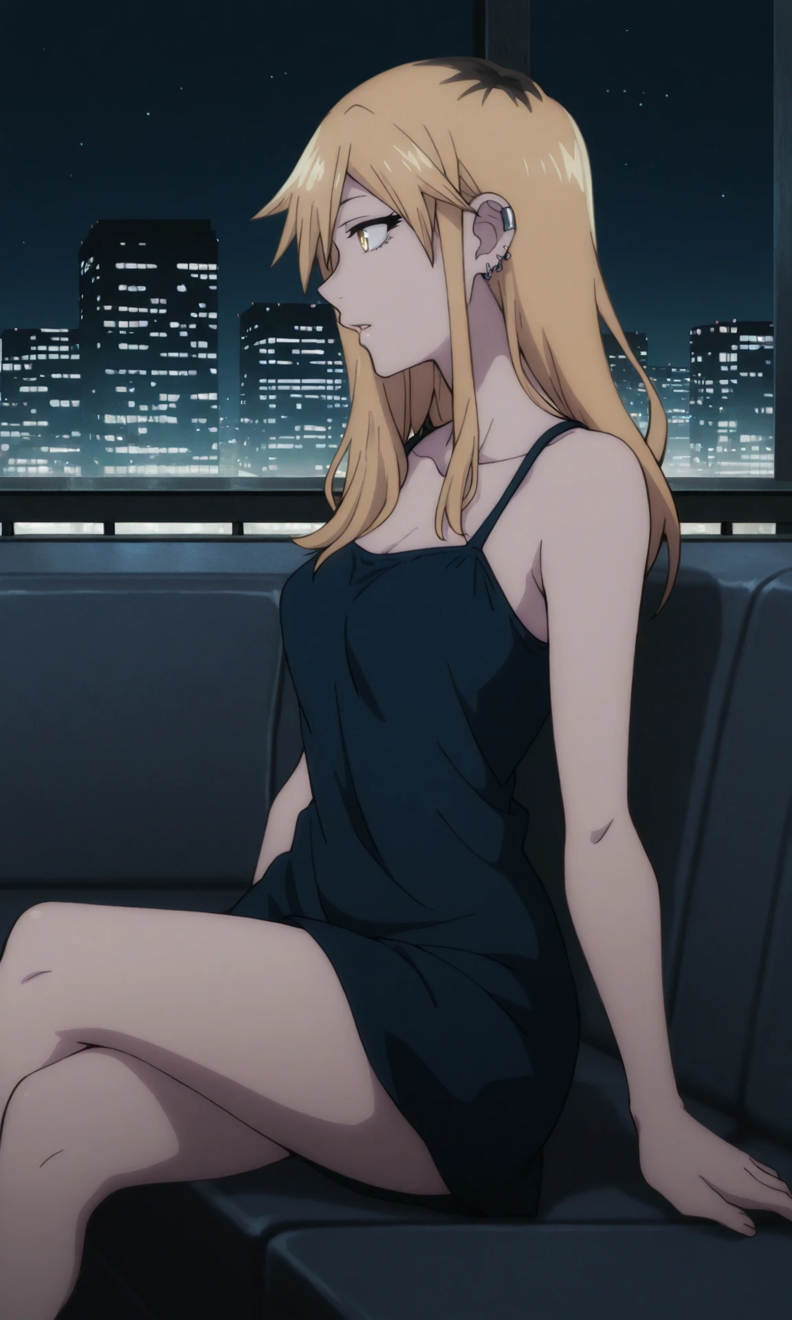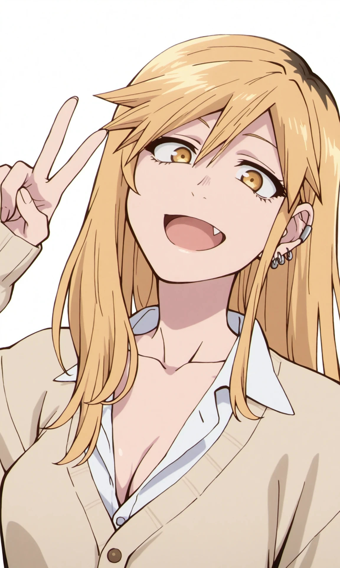 serikikiyoumv, 1girl, solo, yellow eyes, long hair, blonde hair, two-tone hair, ear piercing, earrings,