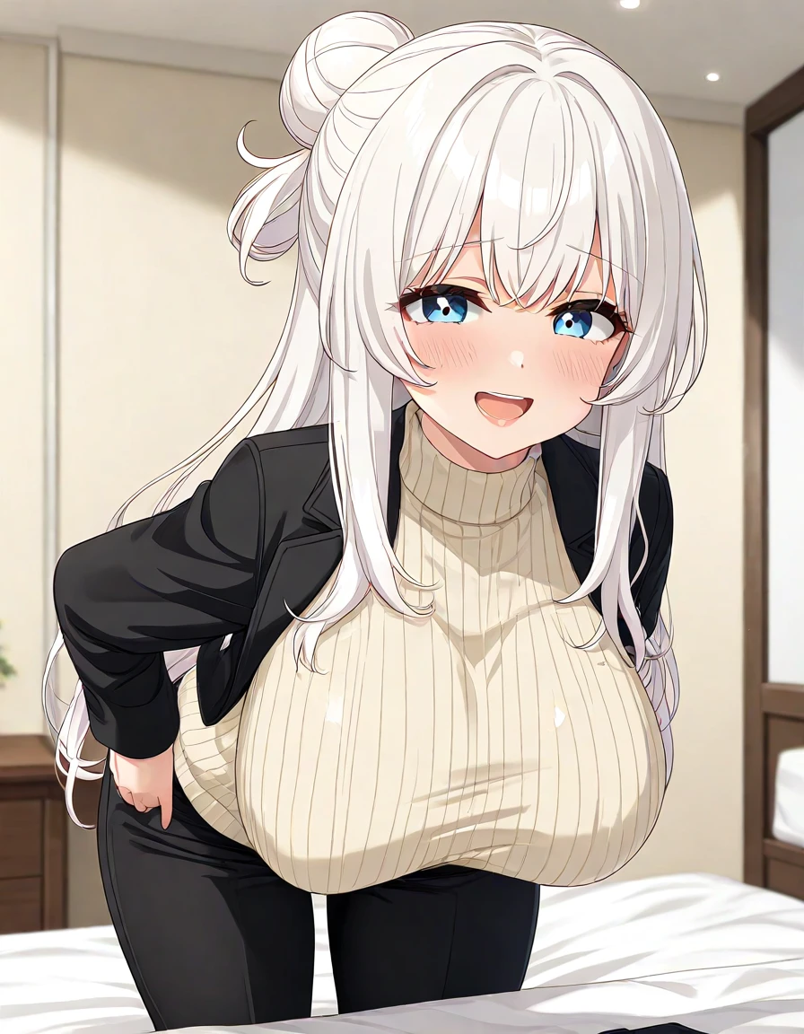 Recommend Prompt:Michiru Aijou, large breasts, beautiful woman, blue eyes, white hair, long hair,