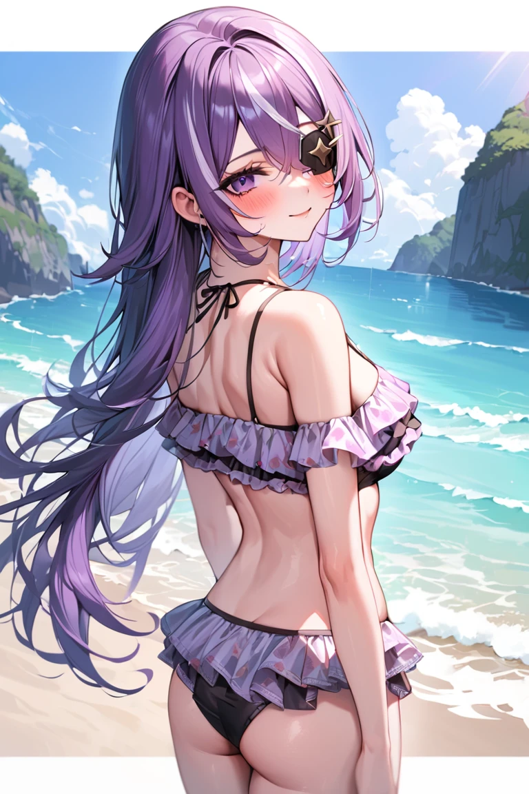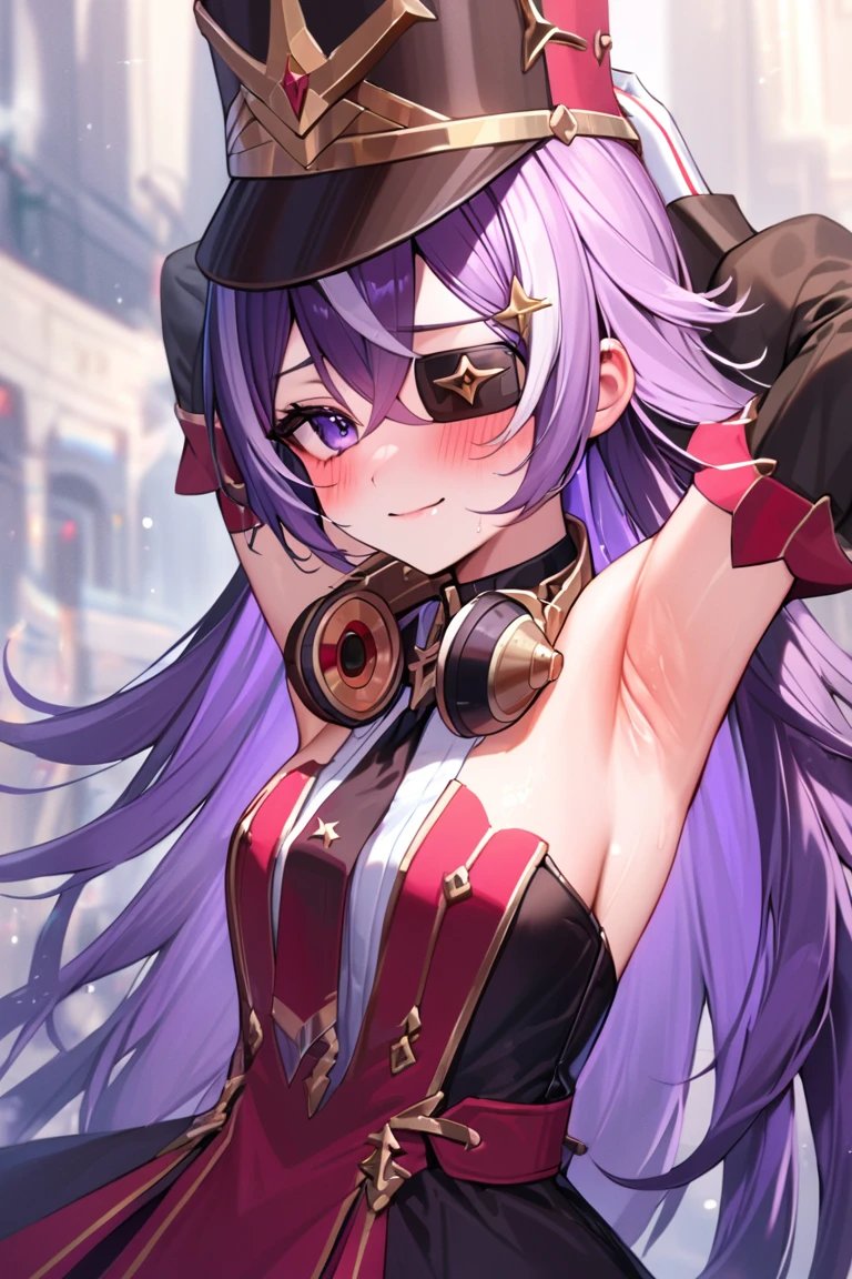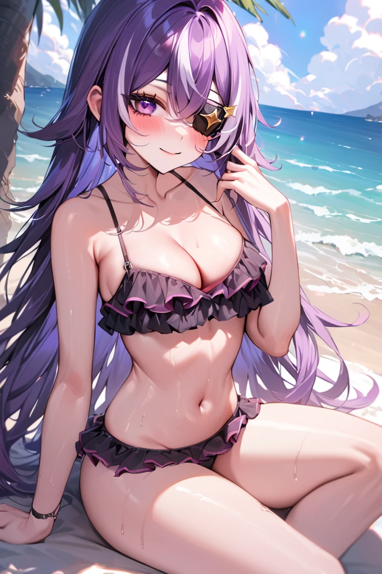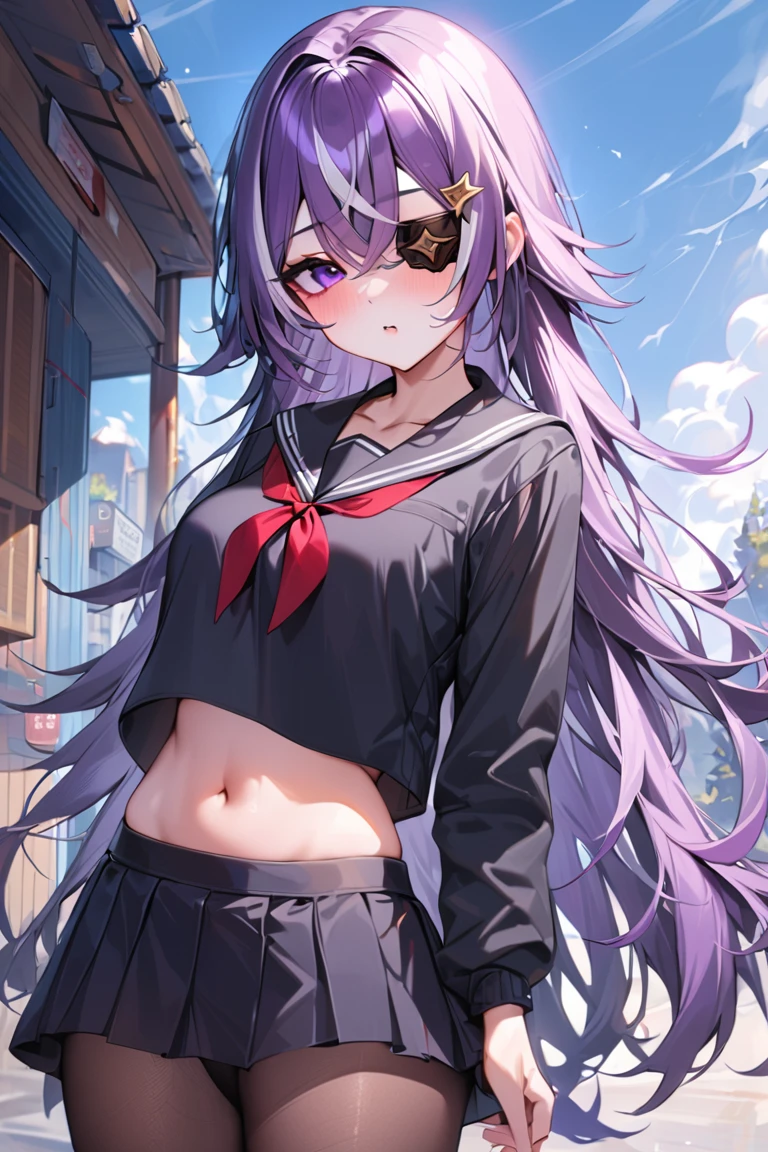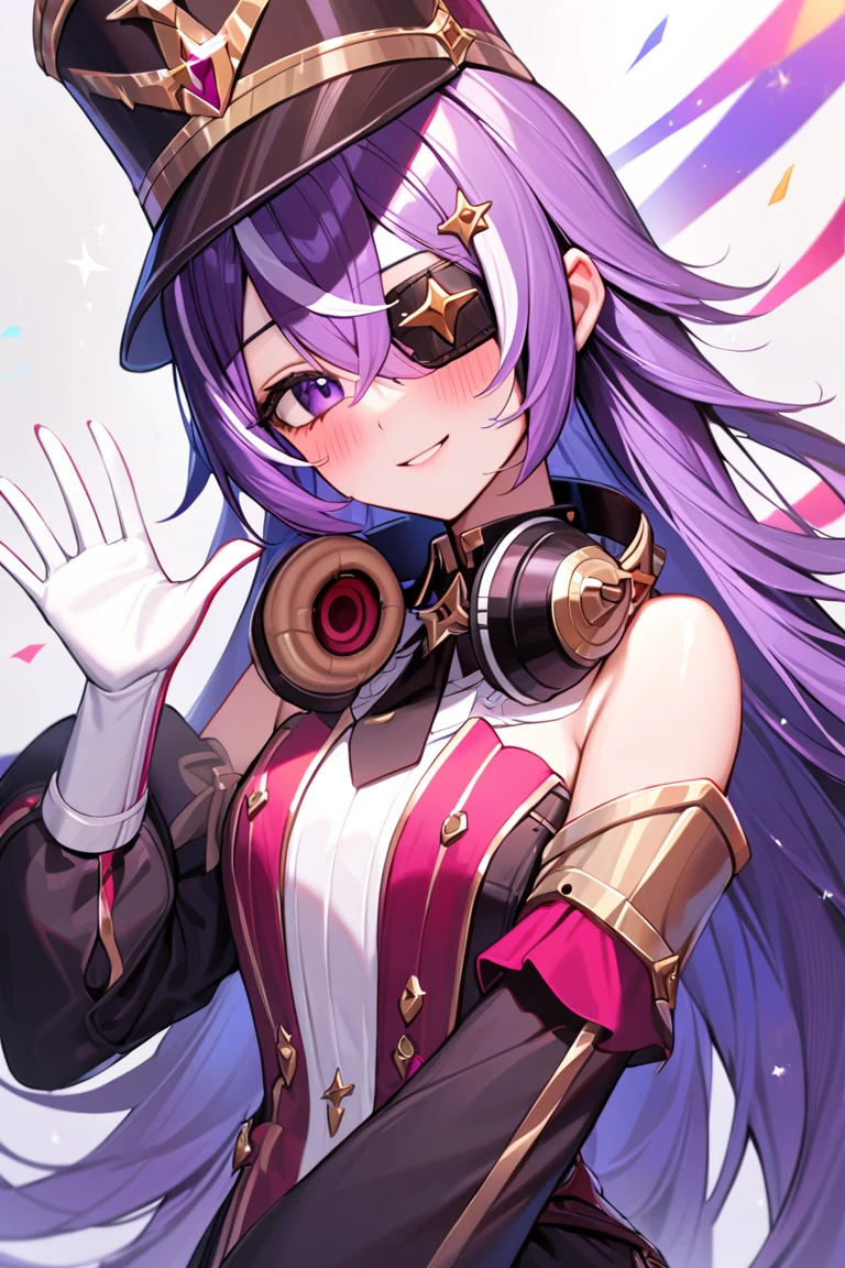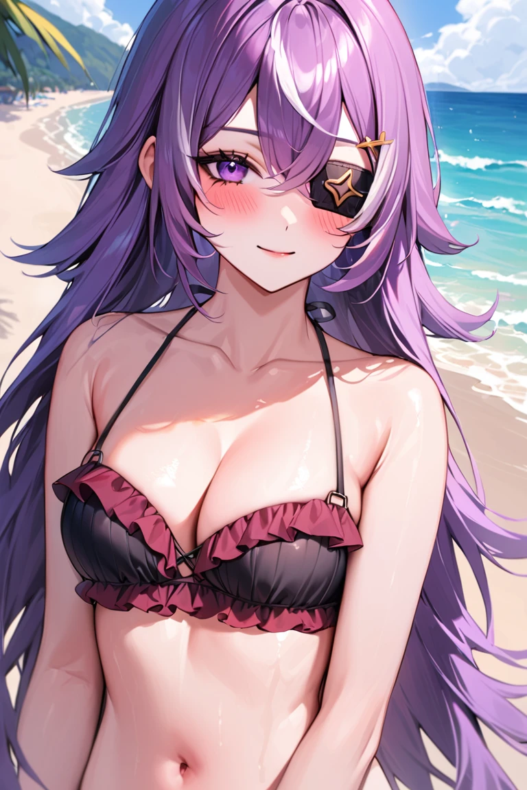 chevreuseexp, purple hair, white streaks, long hair, Purple eyes, eye patch, hair clip, star clip,