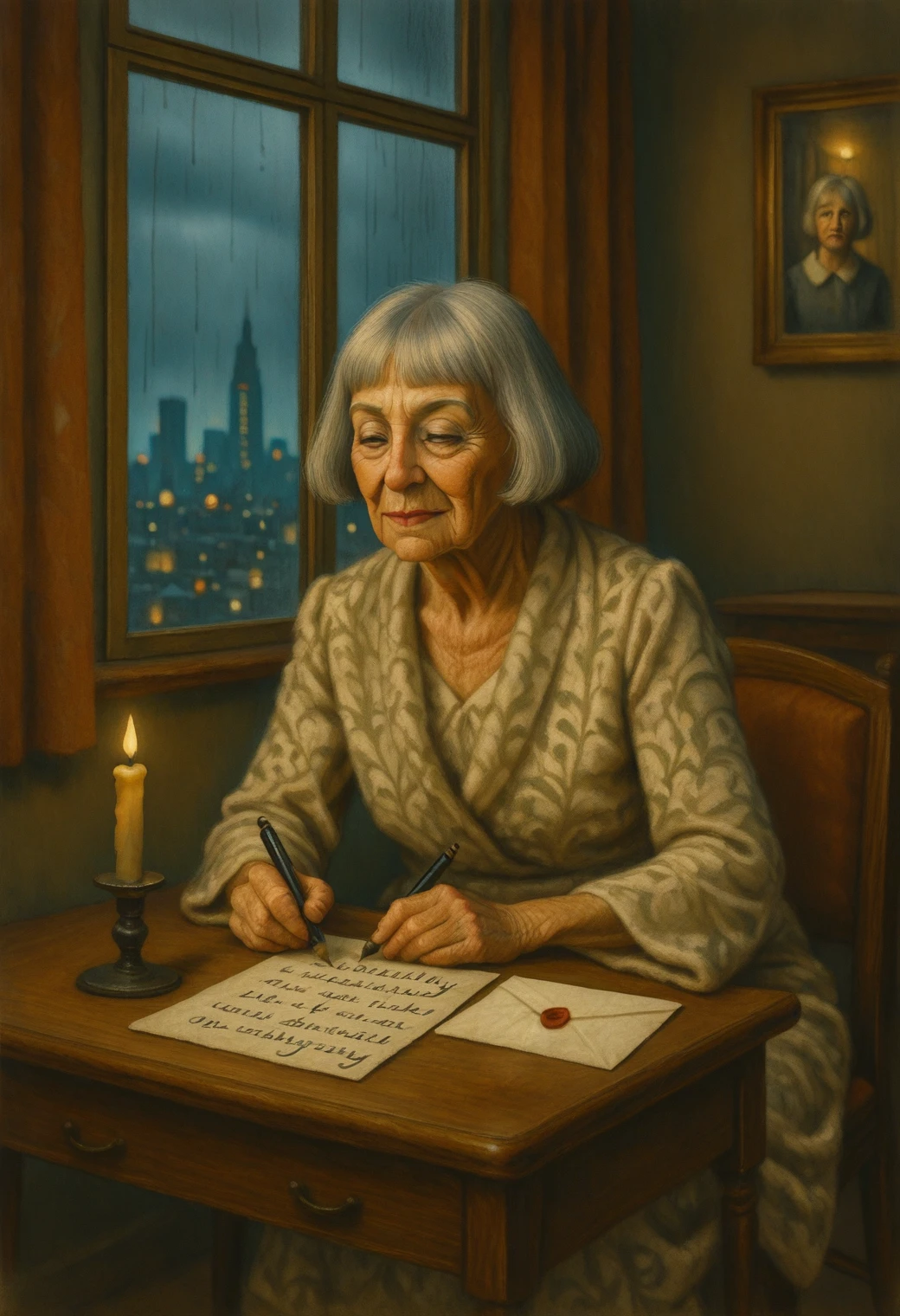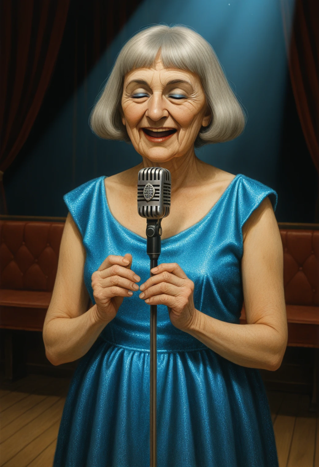 Use this LoRA when you want someone with history in their face. She works beautifully in editorial compositions, fashion-inspired shots, cabaret stages, vintage domestic interiors, and quiet cinematic moments.