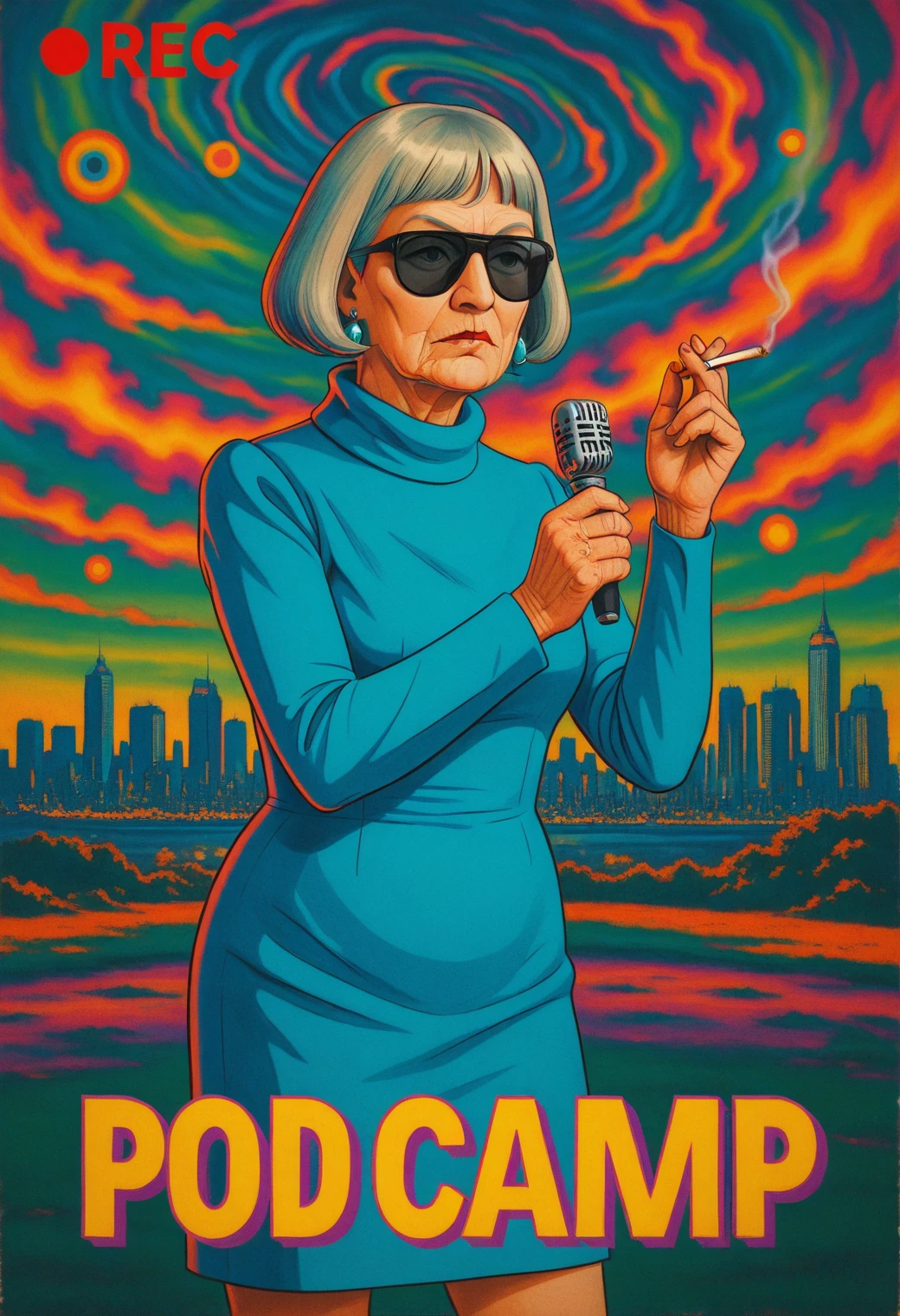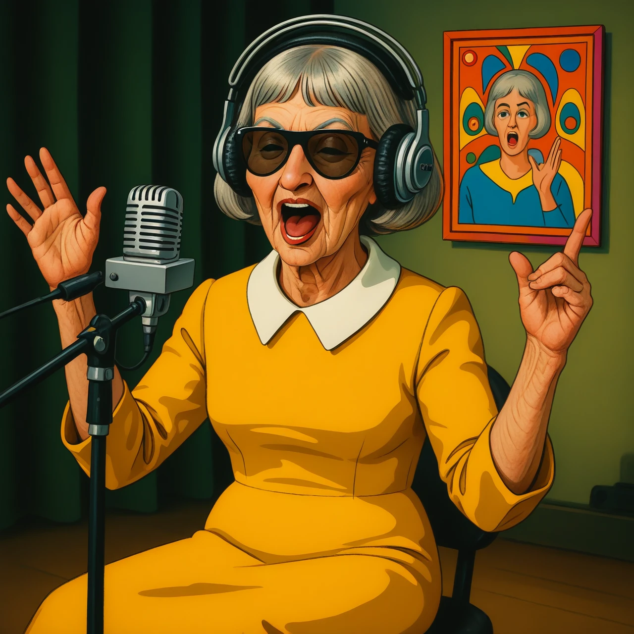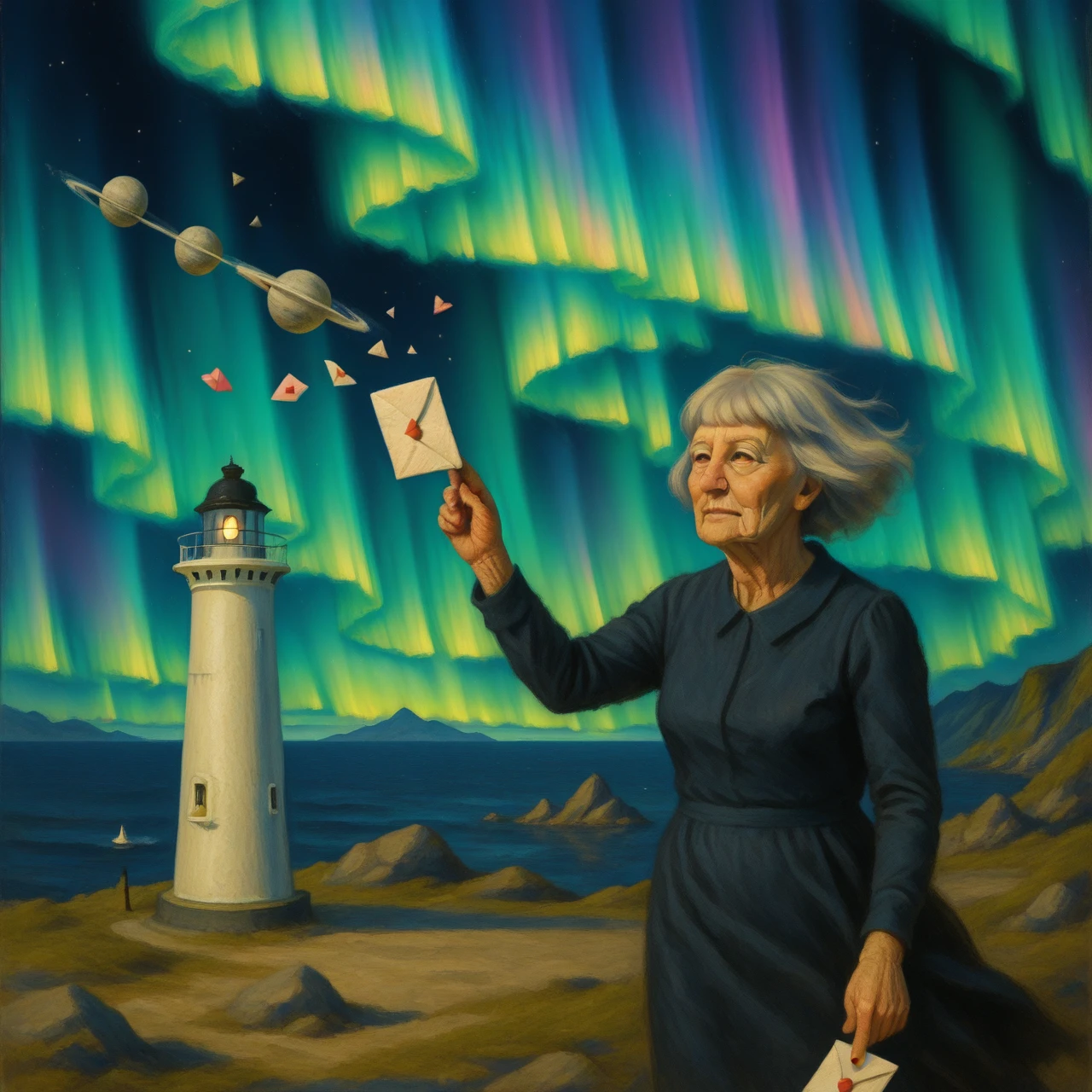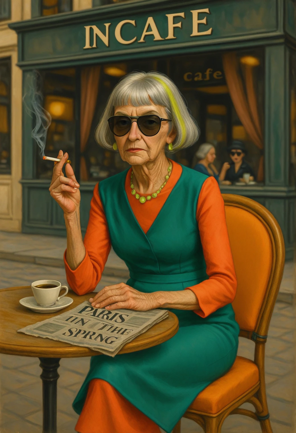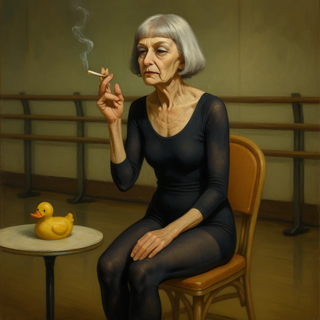 Francine (fr4nc1n3, elderly French woman), a character based on an older French woman with a sharp sense of style, dry wit, and presence that lingers. She has a silver blunt bob, heavy blue eyeshadow on the upper lids, and a body shaped by time, not fantasy, well SOME fantasy. This LoRA is trained for painterly realism and stylized vintage scenes, with a focus on aging ???????, expressive posture, and midcentury aesthetics.