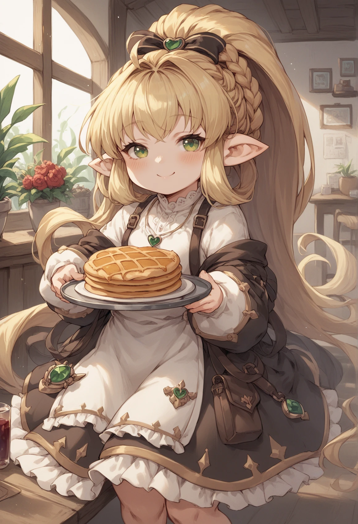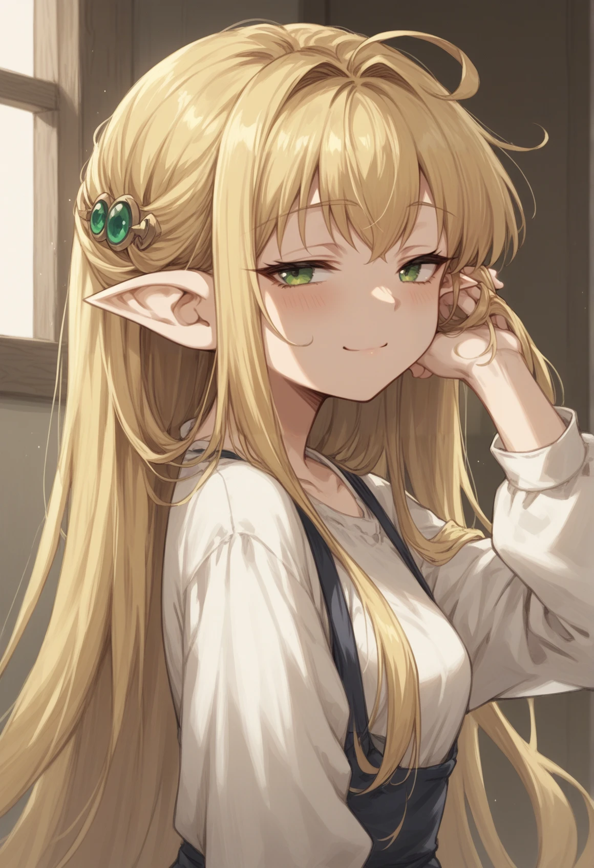 Ok, here is my shot, There are two variants1; Absurdly Long Hair, blonde hair, green eyes, pointy ears, shortstack, dress, sleeveless, brown shawl, bracelets + whatever context you want2; Absurdly Long Hair, blonde hair, green eyes, pointy ears, shortstack, dress, long sleeves, medallion, braid, ponytail, hair ribbon + whatever context you wantIf you want her more slender and less...hobbit, then do not include shortstack (I put a comparison on the last two images)Description