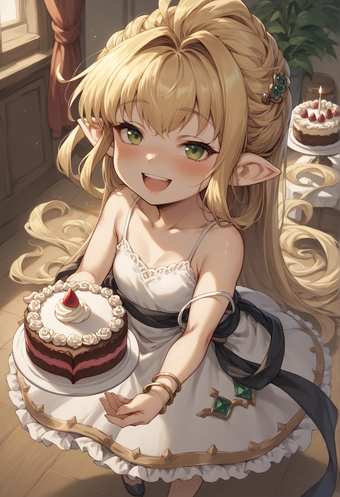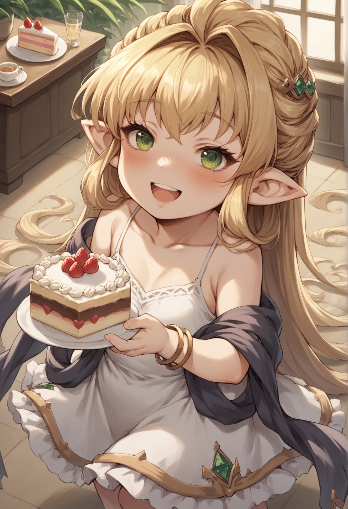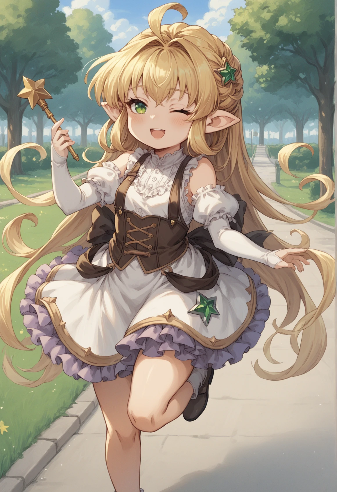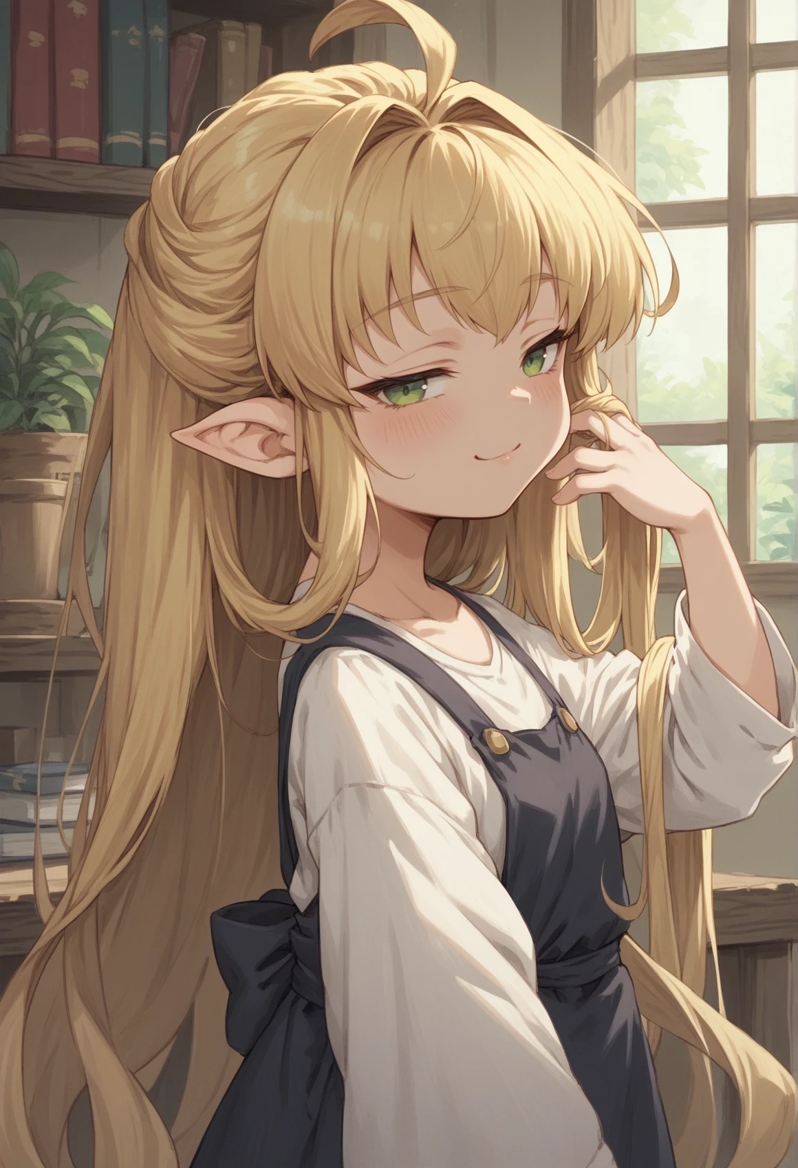 Melissabelle, pointy ears, blonde hair, absurdly long hair, green eyes, shortstack