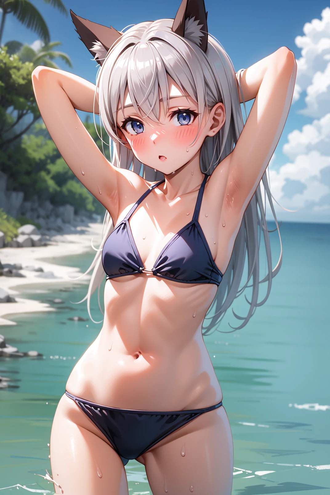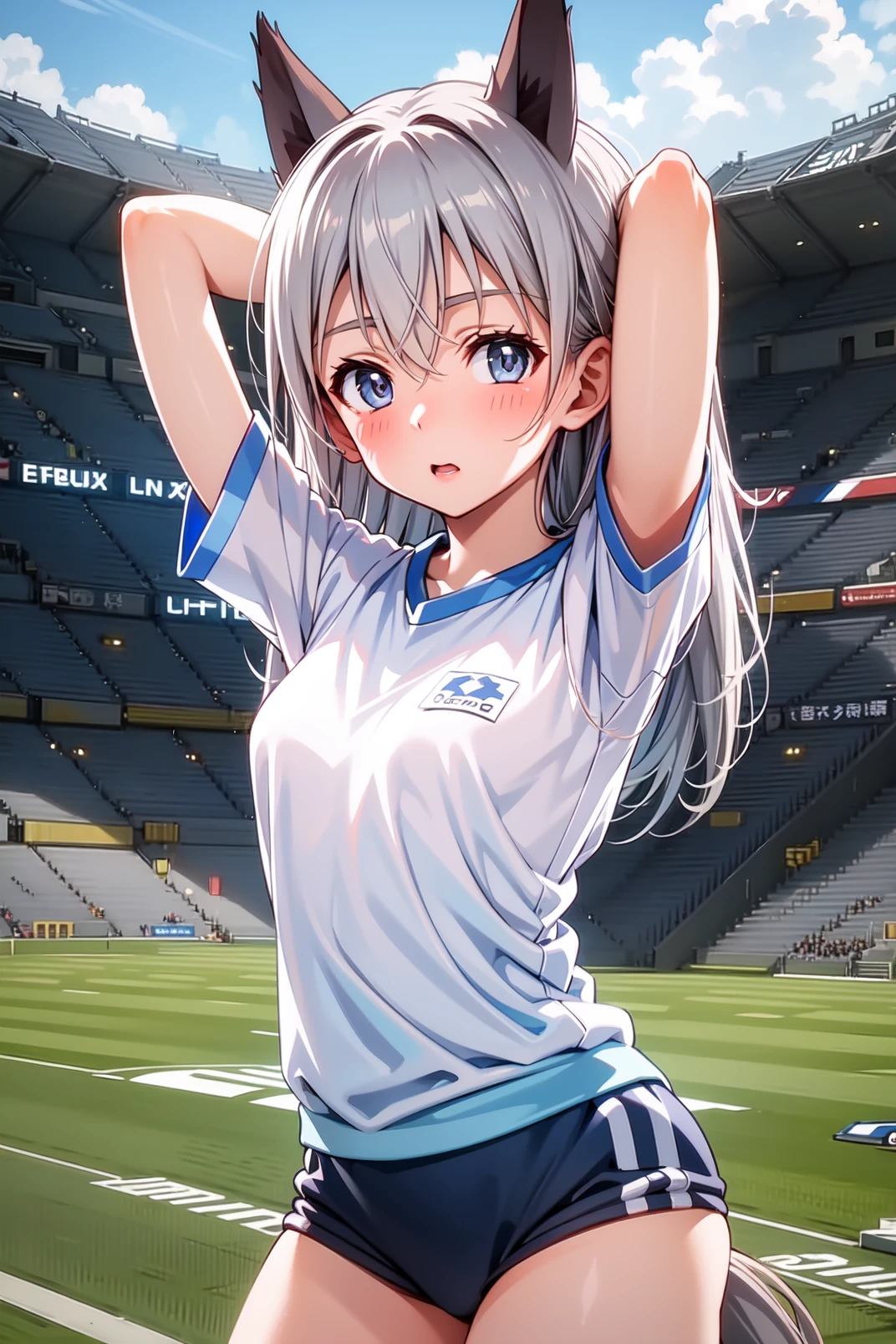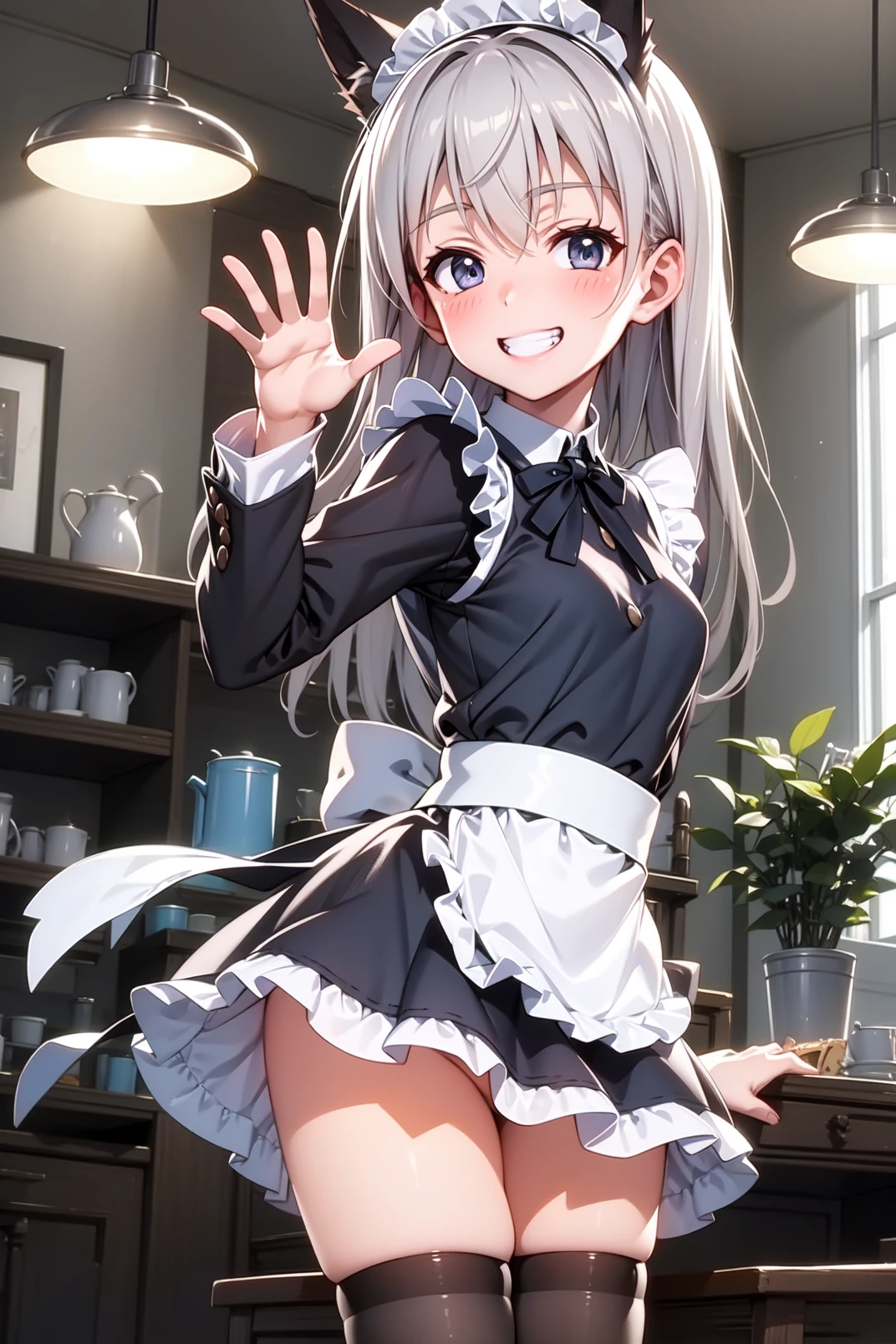appearance: eila, blue eyes, grey hair, long hair, fox ears, fox tail