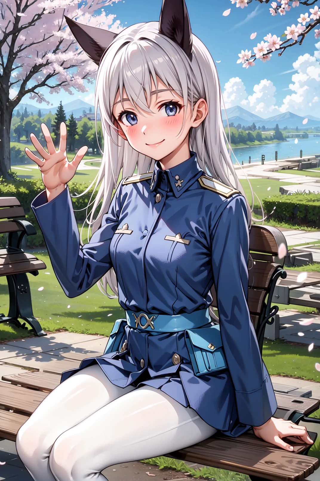 military uniform, light blue uniform, long sleeves, white pantyhose, white boots
