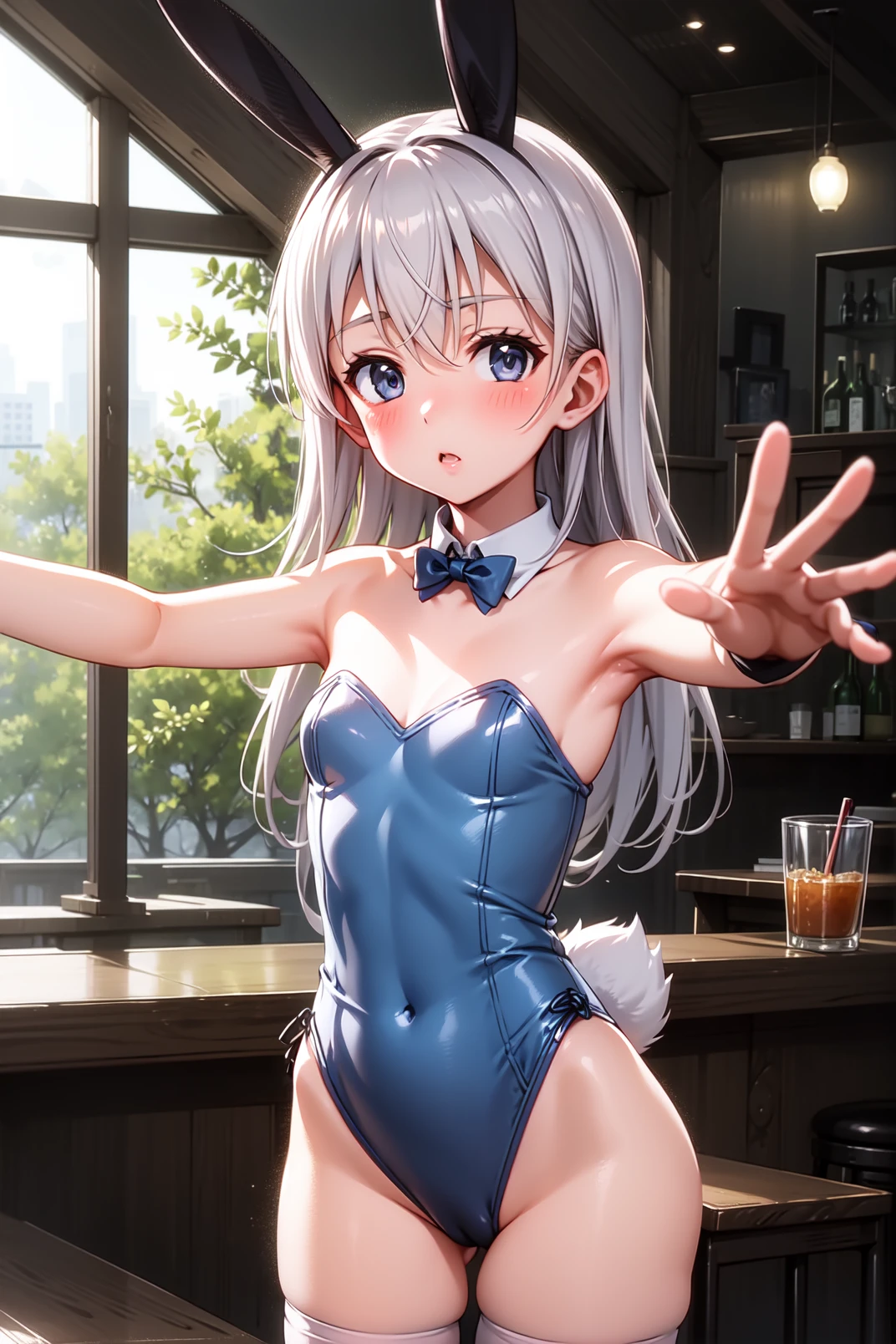 outfit: military uniform, light blue uniform, long sleeves, white pantyhose, white boots