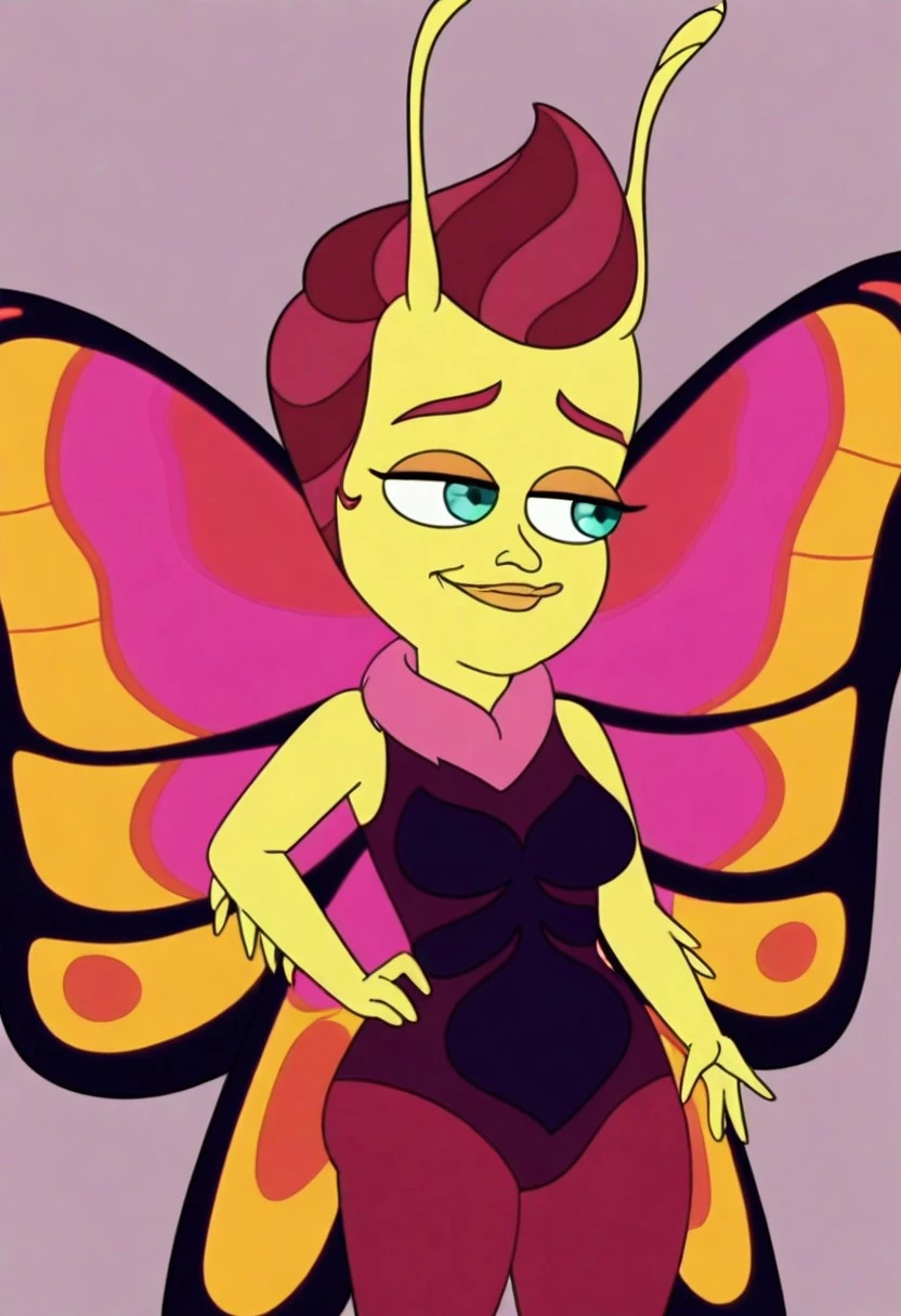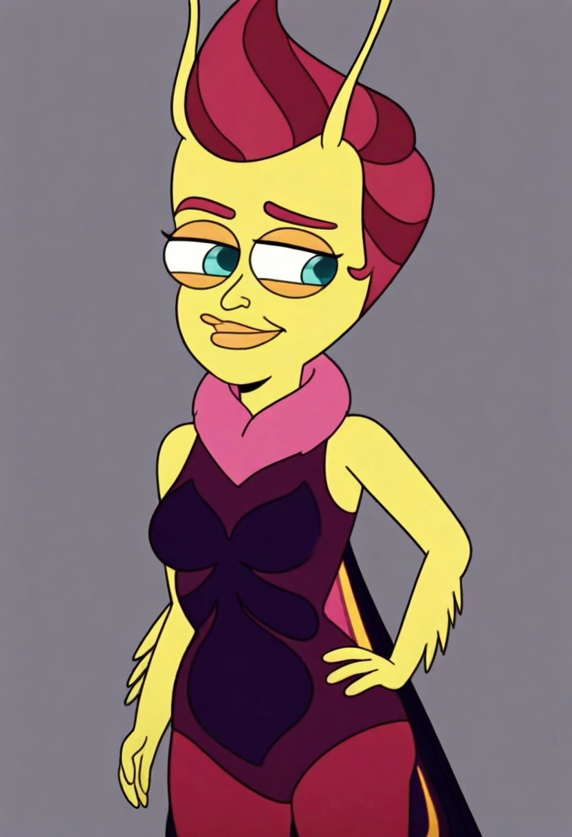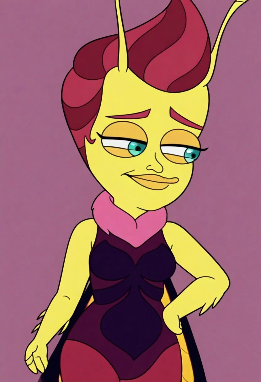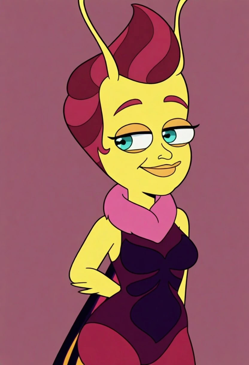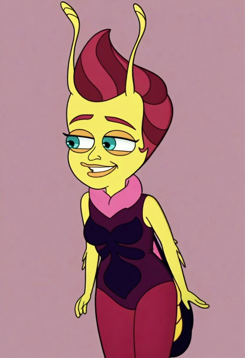 Emmy Fairfax, 1girl, solo, arthropod girl, antennae, short hair, rose hair, stripy hair, aqua eyes, yellow skin, breasts, hips