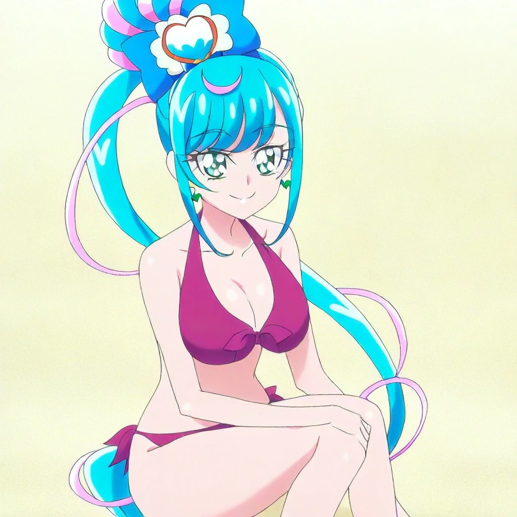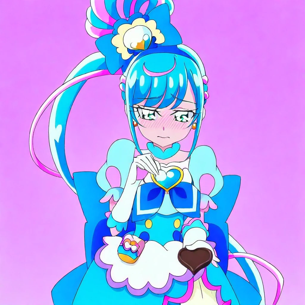 cure spicy \(precure\), light blue hair, long hair, ponytail, bangs, sidelocks, green eyes, hairbow, hair ribbons, hair ornaments, dress, skirt, bow, gem, magical girl outfit, pantyhose, heels, large breasts, 1girl, solo