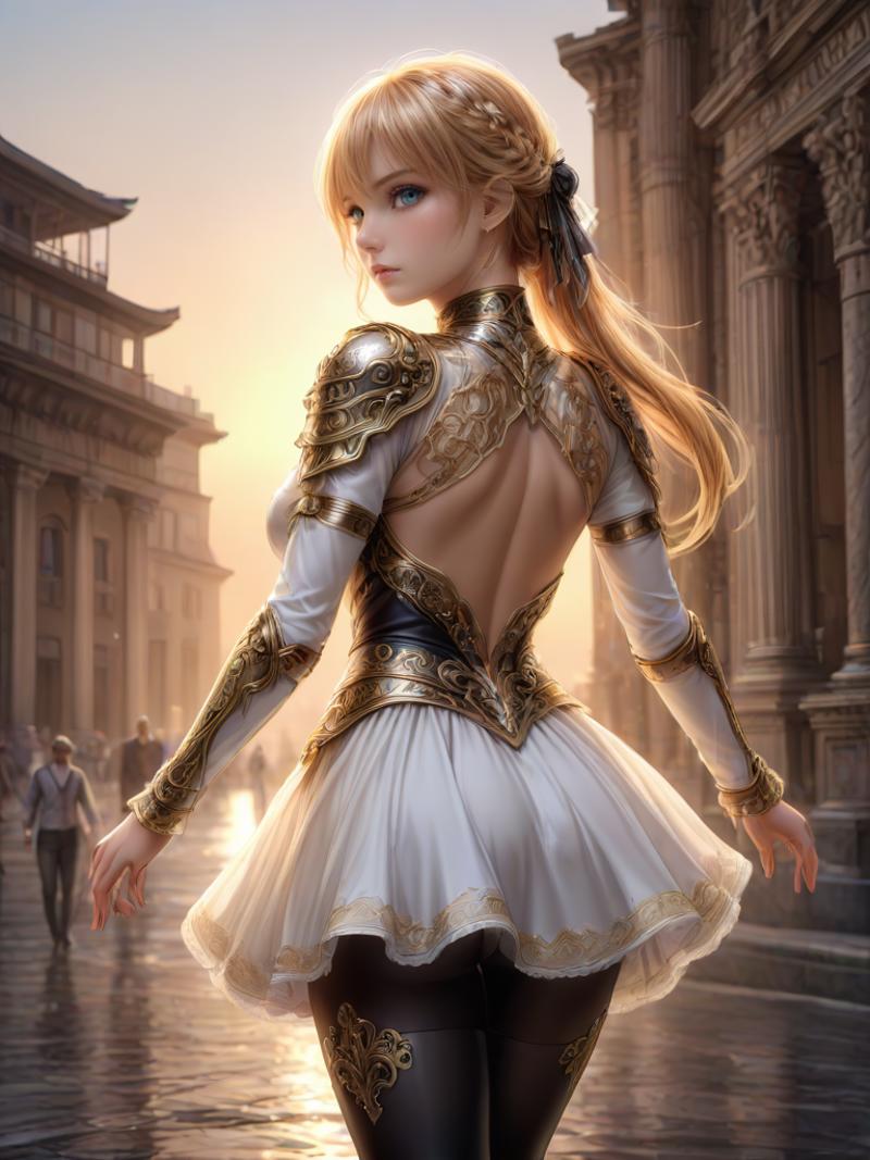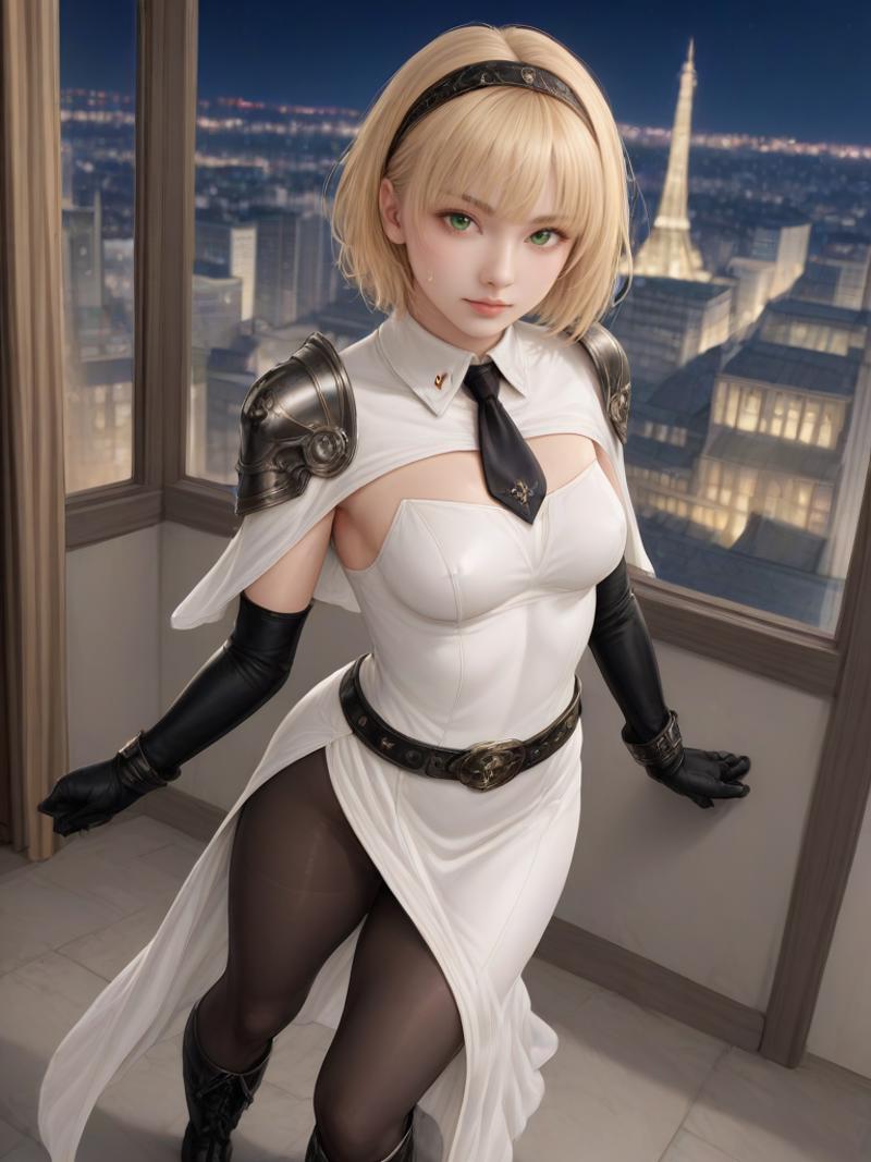 blonde hair, hair bangs, green eyes, shoulder pads, armor, dress, capelet, collar, necktie, leather belt, pantyhose, elbow gloves, black pantyhose, cloth boots