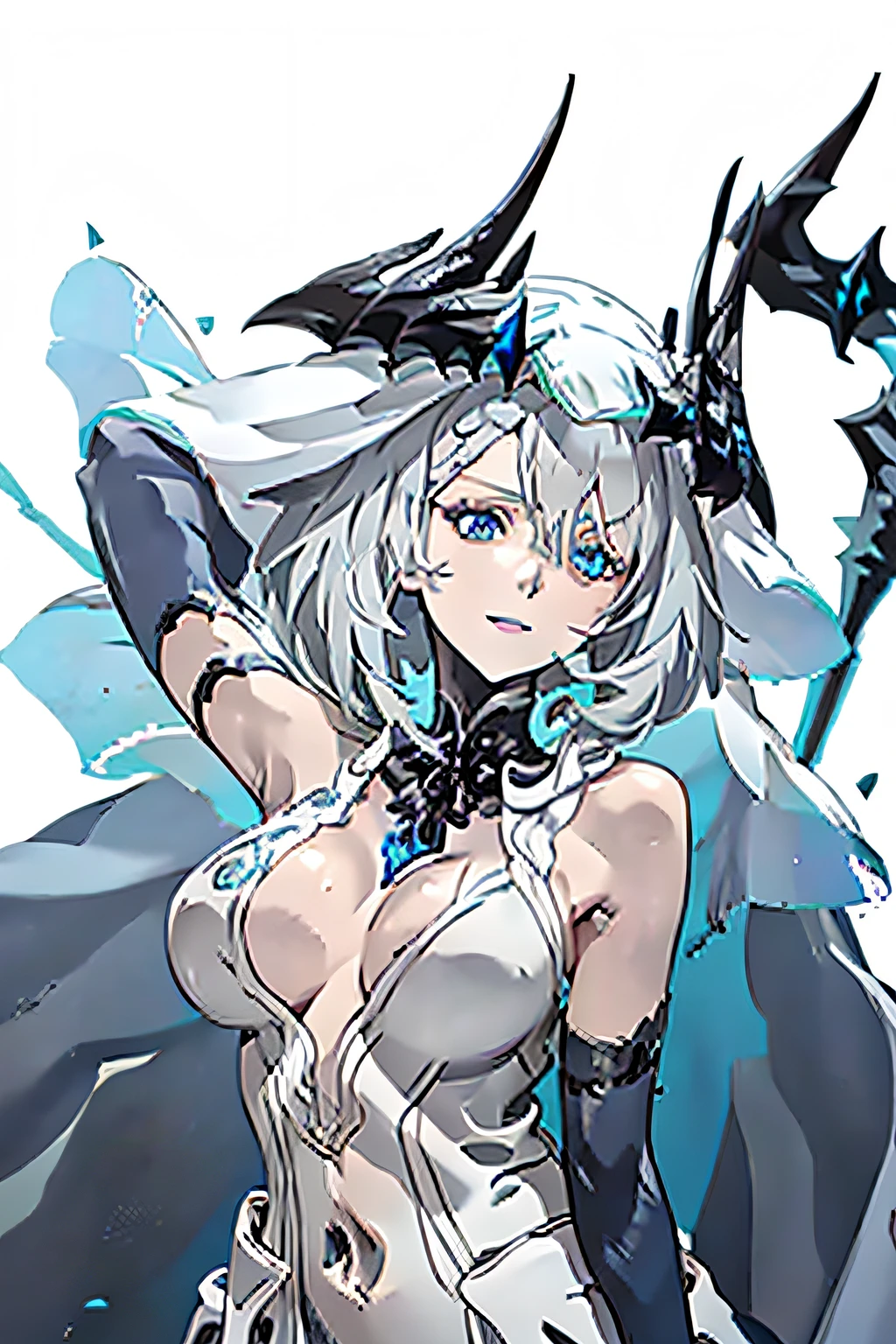 REBECCADUET, SCYTHE, POLEARM, BLUE EYES, CAPE, SHOULDER ARMOR, SILVER HAIR, BORDER, DEPTH OF FIELD, GAUNTLETS, JEWELRY, GLOVES, CLEAVAGE, CAPE,