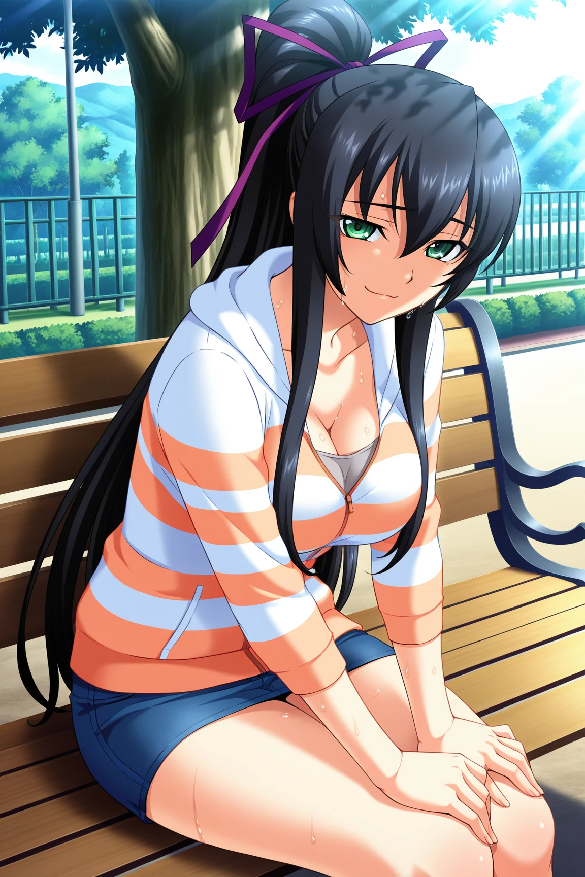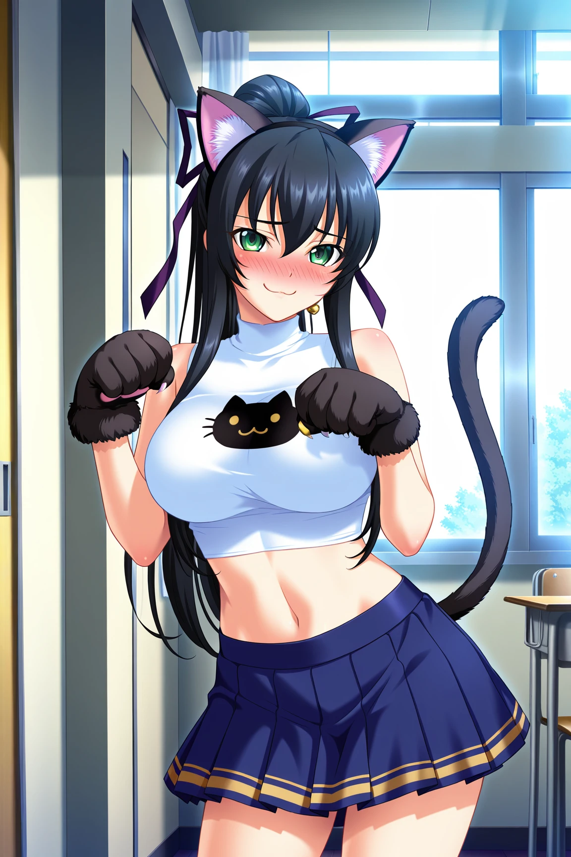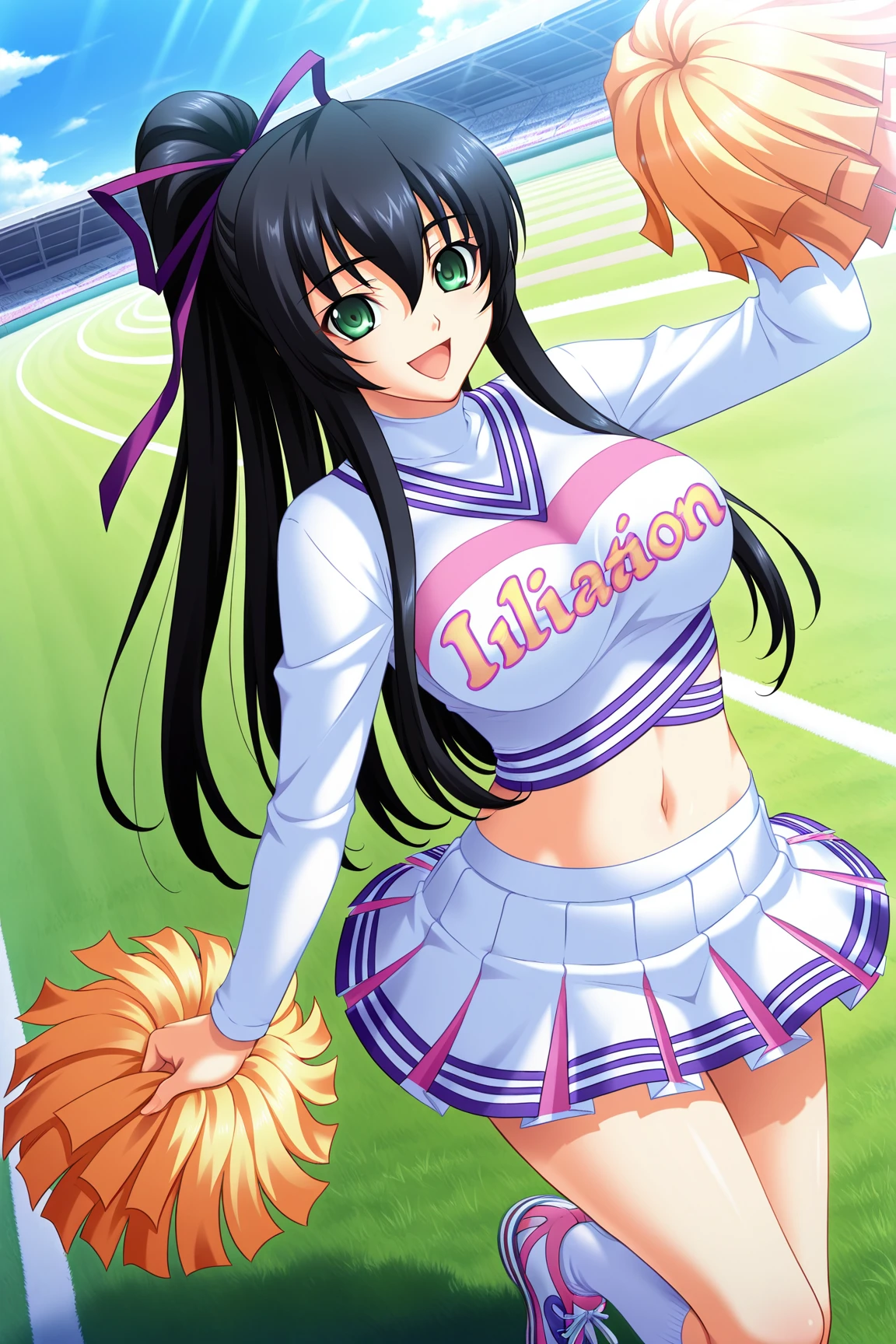Appearence : black hair, green eyes,long hair,high ponytail,hair ribbon