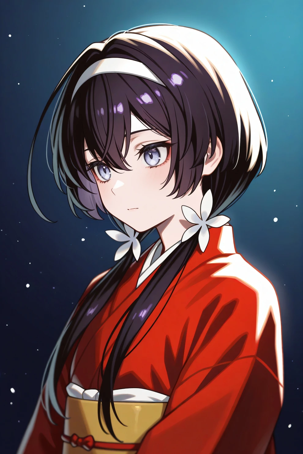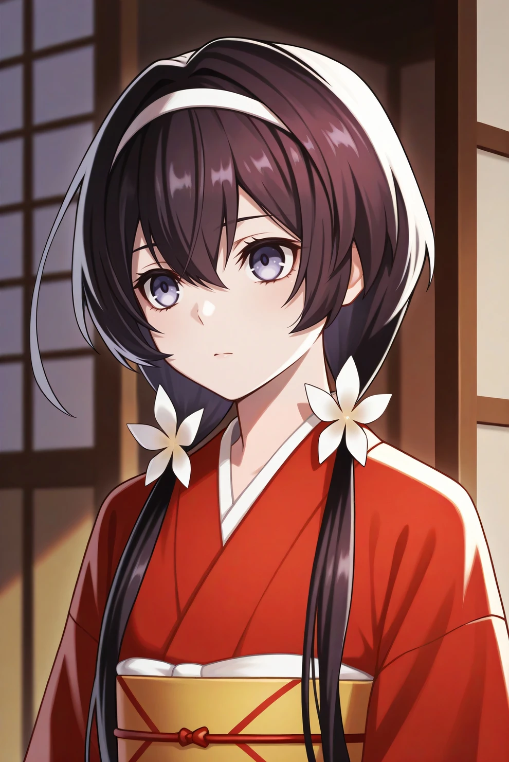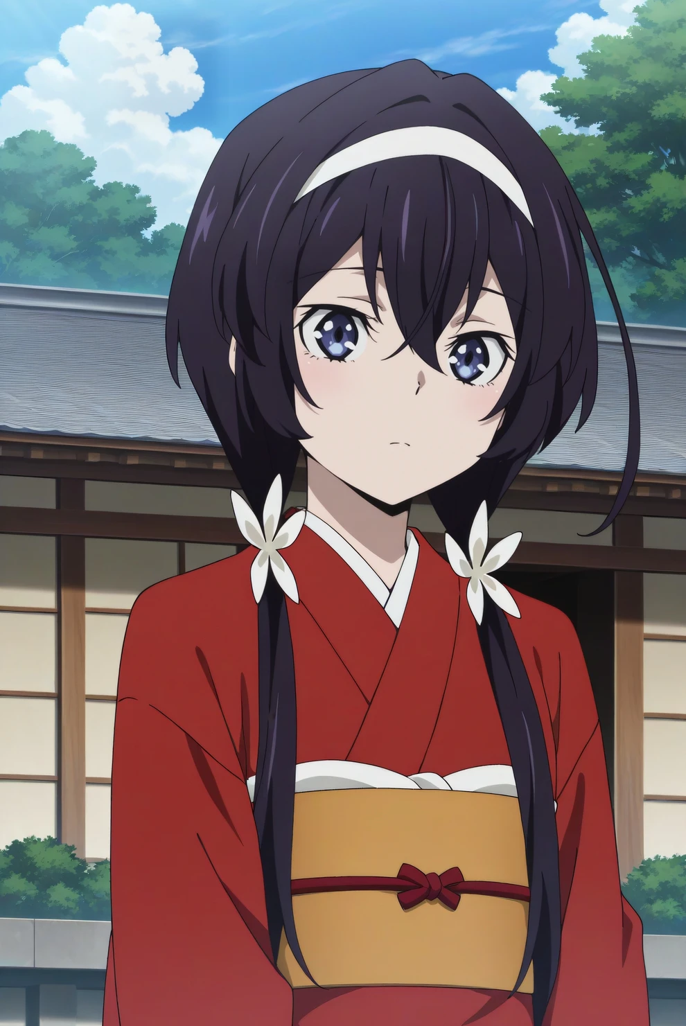 Trigger word is bsdkyouka. For her main appearance, add "low twintails, hairband, hair flower, red kimono, obi, tasuki".