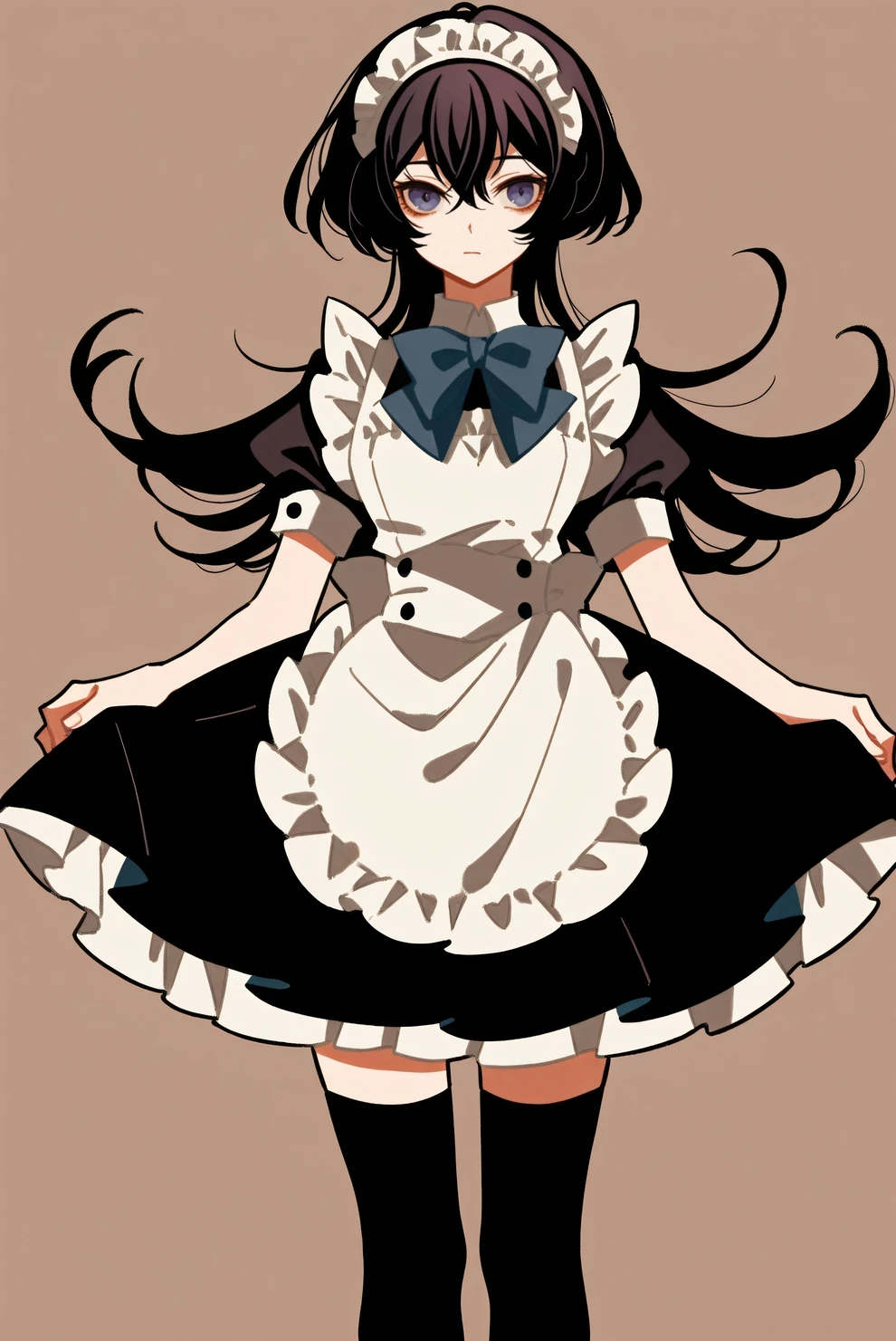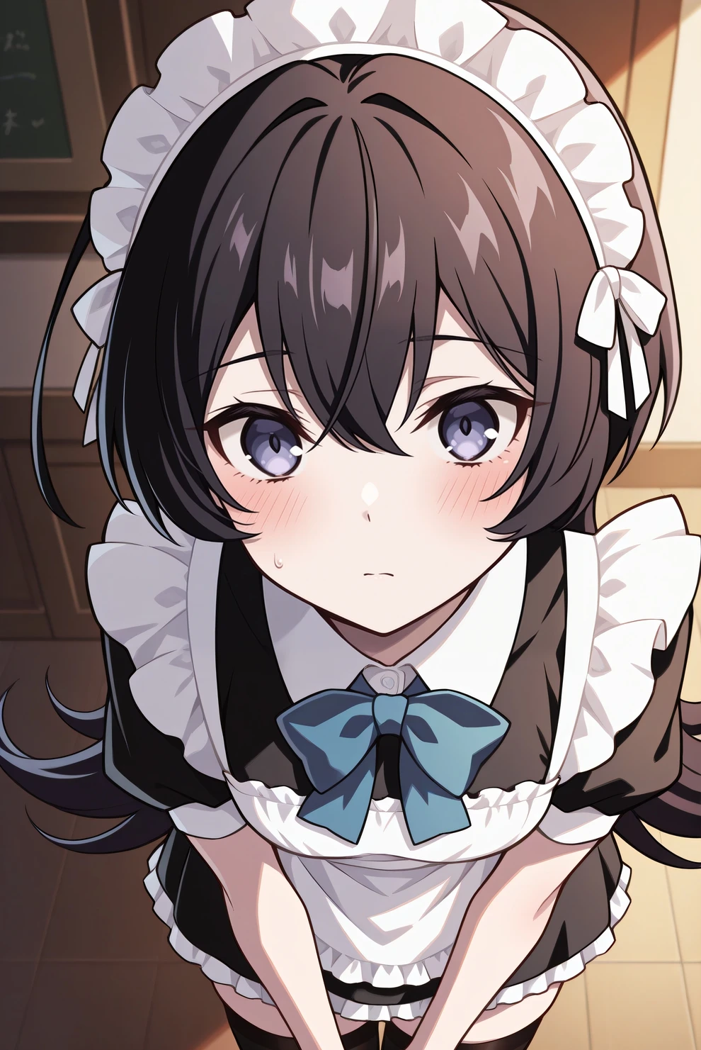 Bonus, maid outfit: hair down, flipped hair, maid, maid headdress, blue bowtie, black dress, apron, black thighhighs, short sleeves