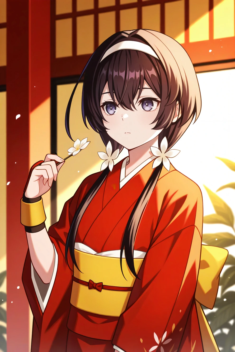 red kimono, obi, tasuki