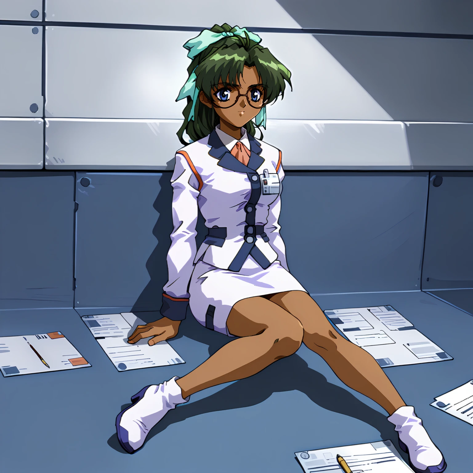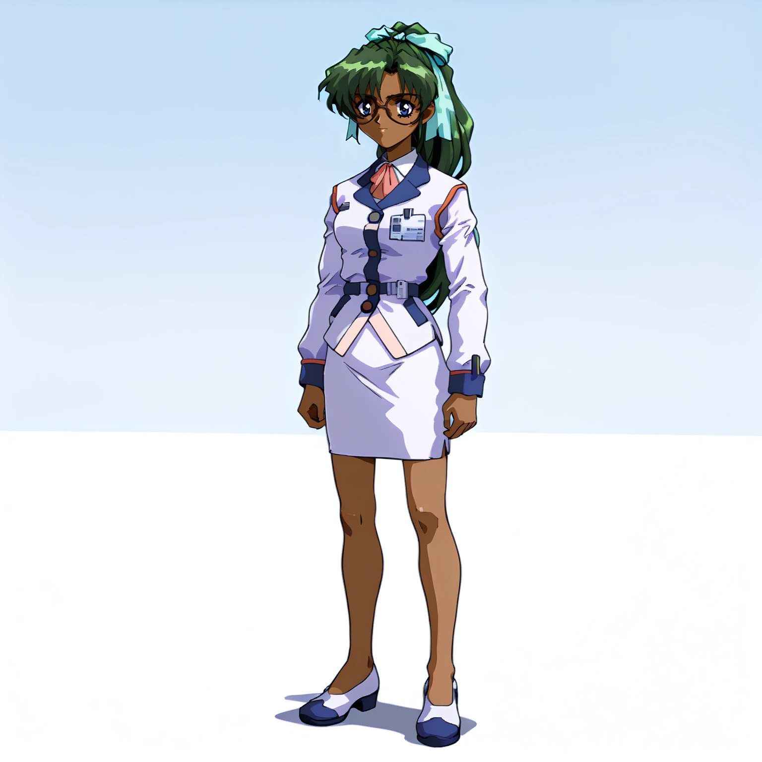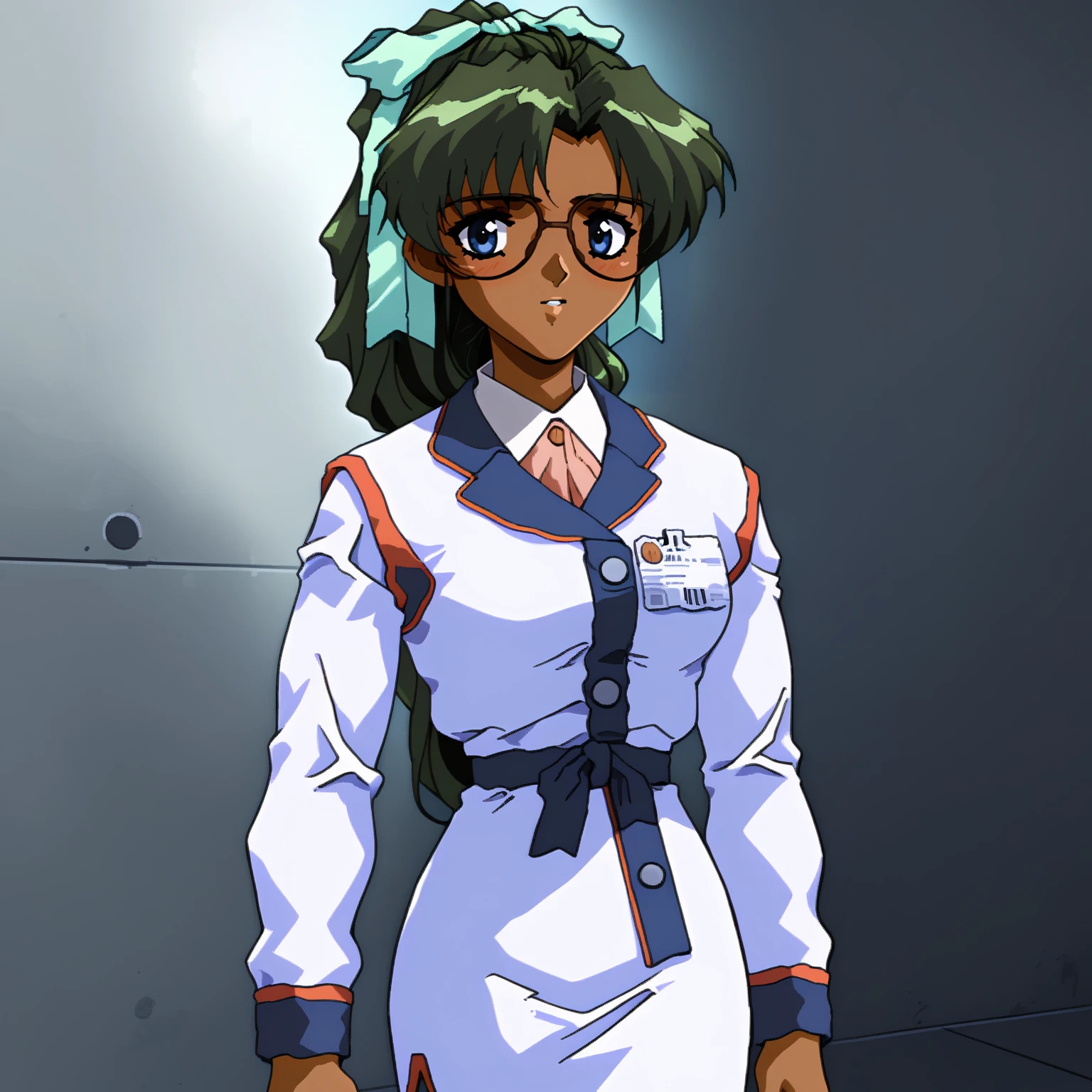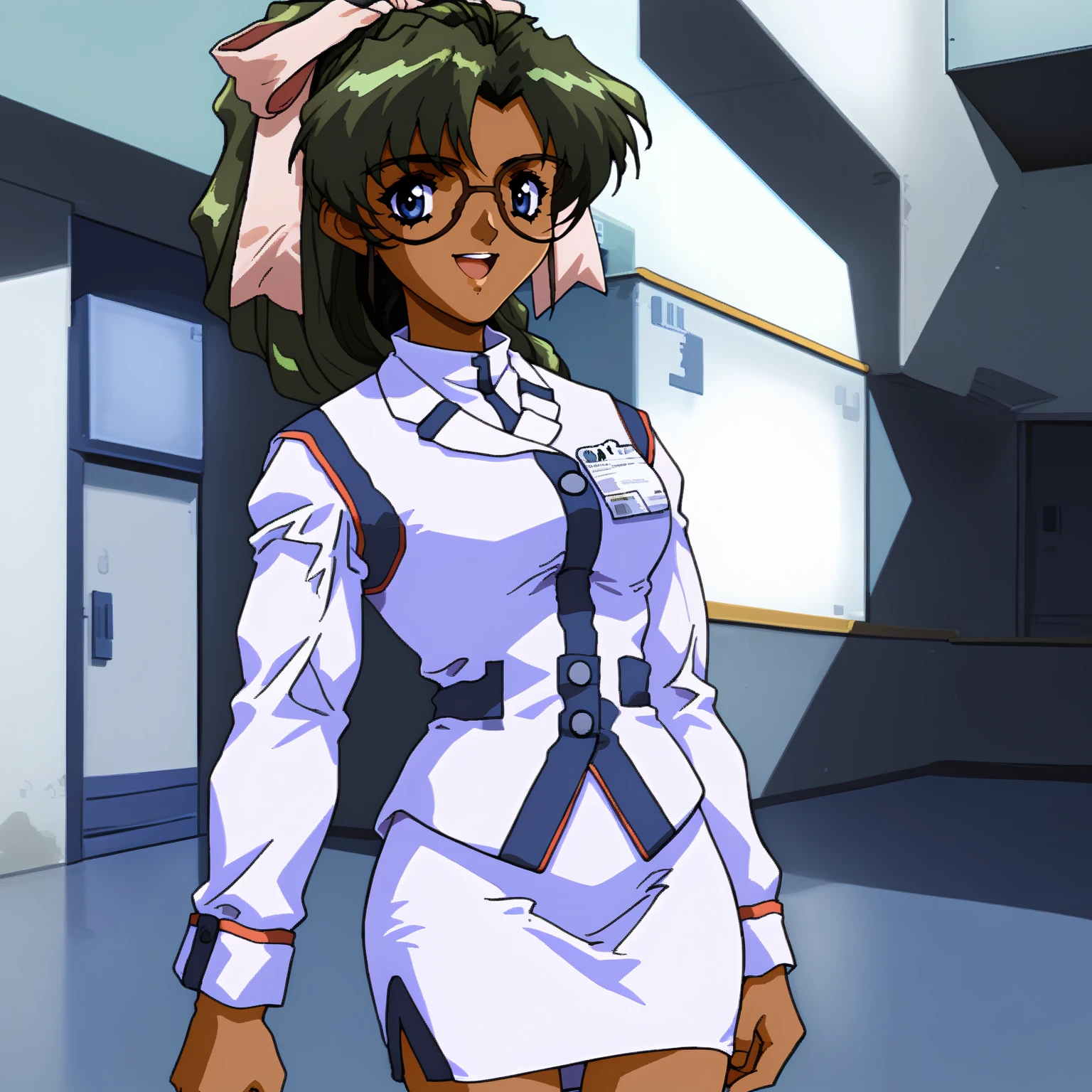 SherilShattleet,1girl,green hair,ponytail,hair ribbon,blue eyes,dark skin,eyewear,