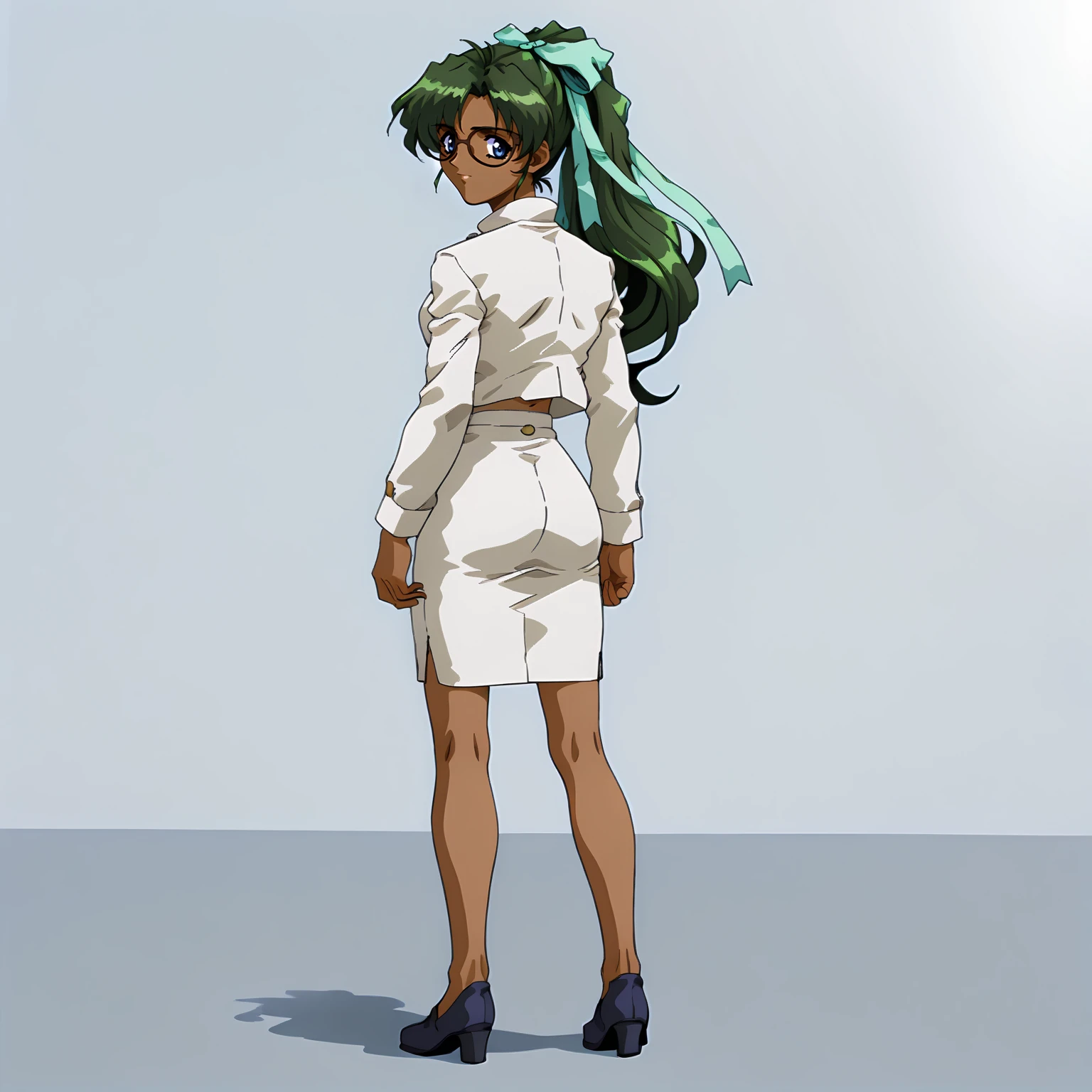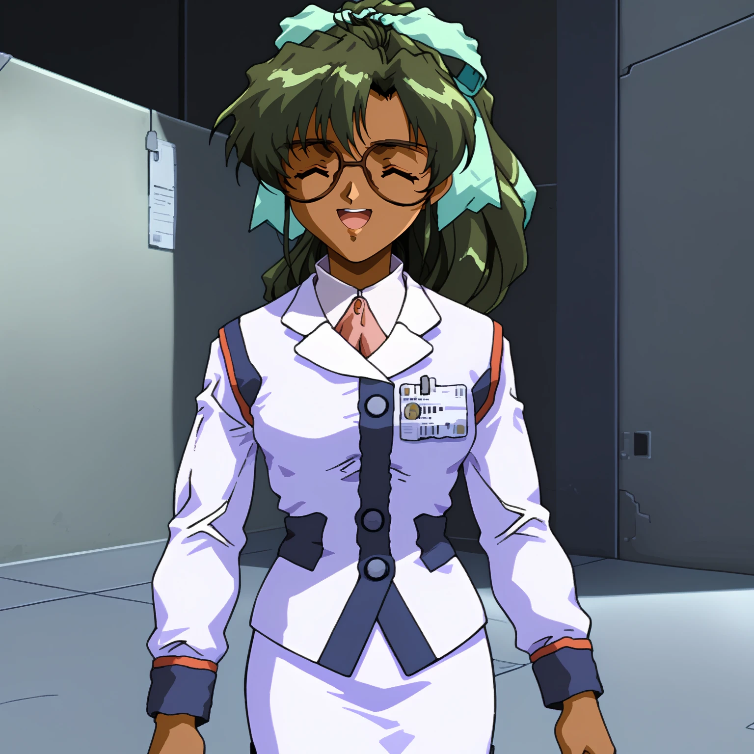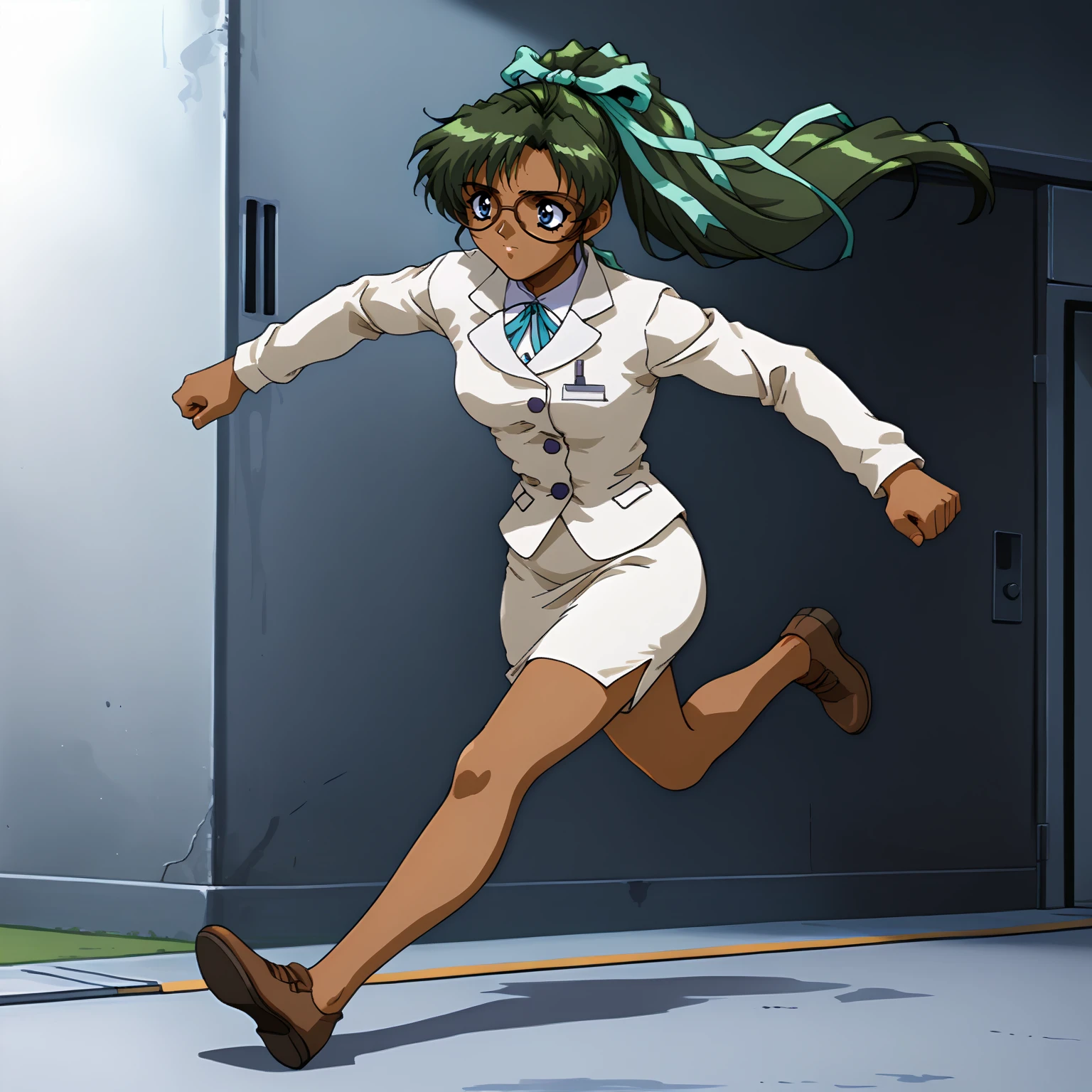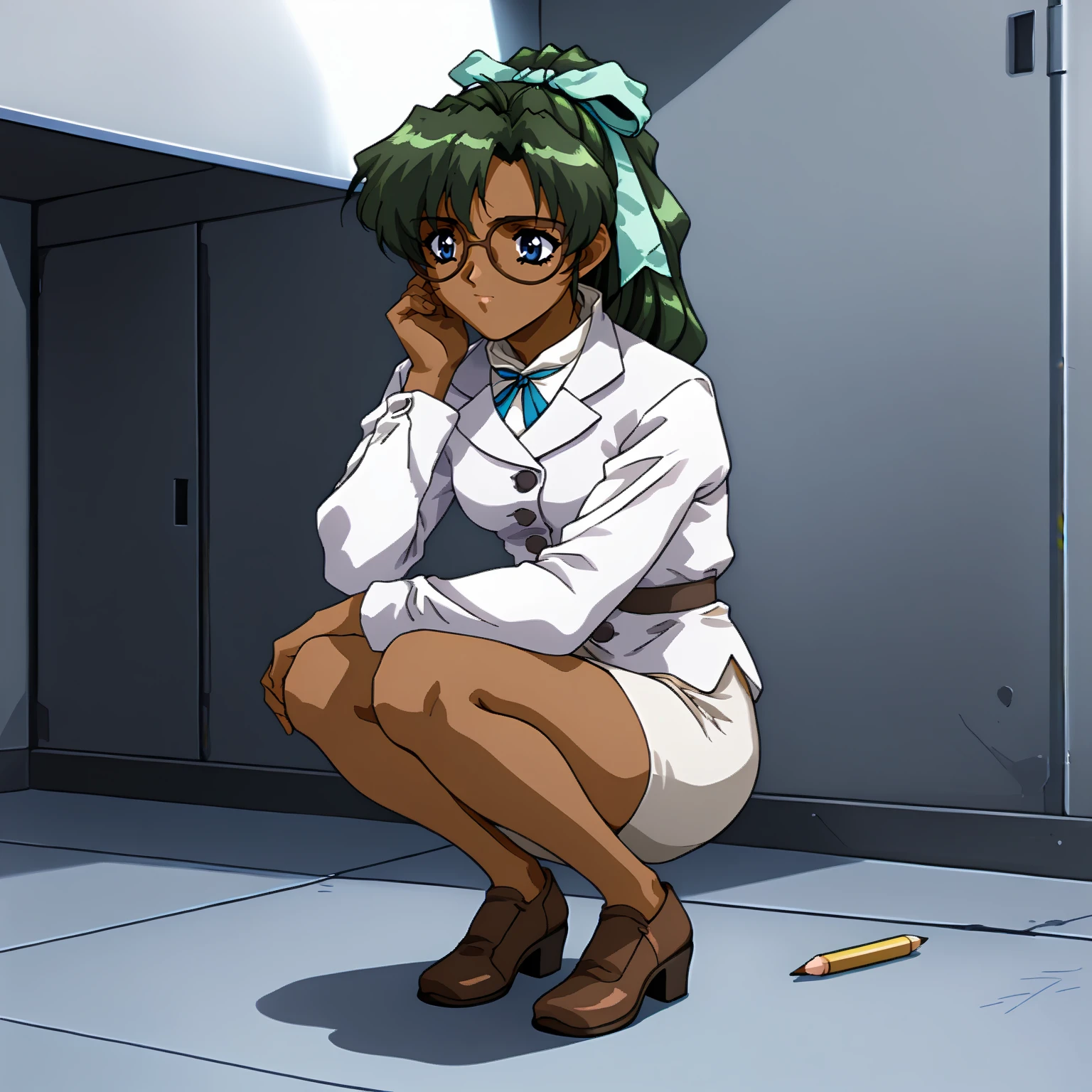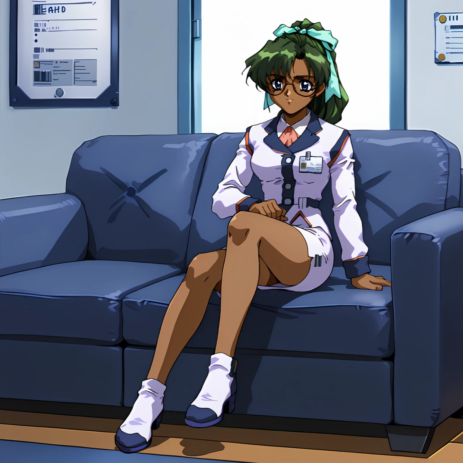 SherilShattleet,1girl,green hair,ponytail,hair ribbon,blue eyes,dark skin,eyewear,