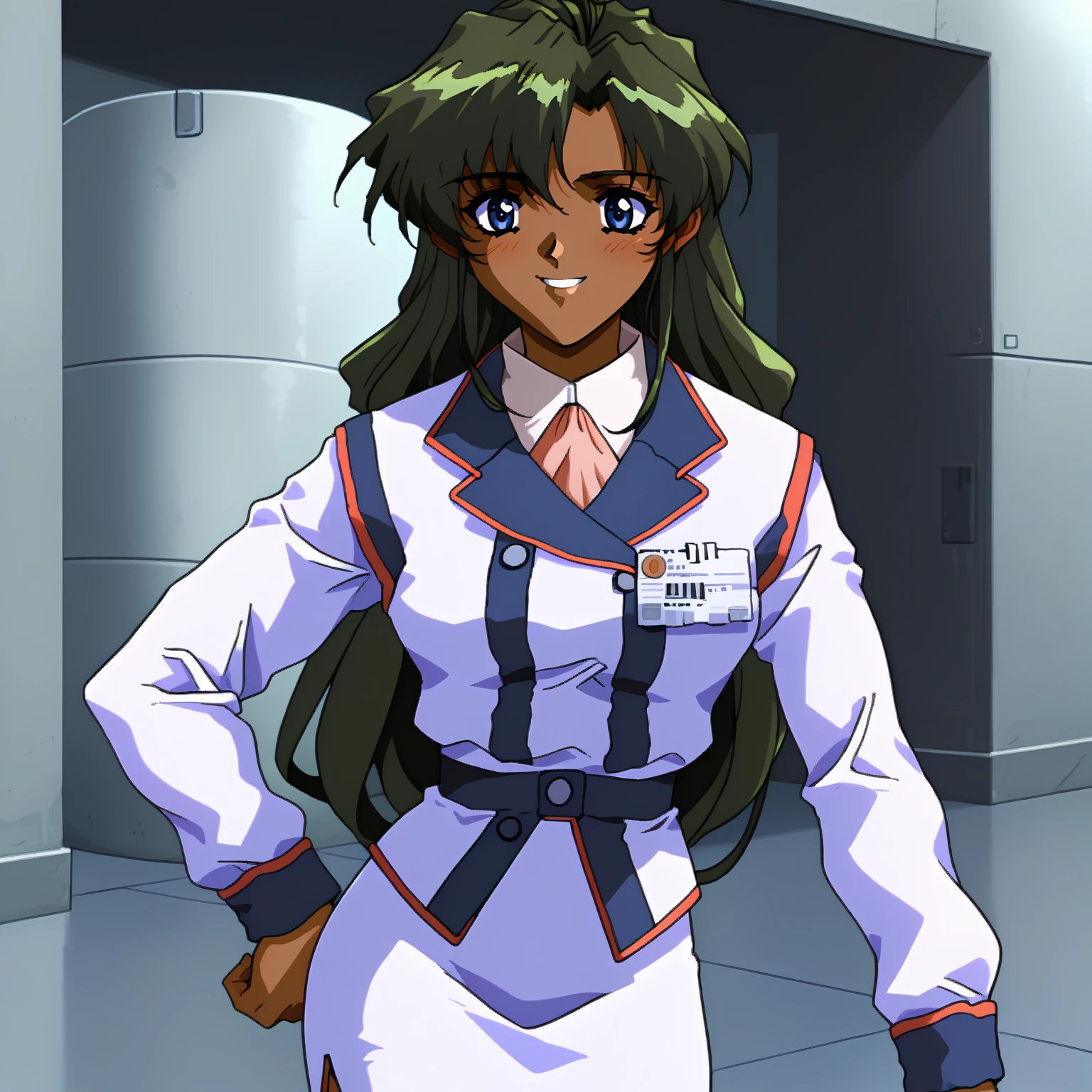 SherilShattleet,1girl,green hair,long hair,blue eyes,dark skin,