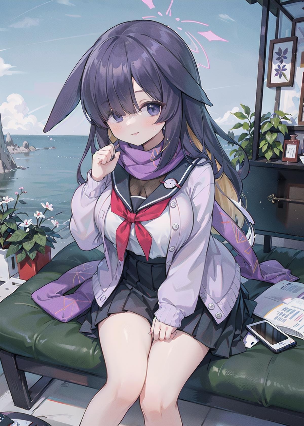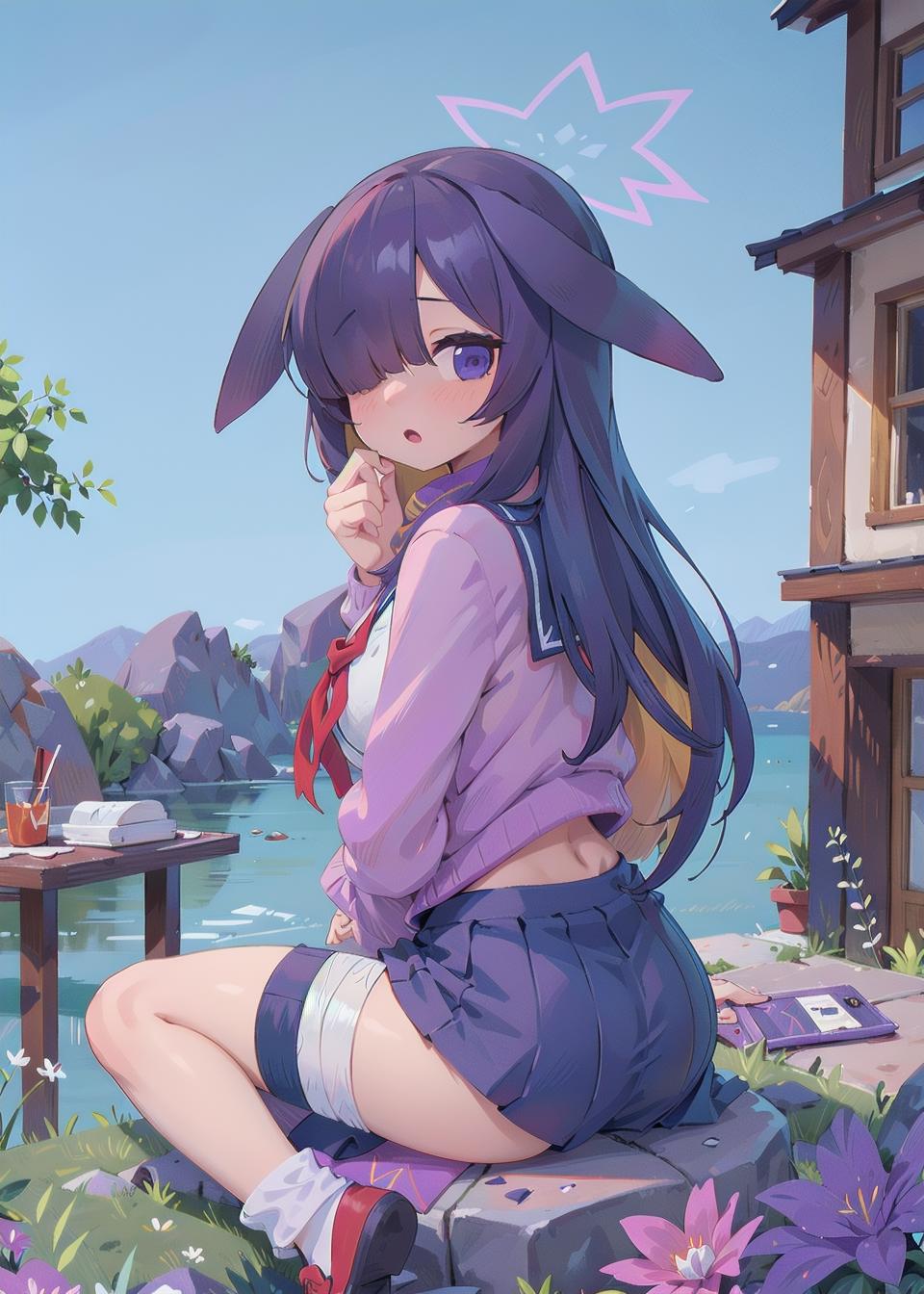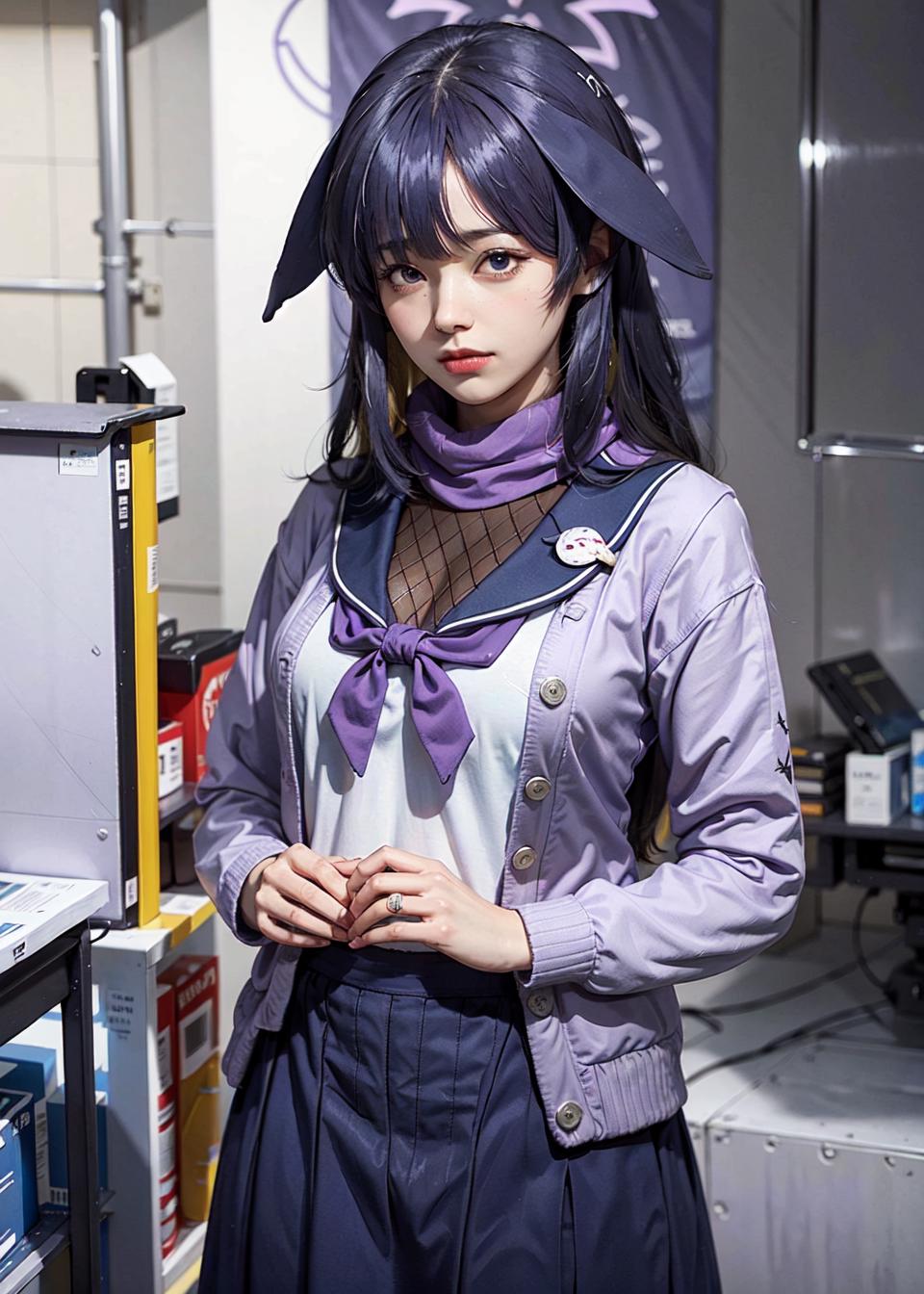 唤醒词(Trigger Words):tsukuyo\(blue archive\),long_hair,purple_hair, purple_eyes,hair_over_one_eye, halo,long dress, serafuku,sailor_collar,fishnets, neckerchief,cardigan, bandaged_leg,