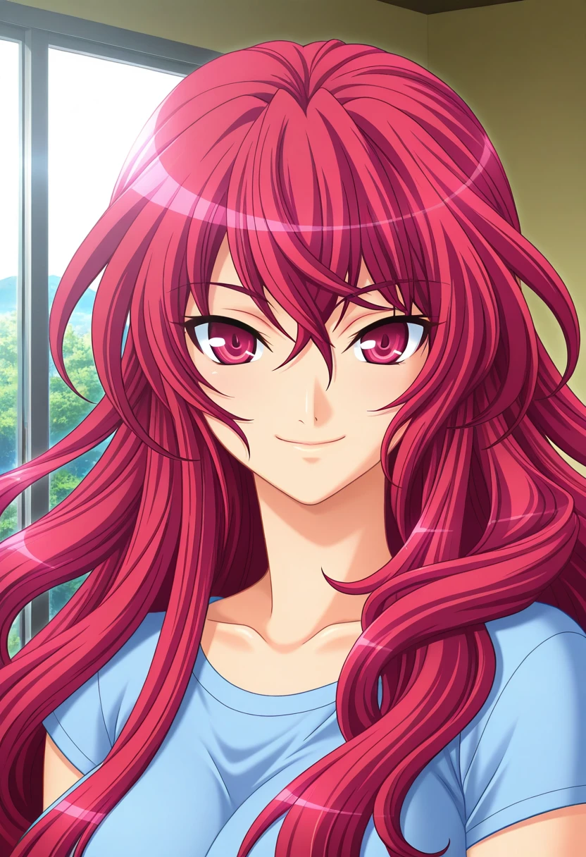 • lunarverseww, aged up, mature female, red eyes, red hair, long hair, very long hair, hair between eyes, wavy hair, large breasts,