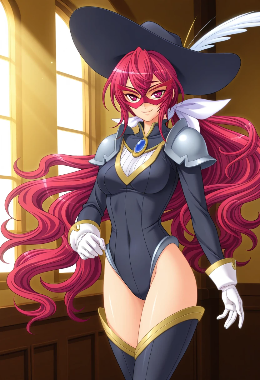 lunamask costume, black hat, hat feather, red mask, black leotard, shoulder armor, long sleeves, white gloves, thigh boots,