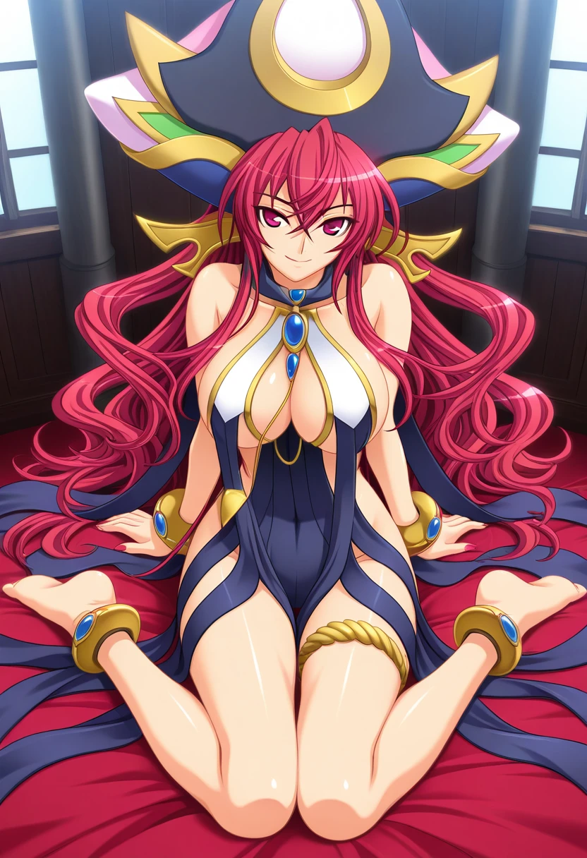 lunarverseww, aged up, mature female, red eyes, red hair, long hair, very long hair, hair between eyes, wavy hair, large breasts,