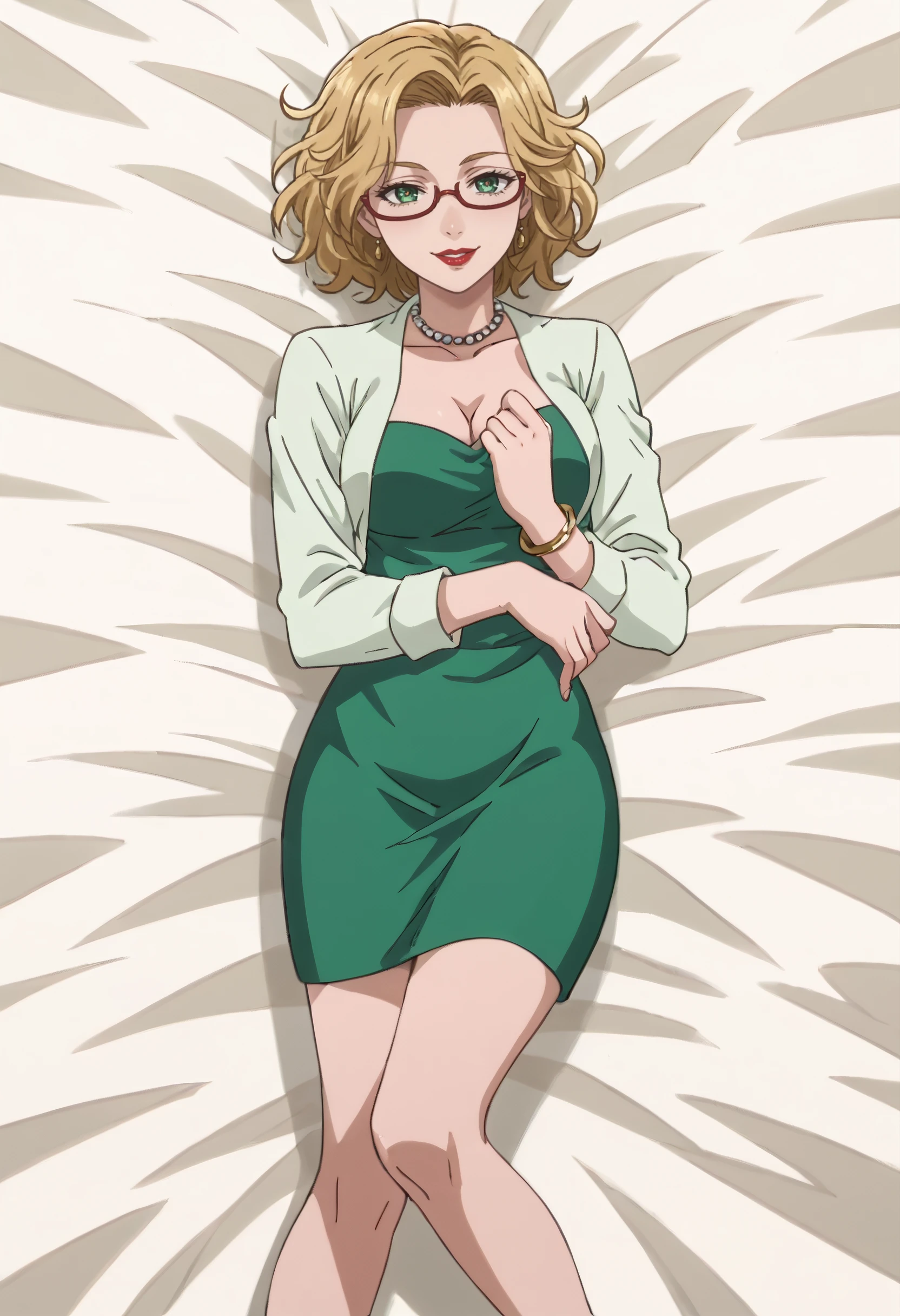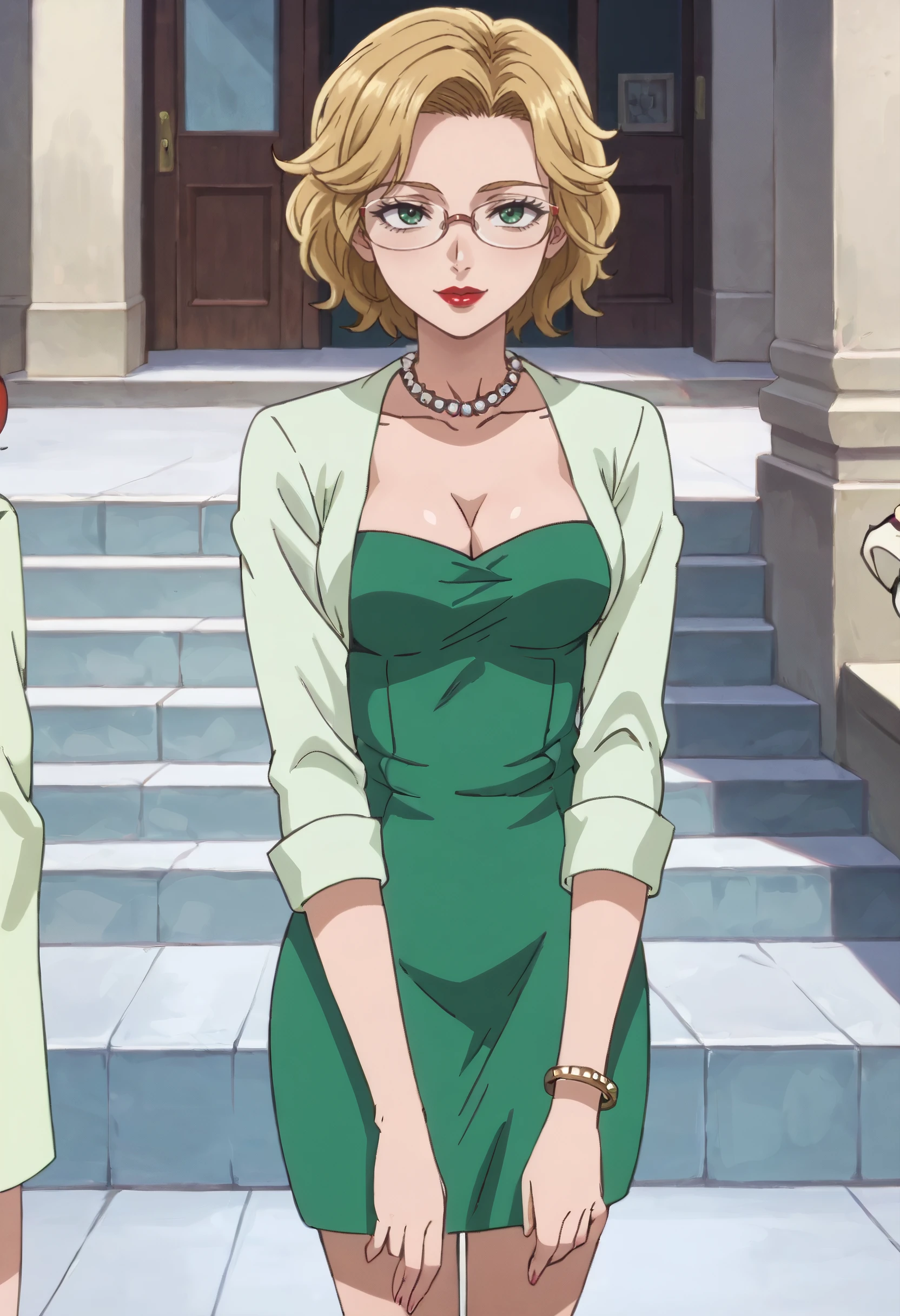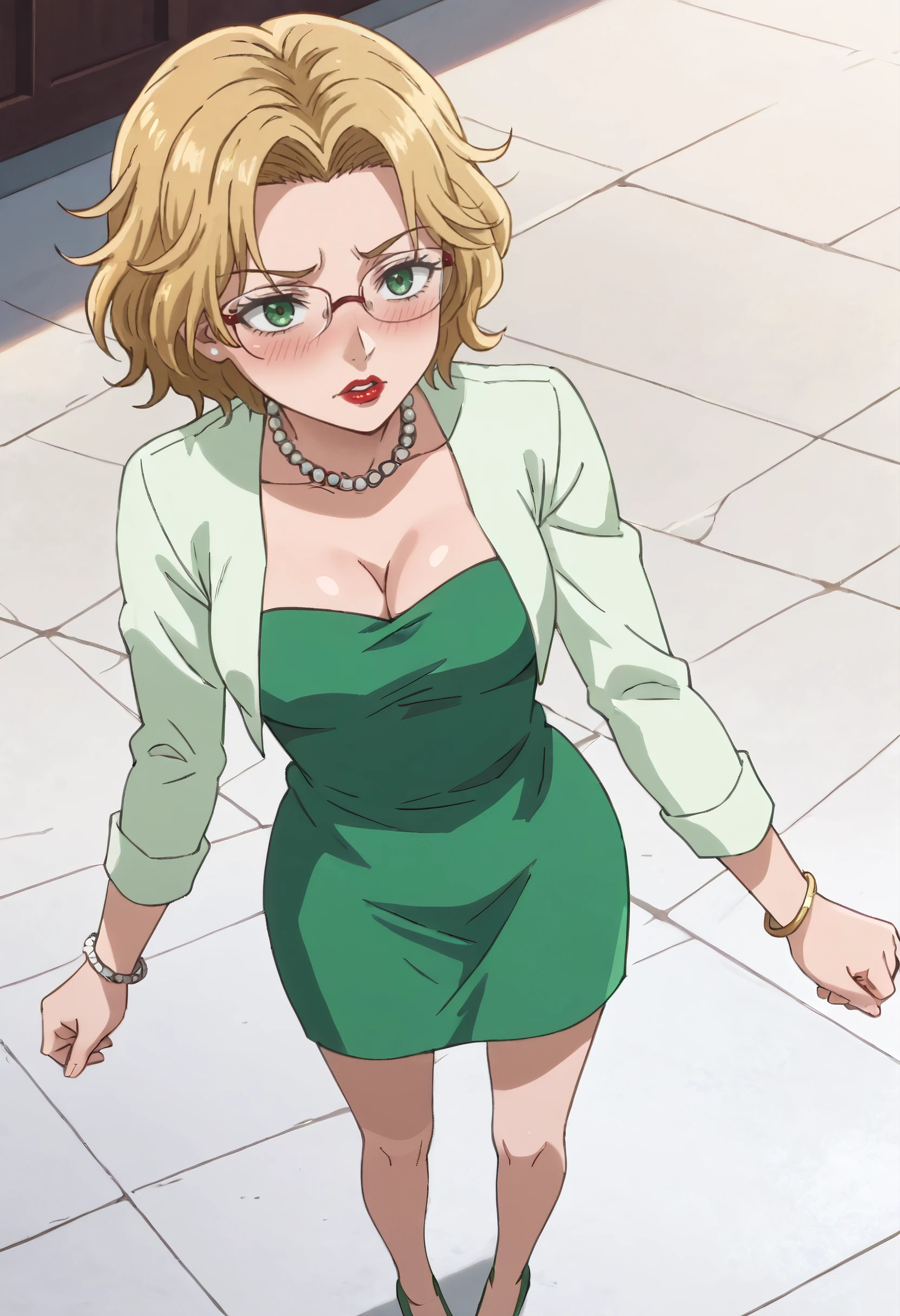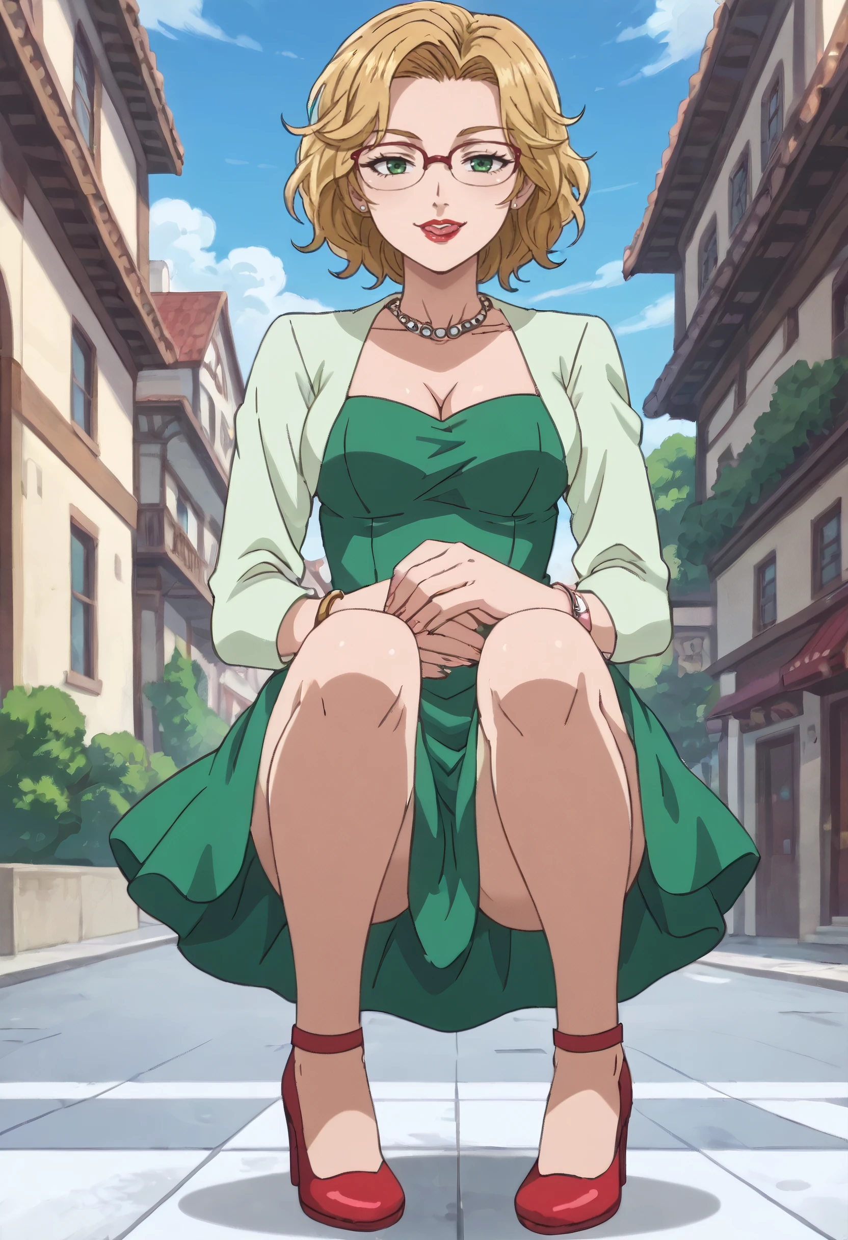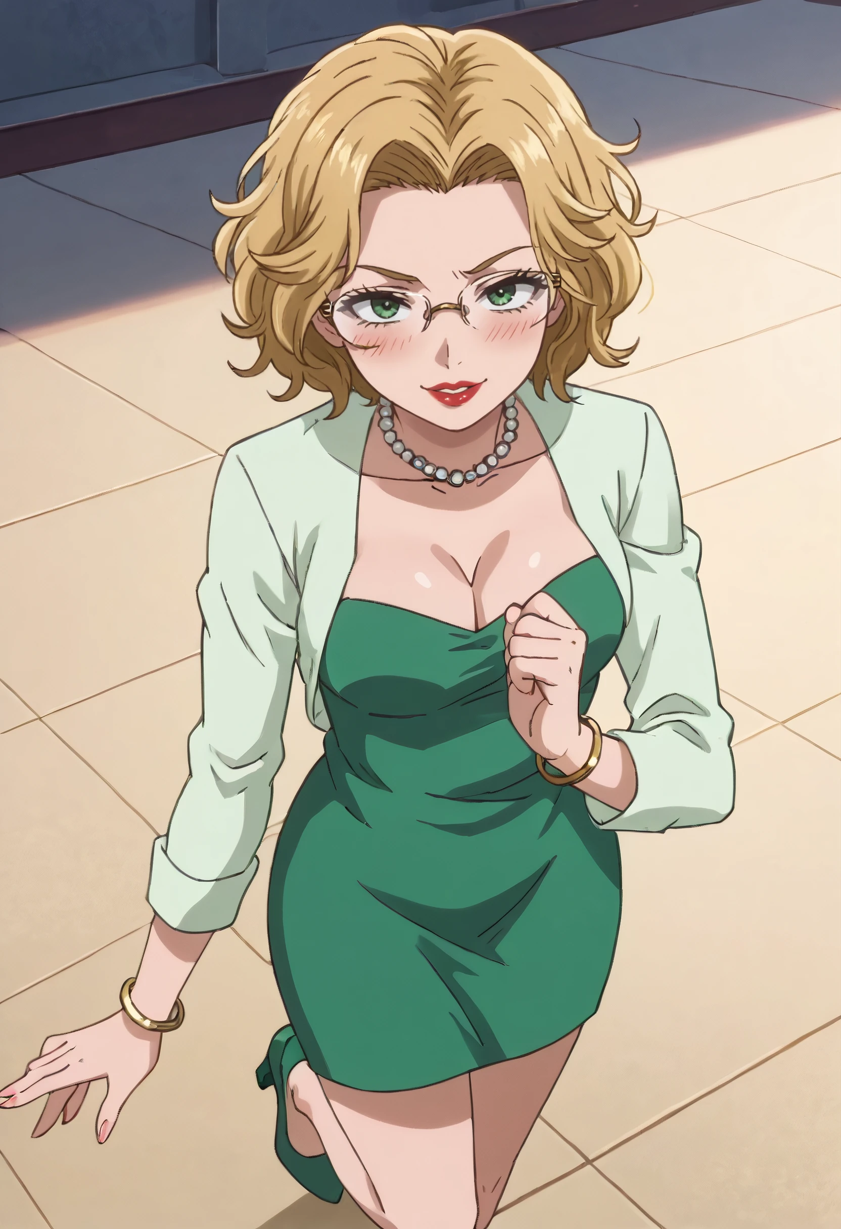 green dress, skirt, dress, long sleeves, shirt, green shirt, jewelry, necklace, pearl necklace, cleavage, green skirt, bracelet, high heels, red footwear,