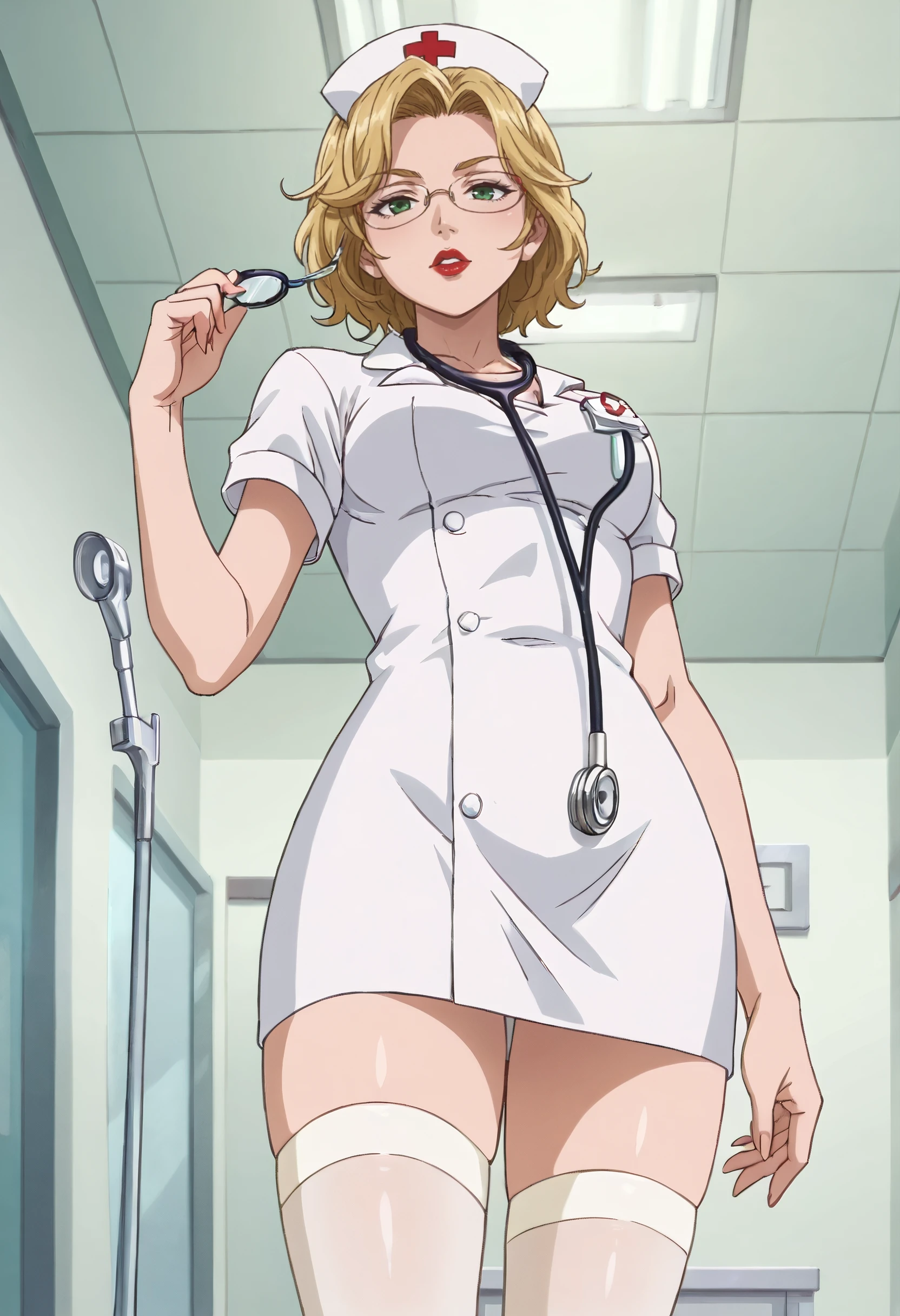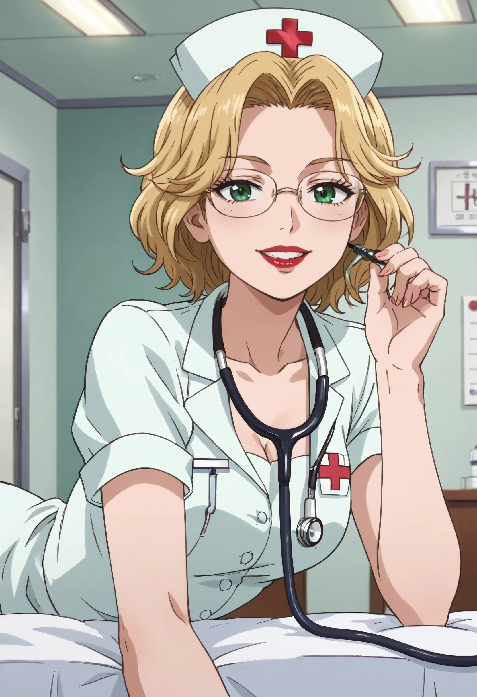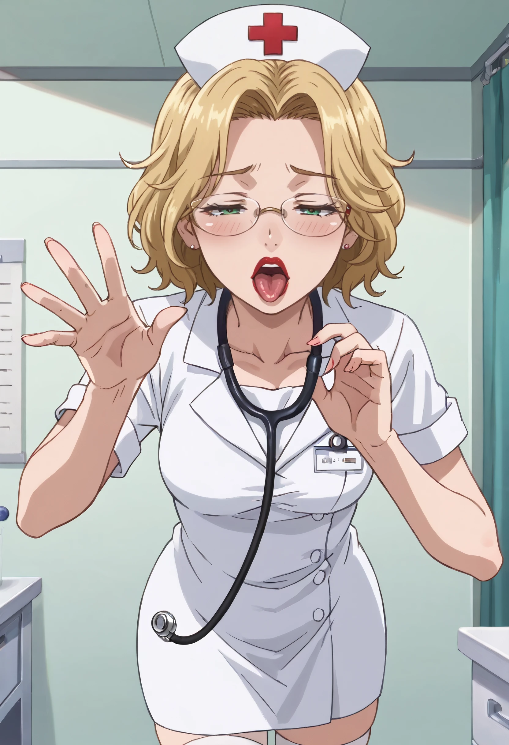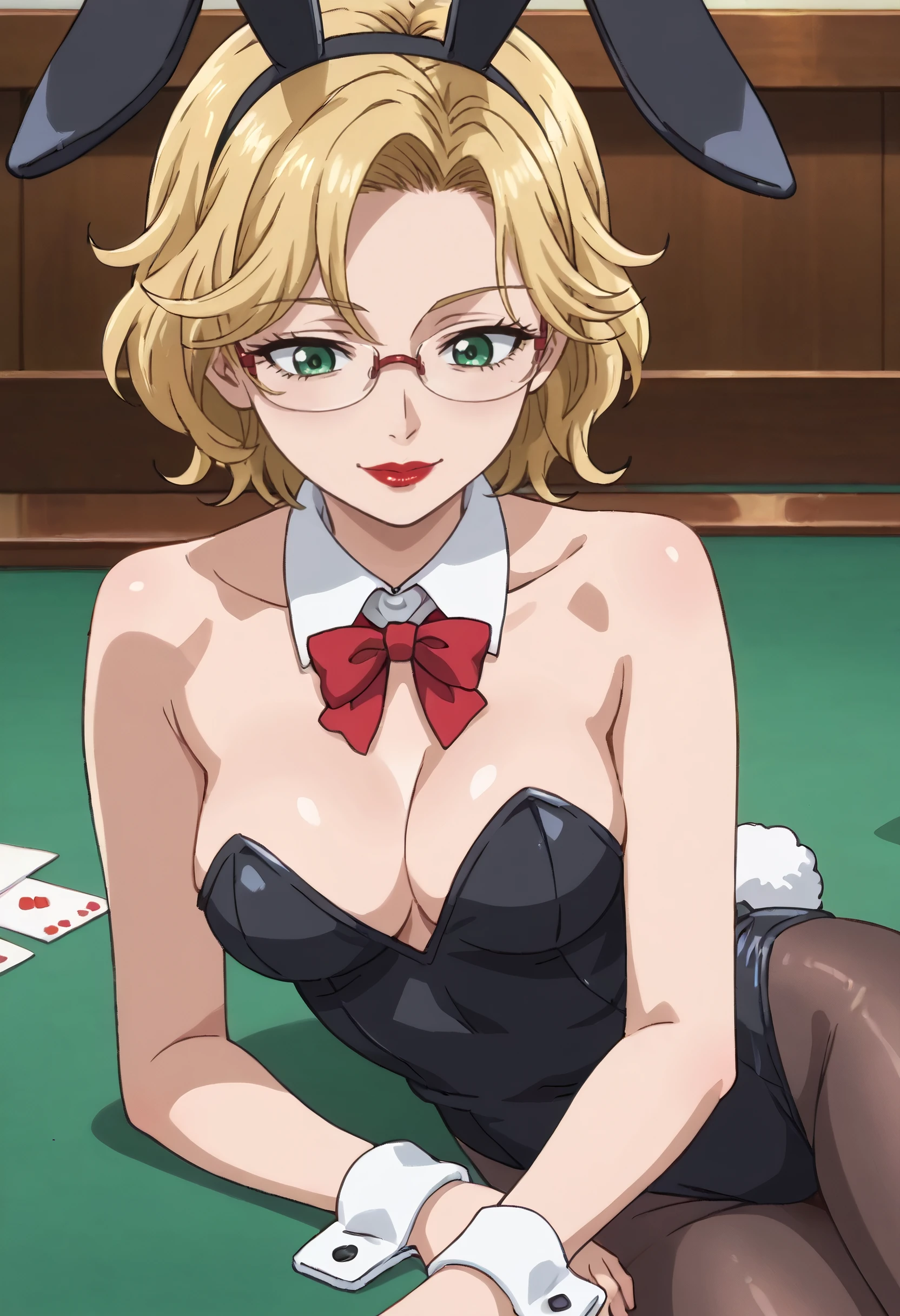 BGFMatsuzaka, blonde hair, short hair, green eyes, glasses, lipstick, red lips, lips, makeup, semi-rimless eyewear,