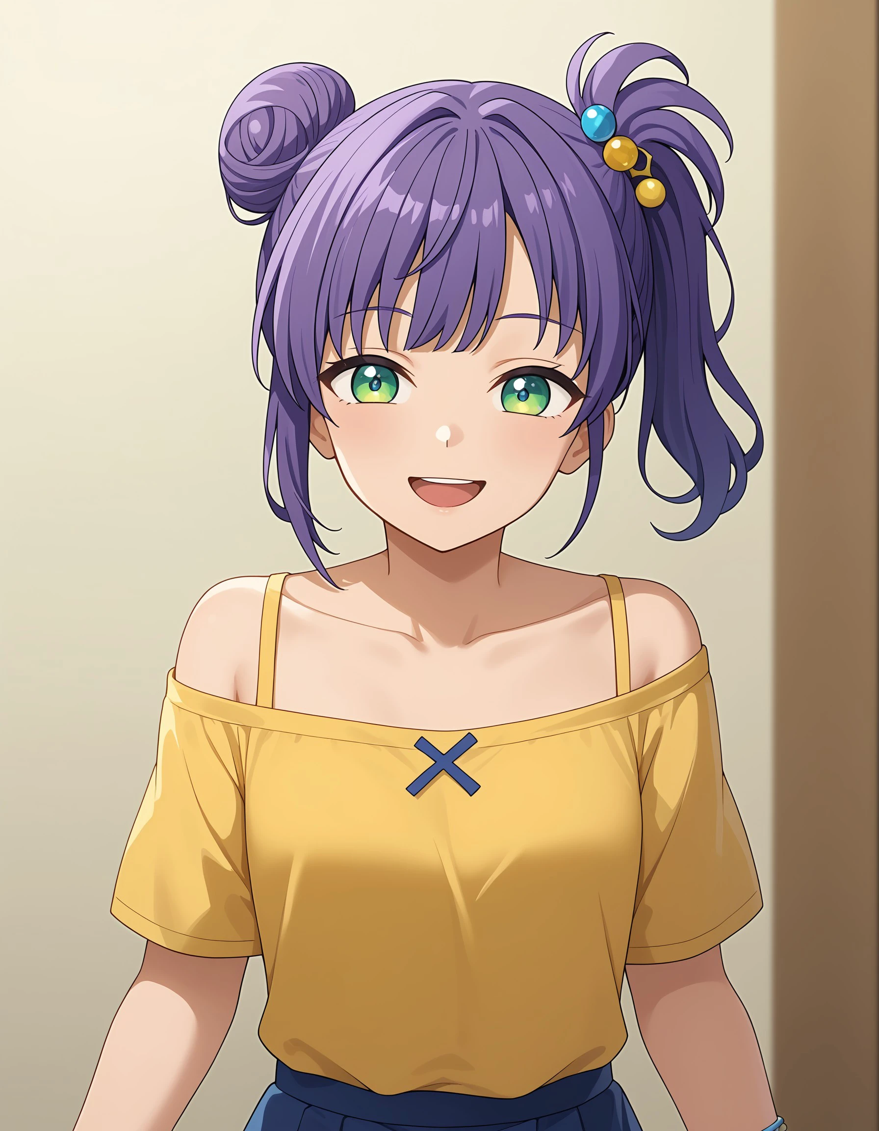 purple hair, green eyes, long hair