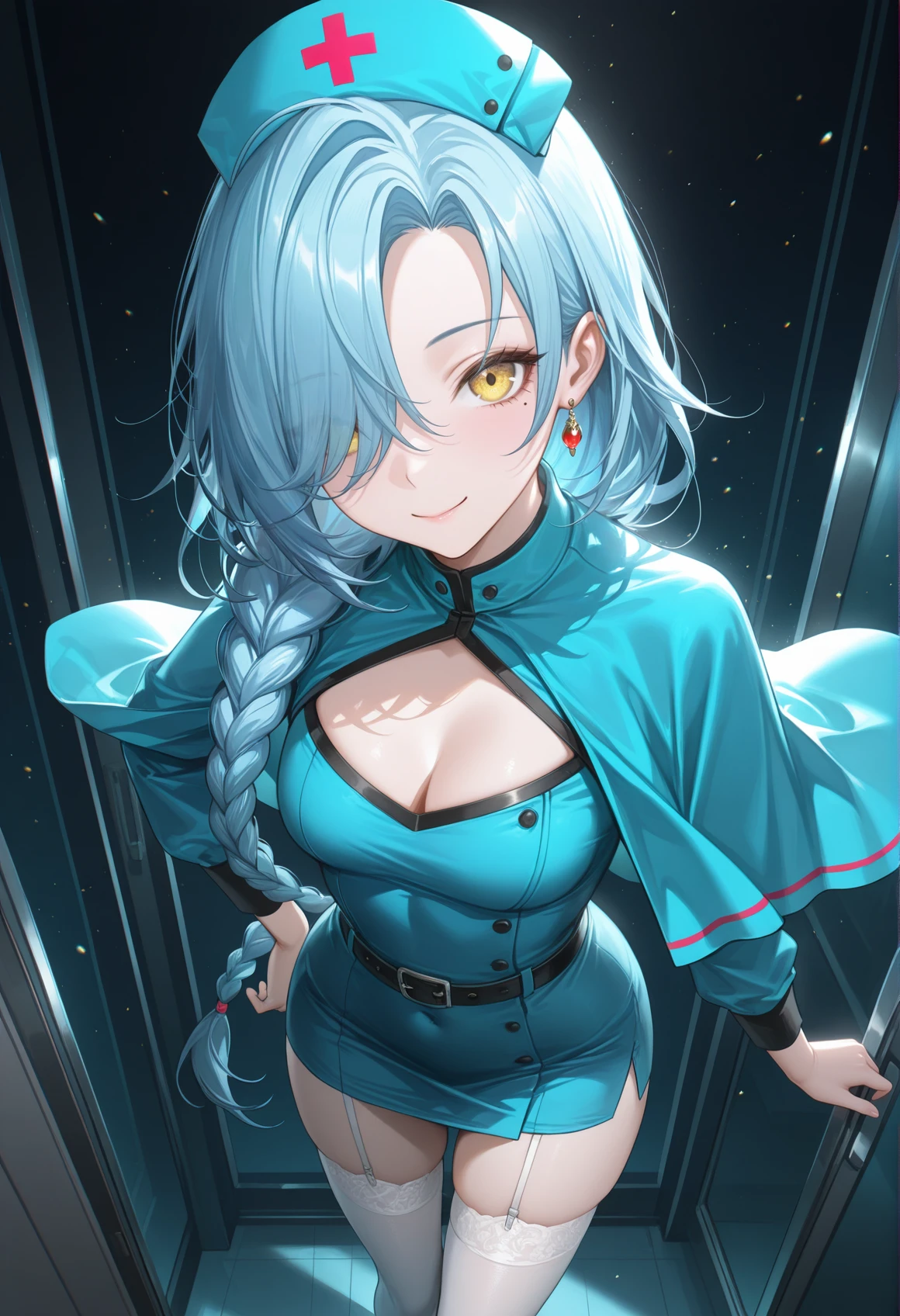 Tags标签 :zuisheng,hair over one eye,blue hair,long hair,mole under eye,yellow eyes,single braid,