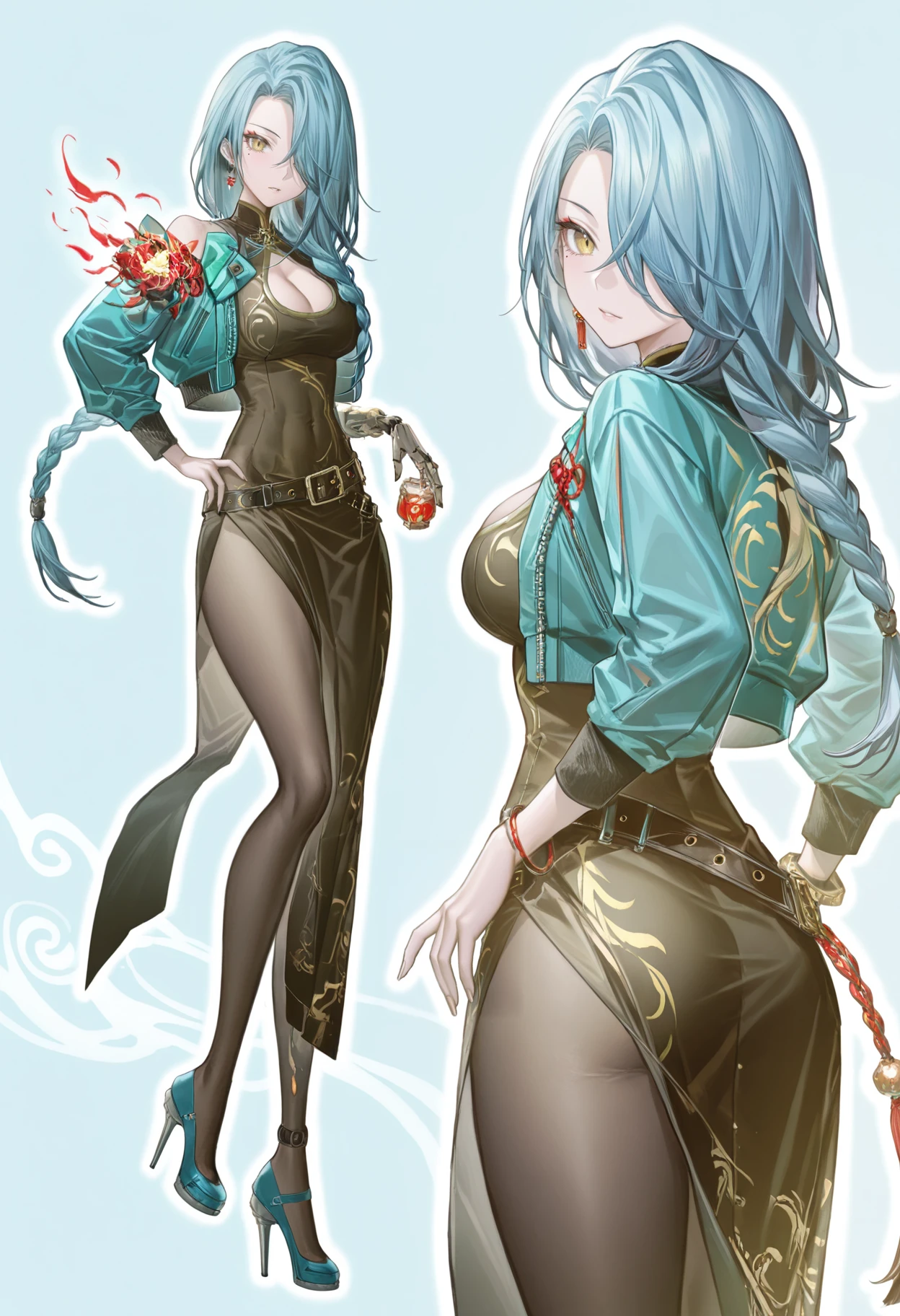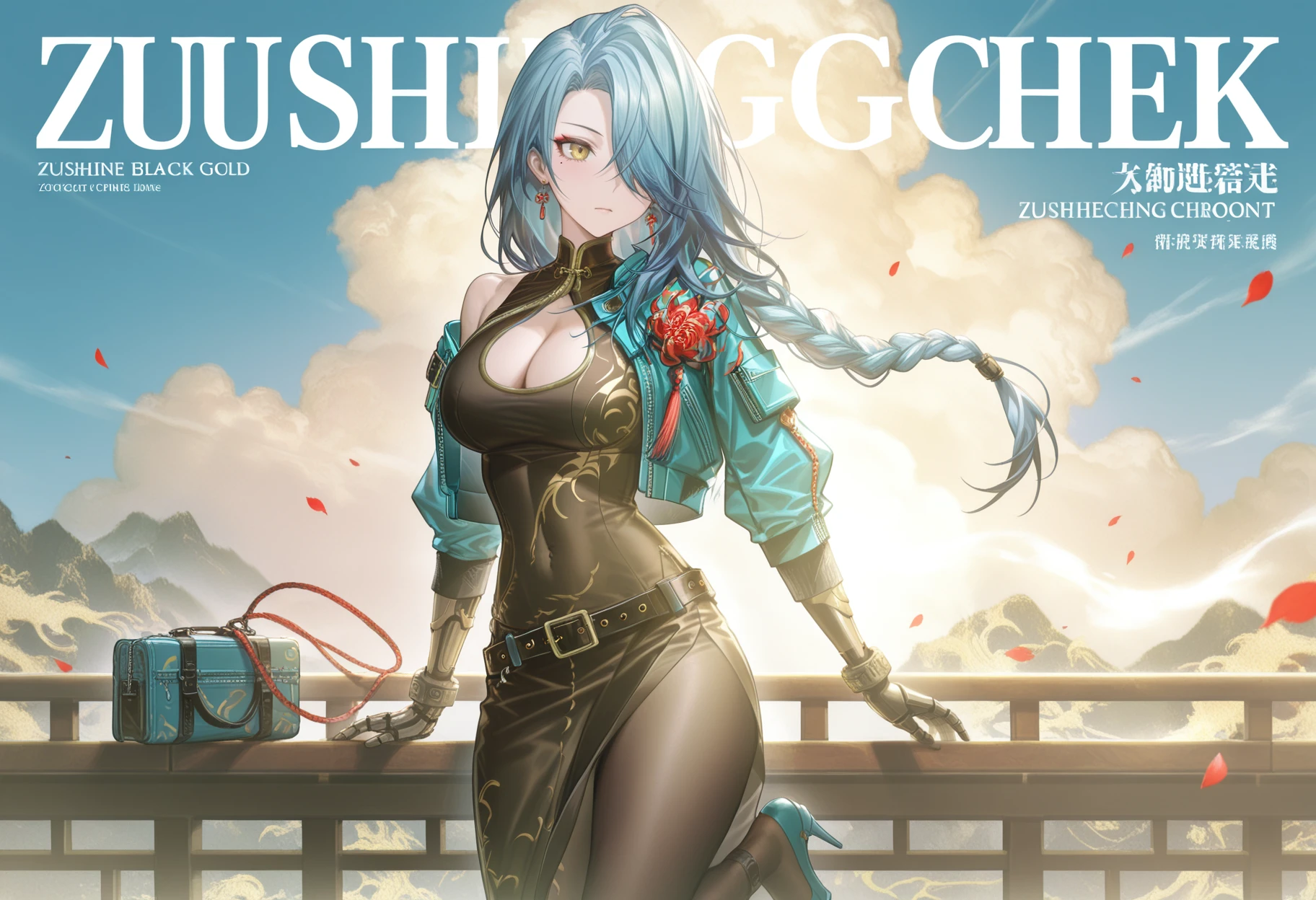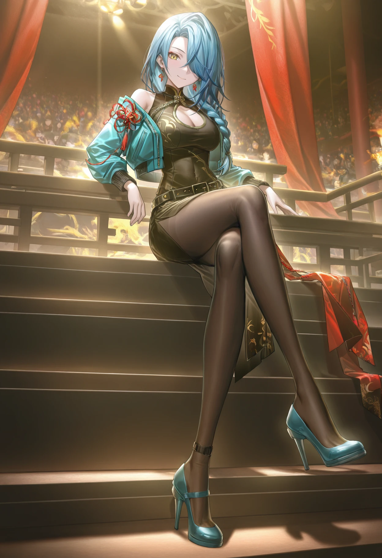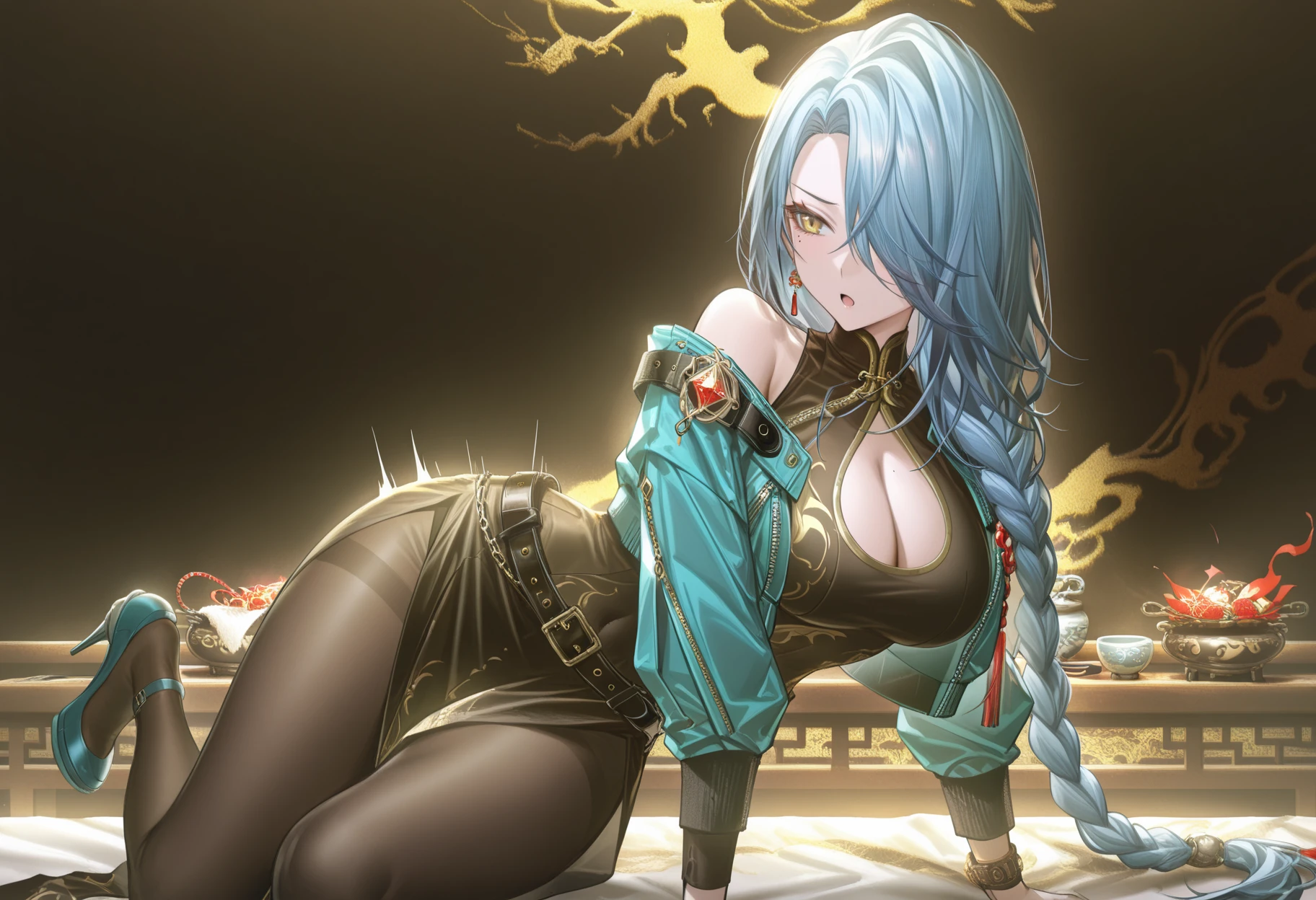 Optional clothing tags 可选衣服:zuisheng bare shoulders,zuisheng earrings,zuisheng jewelry,zuisheng tassel earrings,zuisheng black belt,zuisheng black cheongsam,zuisheng black pantyhose,zuisheng blue jacket,cleavage cutout,clothing cutout,zuisheng cropped jacket,zuisheng blue high heels,zuisheng open jacket,zuisheng gold-toned print,