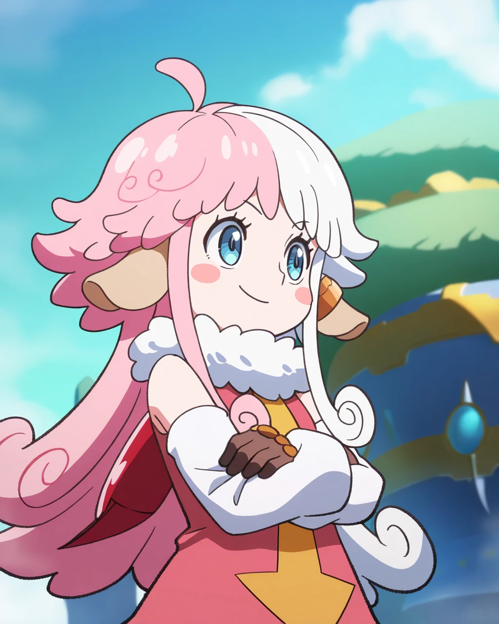 ,Atlas,1girl,pink hair, white hair, blue eyes, multicolored hair, animal ears,long hair,two-tone hair, gloves, blush stickers, necktie,detached sleeves, dress,