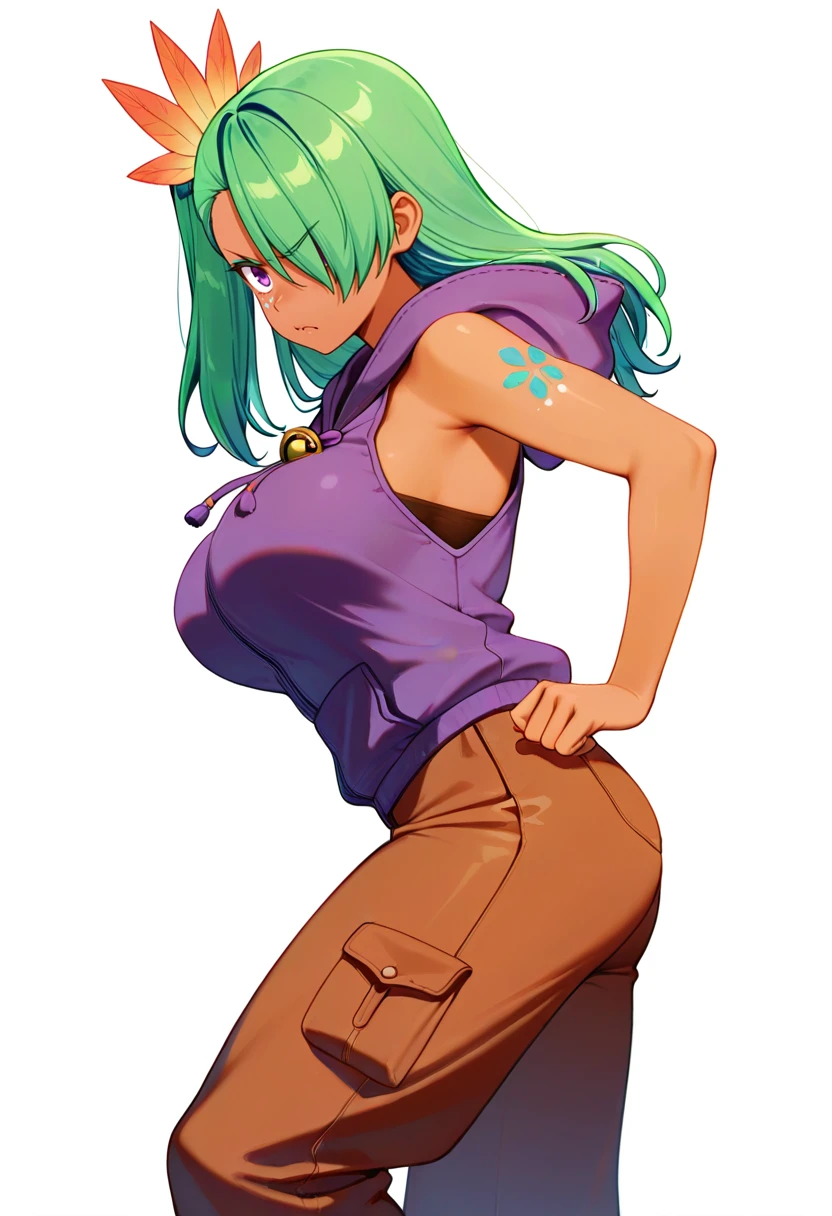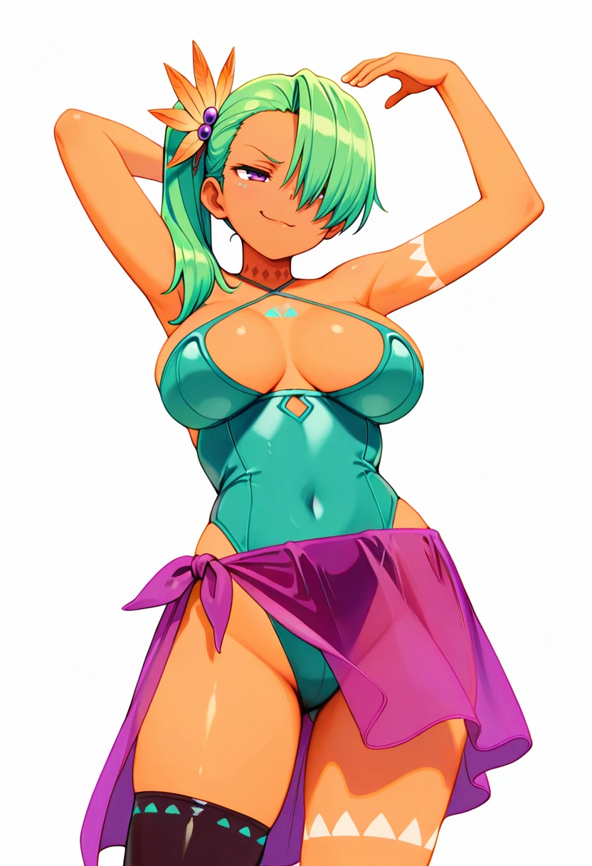 hunter_cnr, 1girl, long hair, green hair, dark-skinned female, large breasts, hair over one eye, purple eyes, tattoo, side ponytail,hair ornament, tattoo,