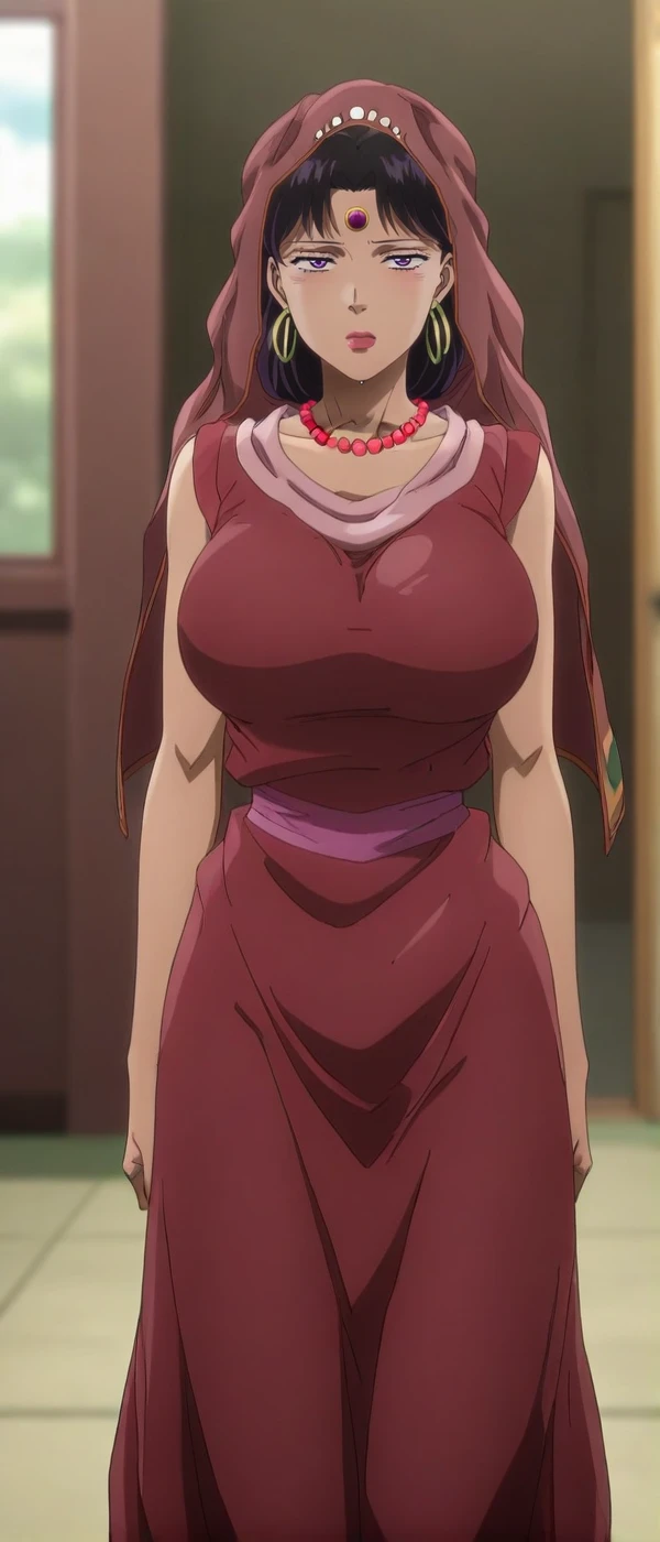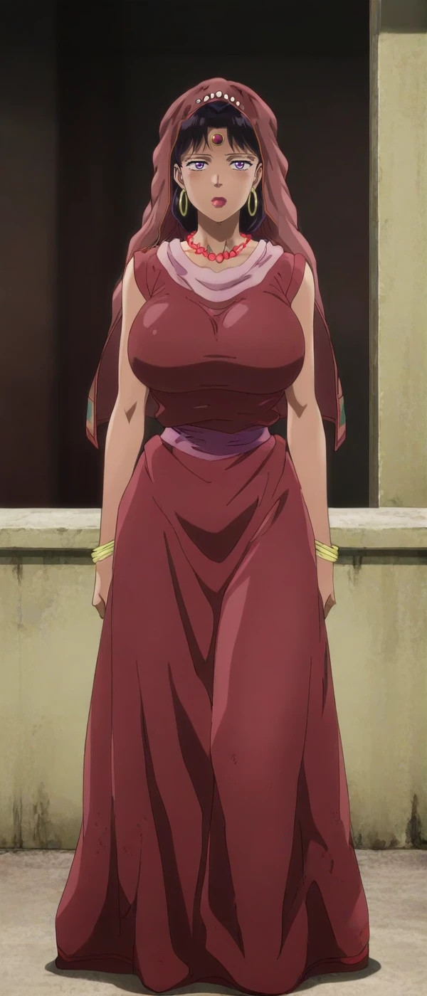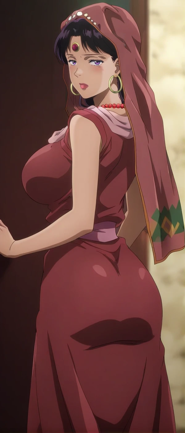 black hair, dark-skinned female, purple eyes, jewelry, hoop earrings , necklace, lipstick , veil
