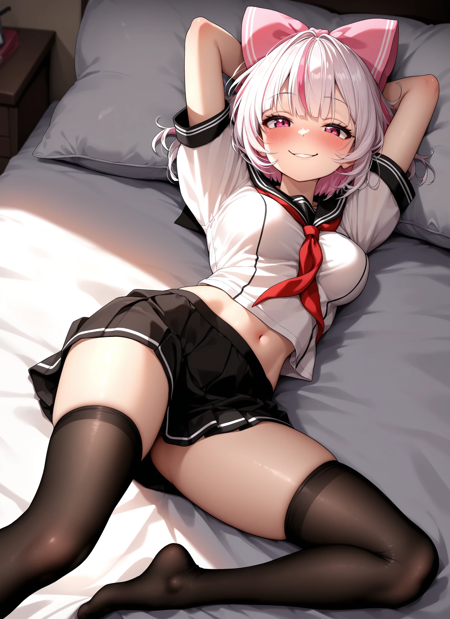 thighhighs, school uniform, shirt, serafuku, sailor collar, red neckerchief, white shirt, black thighhighs, short sleeves, red ribbon, neckerchief, hair ribbon, ribbon, pink ribbon, pink hairbow, black footwear, skirt,