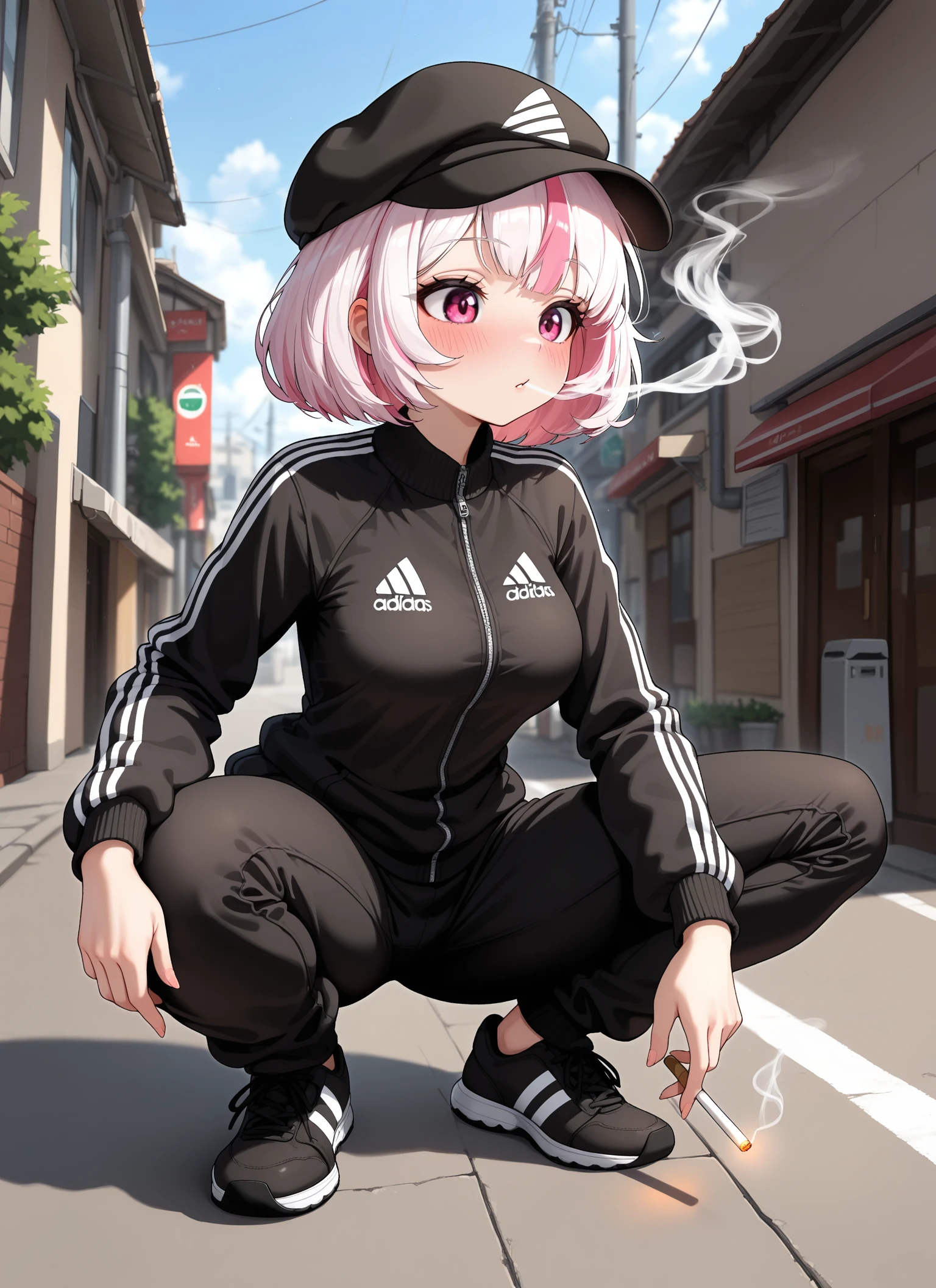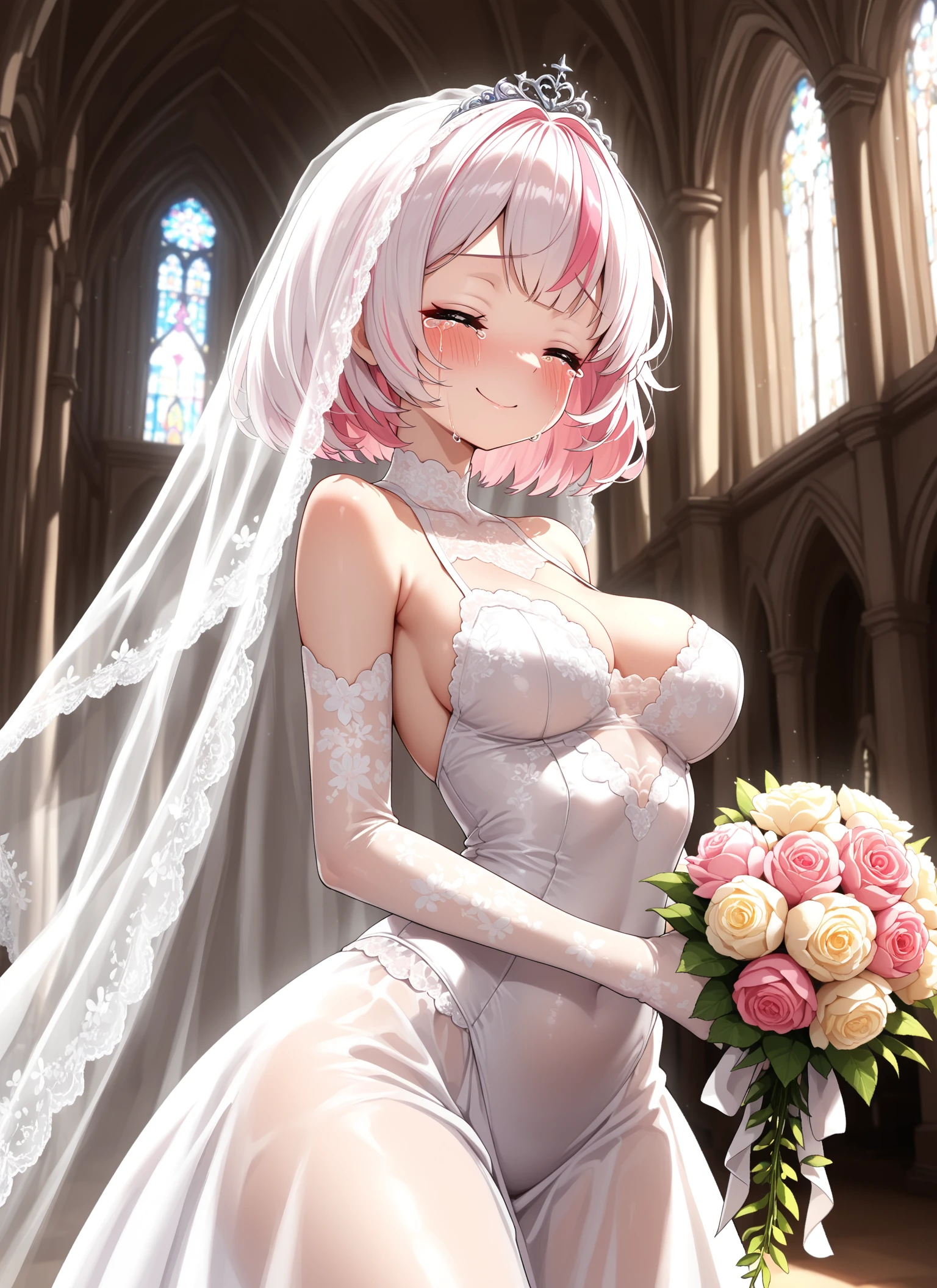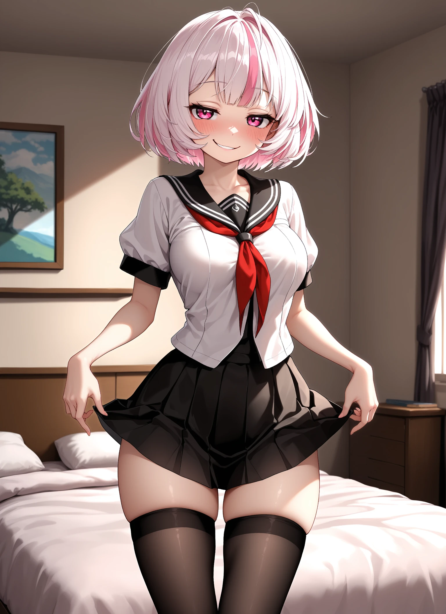 1girl, solo, Syahata, short hair, blush, multicolored hair, pink hair, white hair, bangs, streaked hair, pink eyes, medium breasts