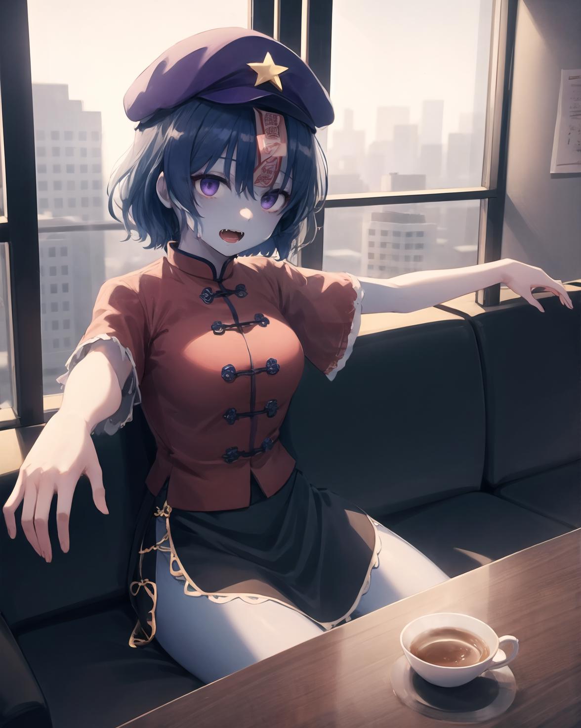 <lora:Yoshika:0.9>, Miyako Yoshika, (blue skin, purple skin:1.1), dark blue hair, purple eyes, medium breasts, zombie, jiangshi, undead