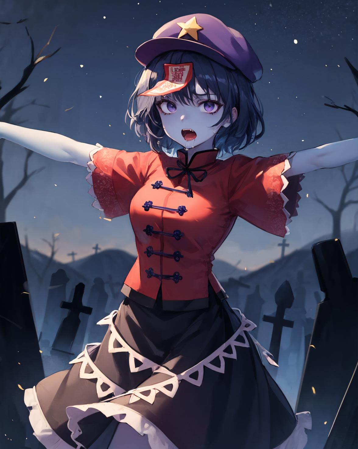 (purple headwear:1.1), yellow star ornament, ofuda on forehead, red shirt, short sleeves, black skirt with frills, tangzhuang, chinese clothes,Description